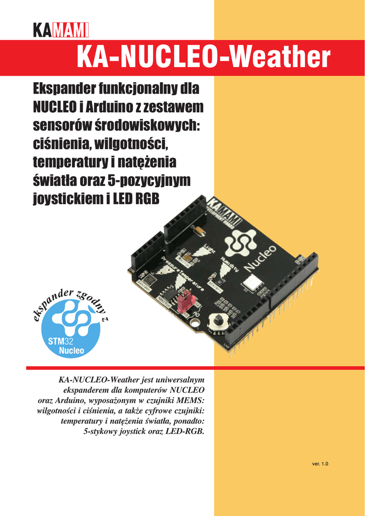 KA-NUCLEO-Weather Ekspander funkcjonalny dla NUCLEO i Arduino z zestawem sensorów środowiskowych: ciśnienia, wilgotności, temperatury i natężenia światła oraz 5-pozycyjnym joystickiem i LED RGB KA-NUCLEO-Weather jest uniwersalnym ekspanderem dla komputerów NUCLEO oraz Arduino, wyposażonym w czujniki MEMS: wilgotności i ciśnienia, a także cyfrowe czujniki: temperatury i natężenia światła, ponadto: 5-stykowy joystick oraz LED-RGB. ver. 1.0 KA-NUCLEO-Weather Podstawowe cechy i parametry ► Zgodność z systemem NUCLEO i Arudino ► Wbudowany sensor ciśnienia MEMS (LPS331) – Zakres pomiarowy 260 do 1260 mbar – Częstotliwość pomiarów (ODR) 1 Hz do 25 Hz – Rozdzielczość ADC 24 bity – Interfejs SPI/I2C (użyty I2C) ► Wbudowany sensor wilgotności MEMS (HTS221) – Zakres pomiarowy 0 to 100% (wilgotność względna) – Częstotliwość pomiarów (ODR) 1 do 12,5 Hz – Rozdzielczość ADC 16 bitów – Interfejs SPI/I2C (użyty I2C) ► Wbudowany cyfrowy sensor temperatury (STLM75) – Zakres pomiarowy –55°C do +125°C – Czas konwersji ADC <150 ms – Zintegrowany programowany termostat – Rozdzielczość ADC 9 bitów – Interfejs SMbus/I2C ► Wbudowany cyfrowy sensor natężenia oświetlenia ALS (TSL25721) – Charakterystyka czułości zbliżona od oka ludzkiego – Zintegrowane wzmacniacze analogowe o programowanym wzmocnieniu – Dwa kanały pomiarowe – Zintegrowany programowany komparator – Dynamika pomiaru 45000000:1 – Maksymalne natężenie światła 60000 lux – Rozdzielczość ADC 16 bitów ► Wbudowana LED RGB ► Wbudowany joystick 5-stykowy ► Przedłużone złącza szpilkowe Wyposażenie standardowe Kod KA-NUCLEO-Weather Opis Zmontowana i uruchomiona płytka BTC Korporacja 05-120 Legionowo ul. Lwowska 5 tel.: (22) 767-36-20 faks: (22) 767-36-33 e-mail: [email protected] http://www.kamami.pl Zastrzegamy prawo do wprowadzania zmian bez uprzedzenia. Oferowane przez nas płytki drukowane mogą się różnić od prezentowanej w dokumentacji, przy czym zmianom nie ulegają jej właściwości użytkowe. BTC Korporacja gwarantuje zgodność produktu ze specyfikacją. BTC Korporacja nie ponosi odpowiedzialności za jakiekolwiek szkody powstałe bezpośrednio lub pośrednio w wyniku użycia lub nieprawidłowego działania produktu. BTC Korporacja zastrzega sobie prawo do modyfikacji niniejszej dokumentacji bez uprzedzenia. http://www.kamami.pl/ 3 KA-NUCLEO-Weather Schemat elektryczny Widok płytki drukowanej http://www.kamami.pl/ 4 KA-NUCLEO-Weather Czujnik temperatury W ekspanderze zastosowano półprzewodnikowy czujnik temperatury STLM75 z wyjściem cyfrowym. Magistralę komunikacyjna czujnika temperatury dołączono do wspólnej (dla wszystkich sensorów) magistrali I2C. Linie komunikacyjne magistrali I2C są podciągnięte do plusa zasilania za pomocą rezystorów 4,7kΩ. Sposób dołączenia sensora temperatury do mikrokontrolera pokazano na schemacie. Linia STLM75 Nazwa linii GPIO w STM32 SCL D15 PB8 SDA D14 PB9 OS/INT D7 PA8 Interfejs STM32 Uwagi I2C1 Linie podciągnięte do plusa zasilania rezystorami 4,7 kW – Zwora JP1 umożliwia wybranie adresu bazowego układu STLM75 zgodnie z tabelą poniżej. Zwarte styki JP1 A0 Adres bazowy I2C 1-2 1 90h/91h 2-3 0 92h/93h http://www.kamami.pl/ 5 KA-NUCLEO-Weather Czujnik oświetlenia (ALS) Ekspander wyposażono w cyfrowy czujnik natężenia światła w otoczeniu TSL25721, wyposażony w interfejs komunikacyjny I2C. Magistralę komunikacyjną tego czujnika dołączono do wspólnej (dla wszystkich sensorów) magistrali I2C. Linie komunikacyjne magistrali I2C są podciągnięte do plusa zasilania za pomocą rezystorów 4,7kΩ. Sposób dołączenia sensora TSL25721 do mikrokontrolera pokazano na schemacie. Linia TSL25721 Nazwa linii GPIO w STM32 Interfejs STM32 Uwagi SCL D15 PB8 SCL/I2C1 SDA D14 PB9 SDA/I2C1 Linie podciągnięte do plusa zasilania rezystorami 4,7 kW INT A0 PA0 – – Sensor TSL25721 jest ulokowany na magistrali I2C pod adresami bazowymi 72h/73h. Czujnik wilgotności Ekspander wyposażono w cyfrowy czujnik wilgotności HTS221, wyposażony w interfejs komunikacyjny I2C. Magistralę komunikacyjną tego czujnika dołączono do wspólnej (dla wszystkich sensorów) magistrali I2C. Linie komunikacyjne magistrali I2C są podciągnięte do plusa zasilania za pomocą rezystorów 4,7kΩ. Sposób dołączenia sensora HTS221 do mikrokontrolera pokazano na schemacie. Linia HTS221 Nazwa linii GPIO w STM32 Interfejs STM32 Uwagi SCL D15 PB8 SCL/I2C1 SDA D14 PB9 SDA/I2C1 Linie podciągnięte do plusa zasilania rezystorami 4,7 kW DRDY D8 PA9 – – Sensor HTS221 jest ulokowany na magistrali I2C pod adresami bazowymi BEh/BFh. http://www.kamami.pl/ 6 KA-NUCLEO-Weather Czujnik ciśnienia Ekspander wyposażono w cyfrowy czujnik ciśnienia atmosferycznego LPS331, wykorzystujący interfejs komunikacyjny I2C. Magistralę komunikacyjną tego czujnika dołączono do wspólnej (dla wszystkich sensorów) magistrali I2C. Linie komunikacyjne magistrali I2C są podciągnięte do plusa zasilania za pomocą rezystorów 4,7kΩ. Wyjścia przerwań (INT1 i INT2) w czujniku LPS331 mogą pracować w trybie push-pull i nie wymagają podciągania do plusa zasilania. Sposób dołączenia sensora LPS331 do mikrokontrolera pokazano na schemacie. Linia LPS331 Nazwa linii GPIO w STM32 Interfejs STM32 Uwagi Linie podciągnięte do plusa zasilania rezystorami 4,7 kW SCL D15 PB8 SCL/I2C1 SDA D14 PB9 SDA/I2C1 INT1 A1 PA1 – INT2 A2 PA4 – Wyjścia powinny być skonfigurowane jako push-pull Sensor LPS331 jest ulokowany na magistrali I2C pod adresami bazowymi BAh/BBh. LED-RGB Wbudowane diody LED-RGB są sterowane bezpośrednio z linii GPIO mikrokontrolera zgodnie z tabelą poniżej. Diody świecą jeżeli na linii sterującej jest stan logiczny „0”. Dioda LED Nazwa linii GPIO w STM32 Red D12 PA6 Green D11 PA7 Blue A3 PB0 http://www.kamami.pl/ Uwagi LED świecą gdy stan na liniach GPIO jest „0” 7 KA-NUCLEO-Weather Joysti