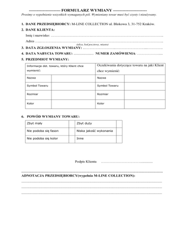 -------------------------- FORMULARZ WYMIANY ---------------------------Prosimy o wypełnienie wszystkich wymaganych pól. Wymieniany towar musi być czysty i nieużywany. 1. DANE PRZEDSIĘBIORCY: M-LINE COLLECTION ul. Blokowa 3, 31-752 Kraków. 2. DANE KLIENTA: Imię i nazwisko: …………………………….…………………………………….…………….. Adres …..………………………..…………..……………………………….………………….. (ulica, kod pocztowy, miasto) 3. DATA ZGŁOSZENIA WYMIANY: ..……………………..……………………...…………. 4. DATA NABYCIA TOWARU: ...................... NUMER ZAMÓWIENIA: ……………….... 5. PRZEDMIOT WYMIANY: Informacje dot. towaru, który Klient chce Oczekiwania dotyczące towaru na jaki Klient wymienić: chce wymienić: Nazwa Nazwa Symbol Towaru Symbol Towaru Rozmiar Rozmiar Kolor Kolor 6. POWÓD WYMIANY TOWARU: Zbyt mały Zbyt duży Nie podoba się fason Niska jakość wykonania Nie podoba się kolor Inne Podpis Klienta ……………………………............. --------------------------------------------------------------------------------------------------------------------ADNOTACJA PRZEDSIĘBIORCY(wypełnia M-LINE COLLECTION): ........................................................................................................................................................... ........................................................................................................................................................... ...........................................................................................................................................................