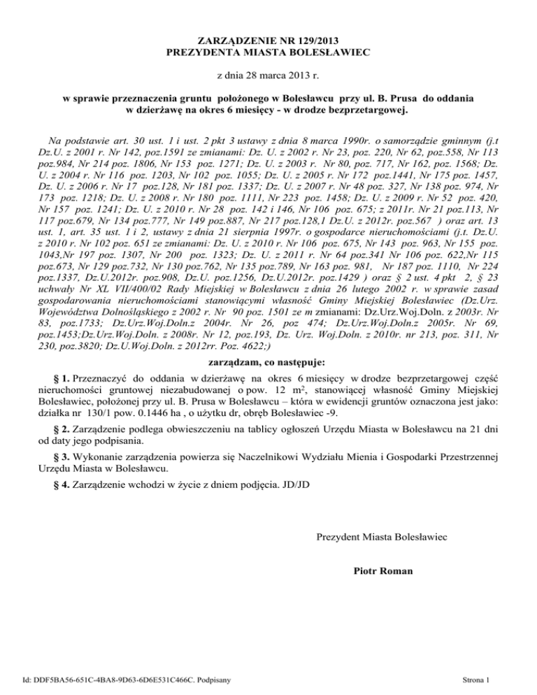 ZARZĄDZENIE NR 129/2013 PREZYDENTA MIASTA BOLESŁAWIEC z dnia 28 marca 2013 r. w sprawie przeznaczenia gruntu położonego w Bolesławcu przy ul. B. Prusa do oddania w dzierżawę na okres 6 miesięcy - w drodze bezprzetargowej. Na podstawie art. 30 ust. 1 i ust. 2 pkt 3 ustawy z dnia 8 marca 1990r. o samorządzie gminnym (j.t Dz.U. z 2001 r. Nr 142, poz.1591 ze zmianami: Dz. U. z 2002 r. Nr 23, poz. 220, Nr 62, poz.558, Nr 113 poz.984, Nr 214 poz. 1806, Nr 153 poz. 1271; Dz. U. z 2003 r. Nr 80, poz. 717, Nr 162, poz. 1568; Dz. U. z 2004 r. Nr 116 poz. 1203, Nr 102 poz. 1055; Dz. U. z 2005 r. Nr 172 poz.1441, Nr 175 poz. 1457, Dz. U. z 2006 r. Nr 17 poz.128, Nr 181 poz. 1337; Dz. U. z 2007 r. Nr 48 poz. 327, Nr 138 poz. 974, Nr 173 poz. 1218; Dz. U. z 2008 r. Nr 180 poz. 1111, Nr 223 poz. 1458; Dz. U. z 2009 r. Nr 52 poz. 420, Nr 157 poz. 1241; Dz. U. z 2010 r. Nr 28 poz. 142 i 146, Nr 106 poz. 675; z 2011r. Nr 21 poz.113, Nr 117 poz.679, Nr 134 poz.777, Nr 149 poz.887, Nr 217 poz.128,1 Dz.U. z 2012r. poz.567 ) oraz art. 13 ust. 1, art. 35 ust. 1 i 2, ustawy z dnia 21 sierpnia 1997r. o gospodarce nieruchomościami (j.t. Dz.U. z 2010 r. Nr 102 poz. 651 ze zmianami: Dz. U. z 2010 r. Nr 106 poz. 675, Nr 143 poz. 963, Nr 155 poz. 1043,Nr 197 poz. 1307, Nr 200 poz. 1323; Dz. U. z 2011 r. Nr 64 poz.341 Nr 106 poz. 622,Nr 115 poz.673, Nr 129 poz.732, Nr 130 poz.762, Nr 135 poz.789, Nr 163 poz. 981, Nr 187 poz. 1110, Nr 224 poz.1337, Dz.U.2012r. poz.908, Dz.U. poz.1256, Dz.U.2012r. poz.1429 ) oraz § 2 ust. 4 pkt 2, § 23 uchwały Nr XL VII/400/02 Rady Miejskiej w Bolesławcu z dnia 26 lutego 2002 r. w sprawie zasad gospodarowania nieruchomościami stanowiącymi własność Gminy Miejskiej Bolesławiec (Dz.Urz. Województwa Dolnośląskiego z 2002 r. Nr 90 poz. 1501 ze m zmianami: Dz.Urz.Woj.Doln. z 2003r. Nr 83, poz.1733; Dz.Urz.Woj.Doln.z 2004r. Nr 26, poz 474; Dz.Urz.Woj.Doln.z 2005r. Nr 69, poz.1453;Dz.Urz.Woj.Doln. z 2008r. Nr 12, poz.193, Dz. Urz. Woj.Doln. z 2010r. nr 213, poz. 311, Nr 230, poz.3820; Dz.U.Woj.Doln. z 2012rr. Poz. 4622;) zarządzam, co następuje: § 1. Przeznaczyć do oddania w dzierżawę na okres 6 miesięcy w drodze bezprzetargowej część nieruchomości gruntowej niezabudowanej o pow. 12 m2, stanowiącej własność Gminy Miejskiej Bolesławiec, położonej przy ul. B. Prusa w Bolesławcu – która w ewidencji gruntów oznaczona jest jako: działka nr 130/1 pow. 0.1446 ha , o użytku dr, obręb Bolesławiec -9. § 2. Zarządzenie podlega obwieszczeniu na tablicy ogłoszeń Urzędu Miasta w Bolesławcu na 21 dni od daty jego podpisania. § 3. Wykonanie zarządzenia powierza się Naczelnikowi Wydziału Mienia i Gospodarki Przestrzennej Urzędu Miasta w Bolesławcu. § 4. Zarządzenie wchodzi w życie z dniem podjęcia. JD/JD Prezydent Miasta Bolesławiec Piotr Roman Id: DDF5BA56-651C-4BA8-9D63-6D6E531C466C. Podpisany Strona 1 Załącznik Nr 1 do Zarządzenia Nr 129/2013 Prezydenta Miasta Bolesławiec z dnia 28 marca 2013 r. WYKAZ - OBWIESZCZENIE nieruchomości gruntowej położonej w Bolesławcu przeznaczonej do oddania w dzierżawę na okres 6 miesięcy – w drodze bezprzetargowej. Grunt położony przy ul. B. Prusa w Bolesławcu, część nieruchomości gruntowej 2 o pow. 12 m , stanowiący własność Gminy Miejskiej Bolesławiec, oznaczony w ewidencji gruntów jako działka nr 130/1 o pow. 0.1446 ha, o użytku – dr, obręb Bolesławiec - 9 , KW JG1B/00042136/8 - przeznacza się do oddania w dzierżawę w drodze bezprzetargowej na okres 6 miesięcy tj. od 01 .04.2013r. do 30.09.2013r. – z przeznaczeniem pod czasową lokalizację ogródka gastronomicznego lodziarni LODY AMERICANA przy ul. B. Prusa 24/25 w Bolesławcu. W miejscowym planie zagospodarowania przestrzennego miasta Bolesławca przedmiotowa nieruchomość położona jest na terenie usług publicznych, ulic dojazdowych (Symbol z planu – AKDd4). Miesięczny czynsz dzierżawny za okres 6 miesięcy za grunt pod ogródek gastronomiczny o pow. 12 m2 wyliczony został wg stawki 9,00 zł za/1 m2 /miesięcznie tj. 12 m2 x 9,00 zł = 108,00 zł + 24,84 zł /23% VAT = 132,84zł ( słownie: sto trzydzieści dwa zł i 84/100) – zgodnie § 1 ust.1, pkt 1.2 Zarządzenia nr 309/08 Prezydenta Miasta Bolesławiec z dnia 09 października 2008 r. w sprawie ustalenia wysokości minimalnych stawek czynszu dzierżawnego za grunty stanowiące własność Gminy Miejskiej Bolesławiec i płatny jest do 10 dnia każdego miesiąca na konto Gminy Miejskiej Bolesławiec Nr Powszechna Kasa Oszczędności Bank Polski S.A. O/ Bolesławiec Nr 98 1020-2137 0000 9002 0046 4230 lub bezpośrednio w kasie PKO BP/O Bolesławiec w Urzędzie Miasta / Rynek 41 – Ratusz/. JD/JD Prezydent Miasta Bolesławiec Piotr Roman Id: DDF5BA56-651C-4BA8-9D63-6D6E531C466C. Podpisany Strona 1 Id: DDF5BA56-651C-4BA8-9D63-6D6E531C466C. Podpisany Strona 3 Uzasadnienie Niniejsze zarządzenie wydaje się w celu umożliwienia wydzierżawienia gruntu w trybie bezprzetargowym na okres 6 miesięcy z części działki nr 130/1 położonej przy ul. Prusa z przeznaczeniem pod czasową lokalizację ogródka gastronomicznego lodziarni LODY AMERICANA przy ul. Prusa 24/25 / - złożonego na wniosek Dzierżawcy / MASTER ICE CREAM/ . Za okres 6 miesięcy dzierżawy pobrany zostanie czynsz dzierżawny zgodnie Zarządzeniem nr 309/08 Prezydenta Miasta Bolesławiec z dnia 09 października 2008 r. w sprawie ustalenia wysokości minimalnych stawek czynszu dzierżawnego za grunty stanowiące własność Gminy Miejskiej Bolesławiec. JD/JD Prezydent Miasta Bolesławiec Piotr Roman Id: DDF5BA56-651C-4BA8-9D63-6D6E531C466C. Podpisany Strona 1