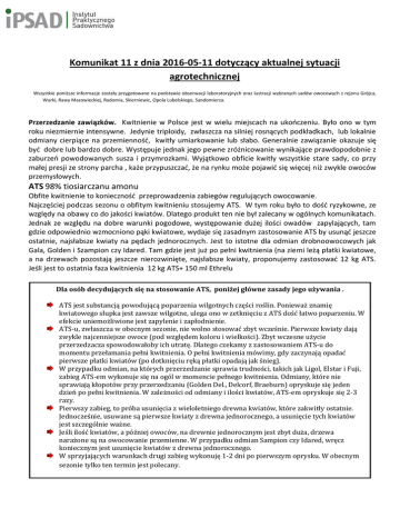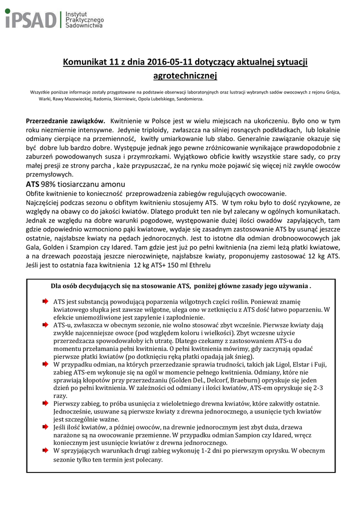 Komunikat 11 z dnia 2016-05-11 dotyczący aktualnej sytuacji agrotechnicznej Wszystkie poniższe informacje zostały przygotowane na podstawie obserwacji laboratoryjnych oraz lustracji wybranych sadów owocowych z rejonu Grójca, Warki, Rawy Mazowieckiej, Radomia, Skierniewic, Opola Lubelskiego, Sandomierza. Przerzedzanie zawiązków. Kwitnienie w Polsce jest w wielu miejscach na ukończeniu. Było ono w tym roku niezmiernie intensywne. Jedynie triploidy, zwłaszcza na silniej rosnących podkładkach, lub lokalnie odmiany cierpiące na przemienność, kwitły umiarkowanie lub słabo. Generalnie zawiązanie okazuje się być dobre lub bardzo dobre. Występuje jednak jego pewne zróżnicowanie wynikające prawdopodobnie z zaburzeń powodowanych susza i przymrozkami. Wyjątkowo obficie kwitły wszystkie stare sady, co przy małej presji ze strony parcha , każe przypuszczać, że na rynku może pojawić się więcej niż zwykle owoców przemysłowych. ATS 98% tiosiarczanu amonu Obfite kwitnienie to konieczność przeprowadzenia zabiegów regulujących owocowanie. Najczęściej podczas sezonu o obfitym kwitnieniu stosujemy ATS. W tym roku było to dość ryzykowne, ze względy na obawy co do jakości kwiatów. Dlatego produkt ten nie był zalecany w ogólnych komunikatach. Jednak ze względu na dobre warunki pogodowe, występowanie dużej ilości owadów zapylających, tam gdzie odpowiednio wzmocniono pąki kwiatowe, wydaje się zasadnym zastosowanie ATS by usunąć jeszcze ostatnie, najsłabsze kwiaty na pędach jednorocznych. Jest to istotne dla odmian drobnoowocowych jak Gala, Golden i Szampion czy Idared. Tam gdzie jest już po pełni kwitnienia (na ziemi leżą płatki kwiatowe, a na drzewach pozostają jeszcze nierozwinięte, najsłabsze kwiaty, proponujemy zastosować 12 kg ATS. Jeśli jest to ostatnia faza kwitnienia 12 kg ATS+ 150 ml Ethrelu Dla osób decydujących się na stosowanie ATS, poniżej główne zasady jego używania . ATS jest substancją powodującą poparzenia wilgotnych części roślin. Ponieważ znamię kwiatowego słupka jest zawsze wilgotne, ulega ono w zetknięciu z ATS dość łatwo poparzeniu. W efekcie uniemożliwione jest zapylenie i zapłodnienie. ATS-u, zwłaszcza w obecnym sezonie, nie wolno stosować zbyt wcześnie. Pierwsze kwiaty dają zwykle najcenniejsze owoce (pod względem koloru i wielkości). Zbyt wczesne użycie przerzedzacza spowodowałoby ich utratę. Dlatego czekamy z zastosowaniem ATS-u do momentu przełamania pełni kwitnienia. O pełni kwitnienia mówimy, gdy zaczynają opadać pierwsze płatki kwiatów (po dotknięciu ręką płatki opadają jak śnieg). W przypadku odmian, na których przerzedzanie sprawia trudności, takich jak Ligol, Elstar i Fuji, zabieg ATS-em wykonuje się na ogól w momencie pełnego kwitnienia. Odmiany, które nie sprawiają kłopotów przy przerzedzaniu (Golden Del., Delcorf, Braeburn) opryskuje się jeden dzień po pełni kwitnienia. W zależności od odmiany i ilości kwiatów, ATS-em opryskuje się 2-3 razy. Pierwszy zabieg, to próba usunięcia z wieloletniego drewna kwiatów, które zakwitły ostatnie. Jednocześnie, usuwane są pierwsze kwiaty z drewna jednorocznego, a usunięcie tych kwiatów jest szczególnie ważne. Jeśli ilość kwiatów, a później owoców, na drewnie jednorocznym jest zbyt duża, drzewa narażone są na owocowanie przemienne. W przypadku odmian Sampion czy Idared, wręcz koniecznym jest usunięcie kwiatów z drewna jednorocznego. W sprzyjających warunkach drugi zabieg wykonuję 1-2 dni po pierwszym oprysku. W obecnym sezonie tylko ten termin jest polecany. Stosując ATS należy pamiętać o następujących zasadach: Stosuj ATS tylko na suche drzewa, gdy nie zanosi się na deszcz. ATS można stosować od późnych godzin przedpołudniowych po wysuszeniu liści i pąków do ok. godz. 16:00. ATS najlepiej jest rozprowadzić w formie mgły, stosując bardzo małe ilości wody na hektar (250-300l/ha). Jedynie w bardzo suchy dzień można używać nieco więcej (400 litrów) wody na hektar. Dodaj fungicyd, np. Captan 80 WG w dawce 1 kg/ ha. Nie dodawaj zwilżaczy. Nie dodawaj innych środków lub nawozów dolistnych. Nie stosuj ATS-u przy wietrznej pogodzie Nie stosuj ATS-u na gruszach. Uwaga na znoszenie preparatu z wiatrem. Młode grusze mogą zostać silnie poparzone. Dla w pełni owocujących sadów, dawkowanie wynosi 5 kg/ha/każdy metr wysokości drzewa Na odmiany wrażliwe, takie jak Golden, Pinova, Braeburn i Delcorf (Celeste) trzeba użyć 5 kg/ha/każdy metr wysokości drzewa. Kwitnienie jabłoni w tym roku odbywało się w bardzo sprzyjających warunkach. Pojawiły się owady zapylające. ATS stosujemy by usunąć najsłabsze kwiaty, które rozwijają się jako ostatnie.. DirAmid/AmidThin, BA W okresie zróżnicowanego zawiązania, jakie wydaje się być w obecnym roku, najlepszymi do przerzedzania są produkty o selektywnym sposobie działania. Kiedyś był to karbaryl. Obecnie 1-naftyloacetamid (NAD) AmidThin jego odpowiednik DirAmid i benzyloadenina (BA) Paturyl. NAD (brak rejestracji do stosowania w Polsce). Jest to łagodnie działający, selektywny produkt regulujący ilość zawiązków na drzewie. NAD wpływa na zwiększenie konkurencyjności między zawiązkami. W efekcie tego działania w przypadku zbyt dużej ich liczby na drzewie najsłabsze „przegrywają” z silniejszymi i opadają. Jeśli zawiązków jest mniej, konkurencja między nimi jest o wiele słabsza i nie wpływa na redukcję ich ilości. Co więcej, są one wówczas nawet trwalej osadzone na pędach. NAD najefektywniej działa na odmianach triploidalnych, zwłaszcza z grupy Jonagolda. Dla odmian drobnoowocowych, szczególnie w roku silnego zawiązania, stosowanie NAD wymaga uzupełnienia poprzez późniejszy zabieg benzyloadeniną np. Paturylem. Ze względu na stosowanie w okresie przed pełnym wykształceniem się nasion w zawiązkach, NAD wpływa na ochronę przed przemiennym owocowaniem. Termin sto