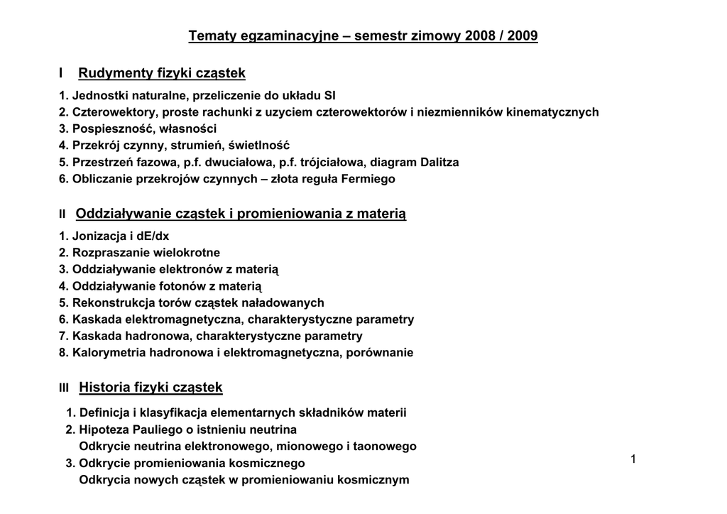 Tematy egzaminacyjne – semestr zimowy 2008 / 2009 I Rudymenty fizyki cząstek 1. Jednostki naturalne, przeliczenie do układu SI 2. Czterowektory, proste rachunki z uzyciem czterowektorów i niezmienników kinematycznych 3. Pospieszność, własności 4. Przekrój czynny, strumień, świetlność 5. Przestrzeń fazowa, p.f. dwuciałowa, p.f. trójciałowa, diagram Dalitza 6. Obliczanie przekrojów czynnych – złota reguła Fermiego II Oddziaływanie cząstek i promieniowania z materią 1. Jonizacja i dE/dx 2. Rozpraszanie wielokrotne 3. Oddziaływanie elektronów z materią 4. Oddziaływanie fotonów z materią 5. Rekonstrukcja torów cząstek naładowanych 6. Kaskada elektromagnetyczna, charakterystyczne parametry 7. Kaskada hadronowa, charakterystyczne parametry 8. Kalorymetria hadronowa i elektromagnetyczna, porównanie III Historia fizyki cząstek 1. Definicja i klasyfikacja elementarnych składników materii 2. Hipoteza Pauliego o istnieniu neutrina Odkrycie neutrina elektronowego, mionowego i taonowego 3. Odkrycie promieniowania kosmicznego Odkrycia nowych cząstek w promieniowaniu kosmicznym 1 4. Teoria sił jądrowych Yukawy Odkrycie mezonów π 5. Odkrycie cząstek dziwnych 6. Wielkie osiagnięcia teoretyczne – QED, model kwarków, teoria oddz. elektrosłabych, QCD Eksperymenty ważne dla rozwoju myśli teoretycznej 7. Odkrycie stanów mezonowych składajacych się z kwarków powabnych i pięknych IV Oddziaływania 1. Kwantowy obraz oddziaływań Zasięg oddziaływania 2. Oddziaływania silne, elektromagnetyczne i słabe – omówienie na podstawie prostych diagramów V Symetrie, prawa zachowania, liczby kwantowe 1. Związek między symetrią oddziaływań i prawami zachowania 2. Pojęcie obserwabli Warunki określające niezależność obserwabli od czasu 3. Rodzaje symetrii : ciągła, dyskretna ( przykłady ) przemienna, nieprzemienna 4. Zachowanie ładunku elektrycznego Związek między zachowaniem ładunku elektrycznego i globalną symetrią cechowania 5. Zachowanie liczby barionowej 6. Modele GUT i poszukiwania rozpadu protonu 7. Liczby leptonowe w Modelu Standardowym Wnioski z oscylacji zapachu neutrin 8. Moment pędu cząstki elementarnej : orbitalny moment pędu, spin, reguły kwantowania 2 9. Spin cząstki złożonej – moment pędu w modelu kwarkowym Spiny lekkich mezonów i barionów 10. Skrętność cząstki 11. Związek spinu ze statystyką 12. Transformacja przestrzennej inwersji współrzędnych - parzystość przestrzenna cząstek ( parzystość wewnętrzna, parzystość układu cząstek, parzystość mezonów i barionów ) 13. Transformacja sprzężenia ładunkowego - parzystość C - przykłady cząstek dla których jest zdefiniowana parzystość C ( parzystość ładunkowa fotonu, rozpady π0 na fotony ) - parzystość układu cząstek 14. Niezachowanie parzystości przestrzennej w rozpadzie β 15. Symetria CP - symetria względem CP w oddziaływaniach w silnych i elektromagnetycznych - odkrycie niezachowania CP 16. Symetria izospinowa oddziaływań silnych - symetria izospinowa przykładem symetrii przypadkowej - multiplety izospinowe ( przykłady dla mezonów i barionów ) 17. Parzystość G Reguły wyboru dla rezonansów mezonowych 18. Liczby kwantowe związane z zapachem kwarków ( przykłady diagramów kwarkowych: produkcja cząstek dziwnych w oddziaływaniach silnych, słabe rozpady cząstek dziwnych) 3 VI Hadrony i kwarki 1. Model kwarków - powstanie modelu kwarków - klasyfikacja hadronów ( mezonów i barionów ) w ramach zapachowej symetrii SU(3) 2. Hadrony, ich kwarkowa struktura – liczby kwantowe 3. Rezonanse - definicja - procesy formacji i produkcji rezonansów - krzywa Breita-Wignera 4. Rezonanse - formacja/rozpady rezonansów barionowych ∆ ( przykłady diagramów kwarkowych ) 5. Koncepcja koloru kwarków - własności symetrii funkcji falowej rezonansu ∆++ - uwięzienie koloru 6. Rezonanse - odkrycie mezonu wektorowego ω - formacja mezonów wektorowych w anihilacji e+e־ 7. Nonety lekkich mezonów pseudoskalarnych i wektorowych - skład, liczby kwantowe, mieszanie między stanami oktetowymi i singletowymi SU(3), mieszanie idealne 8. Multiplety lekkich barionów 9. Masy hadronów nierelatywistyczny model kwarków, rozszczepienie nadsubtelne, formuły masowe 10. Czarmonium 11. Bottomonium 12. Reguła OZI ( przykłady rozpadów rezonansów φ i ψ ) 4