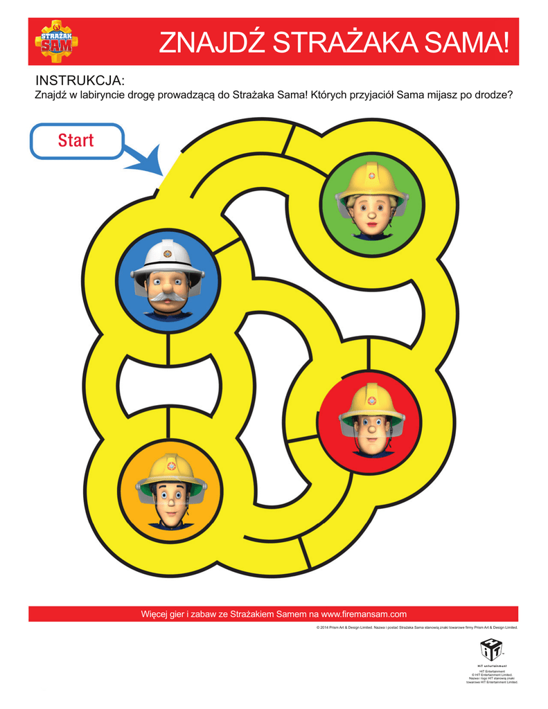 ZNAJDŹ STRAŻAKA SAMA! INSTRUKCJA: Znajdź w labiryncie drogę prowadzącą do Strażaka Sama! Których przyjaciół Sama mijasz po drodze? Start Więcej gier i zabaw ze Strażakiem Samem na www.firemansam.com © 2014 Prism Art & Design Limited. Nazwa i postać Strażaka Sama stanowią znaki towarowe firmy Prism Art & Design Limited. HiT Entertainment © HIT Entertainment Limited. Nazwa i logo HIT stanowią znaki towarowe HIT Entertainment Limited.