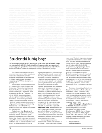 obejmującymi praktycznie wszystkie procesy przeróbki plastycznej. Jego szczególnym zainteresowaniem był proces wyciskania metali i stopów. Szczególnie należy przypomnieć wówczas nowatorskie prace nad zastosowaniem matryc mostkowych oraz eliminacji wciągów (wad wyrobów wyciskanych obniżających jakość i uzysk). W tym zakresie dorobek naukowy i praktyczny prof. Wantuchowskiego jest ogromny, z którego do dzisiaj korzystają Jego wychowankowie i jednocześnie współpracownicy. Był znakomitym nauczycielem i wykładowcą. Wszyscy słuchacze prof. Jerzego Wantuchowskiewgo – a zawsze był komplet słuchaczy – pamiętali starannie przygotowane i prowadzone wykłady z „Technologii i urządzeń do przeróbki plastycznej metali nieżelaznych”. Przekazywał ogromną ilość wiedzy z literatury i praktyki, dzieląc się własnym dorobkiem naukowym i doświadczeniem praktycznym. Wtedy nie było środków audiowizualnych, więc Profesor starannie i dokładnie wykonywał rysunki kolorowymi kredami na tablicy. Ponieważ pisał prawą i rysował lewą ręką a potem wszystko mazał oboma rękami, trudno było nadążyć. Każdy musiał przy egzaminie przedstawić swoje notatki, więc studenci po wykładach nawzajem sobie je uzupełniali (też na kolorowo). Ale to był dobry sposób na utrwalanie wiadomości. Egzamin u prof. Wantuchowskiego należał do bardzo trudnych, zdawało się „indywidualnie” i od każdego przez średnio dwie godziny skrupulatnie egzekwował wiadomości z wykładu przeglądając jego notatki. Czasem trzeba było przychodzić kilka razy, ale nie miał zwyczaju wpisywać ocen niedostatecznych. Z reguły były to oceny dobre i bardzo dobre. Był bardzo lubianym i szanowanym przez studentów nauczycielem akademickim, traktował ich z przyjaźnią (zresztą z wzajemnością). Pasją prof. Jerzego Wantuchowskiego były stare maszyny, motocykle i samochody. Lubił własnoręcznie przy nich „dłubać”, naprawiać, ulepszać i uruchamiać. Zaraz po wojnie kupił „na tandecie” najpierw motorower Sachs 100, Studentki lubią brąz W Częstochowie, odbyły się XXV Mistrzostwa Polski Politechnik, w których sukces odniosły siatkarki AZS AGH. Studentki zdobyły brązowy medal, czym powtórzyły swoje osiągnięcie sprzed roku. Krakowianek nie ominęły także laury indywidualne – Klaudia Góral (GiG) została uznana najlepiej broniącą zawodniczką turnieju. Do Częstochowy siatkarki wyruszały mocno zmotywowane i żądne rewanżu za nieznacznie przegrane tegoroczne rozgrywki Małopolskiej Ligi Akademickiej, w których to w końcowej klasyfikacji ustąpiły jedynie AWF i to różnicą ledwie jednego seta. Po losowaniu, do grupy eliminacyjnej C – razem z AGH – trafiły: Politechnika Krakowska, Politechnika Gdańska oraz Politechnika Rzeszowska. W pierwszym meczu „dziewczyny z Reymonta” łatwo pokonały przeciwniczki z Gdańska 2:0 (25:12 i 25:15), a w popołudniowej, „derbowej” konfrontacji z Politechniką Krakowską, nie pozostawiły rywalkom żadnych złudzeń, wygrywając partie do 18 i 20. W ostatnim pojedynku grupowym „Agieszanki” zmierzyły się z Politechniką Rzeszowską, a że historia lubi się powtarzać, stąd AGH wygrało to spotkanie 2:0 (25:15, 25:21). Podopieczne Iriny Bogdanovej z kompletem zwycięstw, awansowały do czołowej „ósemki” mistrzostw, gdzie pierwszy przeciwnikiem była Politechnika Radomska. Rywalki znacznie przewyższały ekipę AGH warunkami fizycznymi, niemniej na boisku liczy się przede wszystkim serce do gry. W pierwszym secie toczyła się 28 batalia o każdy punkt, a widzowie mogli oglądać przepiękne akcje w wykonaniu obu drużyn. W końcówce nieco więcej zimnej krwi zachowały zawodniczki z Radomia i wygrały seta 25:22. W drugiej partii krakowianki „złapały wiatr w żagle” i pokonały Radom 25:21. Do wyłonienia zwycięzcy potrzeba było tie-breka. Początek decydującego seta należał do radomianek, które przy zmianie stron prowadziły 8:5. Zawodniczki z AGH nie poddawały się jednak i doprowadziły do remisu 12:12. Następne dwa punkty zdobyły jednak przeciwniczki i to one właśnie miały piłkę meczową. Mecz wydawał się być rozstrzygnięty, niemniej AGH odrobiło straty i ostatecznie zwyciężyło 20:18, a tym samym całe spotkanie 2:1. „Każda z dziewczyn zasłużyła na pochwałę” – opowiada Magdalena Turek. „Kibice twierdzili, że było to najlepsze spotkanie mistrzostw, godne finału. Ostatni set był dla nich „wisienką na torcie. Po obydwu stronach siatki dawało się już zauważyć zmęczenie, jednak wiara w sukces ani na chwilę nie opuszczała żadnej z drużyn.” Jeszcze tego samego dnia reprezentantki AGH musiały zmierzyć się w półfinale z „mającą w nogach o jeden a potem motocykl DKW 125, które sam wyremontował, by potem jeździć wraz ze znajomymi (najczęściej „muszkieterami”) na wycieczki lub wakacje. W 1960 r. został właścicielem używanego starego samochodu, także wyremontowaną własnymi rękami „dekawką”. Nie tylko służyła Mu do wycieczek, gdy wyjeżdżał na delegacje stawała się samochodem służbowym. Potem gdy ten pojazd odmówił posłuszeństwa, Profesor przesiadł się na Mikrusa. W swoim mieszkaniu przy ul. Prądnickiej prof. Wantuchowski posiadał niewielki warsztat, w którym często „pomajsterkował”. Od czasu do czasu wieczorami grał na pianinie lub na banjo – będąc wielkim miłośnikiem jazzu. Zbierał też stare książki i inne pamiątki. W naszych sercach – wychowanków i współpracowników – Profesor Jerzy Wantuchowski pozostanie jako wybitny badacz, specjalista i dydaktyk, a przede wszystkim jako wspaniały Człowiek pod każdym względem. dr hab. inż. Jan Osika, prof. nadzw mecz mniej”, Politechniką Łódzką. Utrata sił w poprzednim dreszczowcu dała o sobie znać, choć woli walki krakowiankom nie można było odmówić. Spotkanie wygrały jednak łodzianki 2:0 (25:23, 28:2