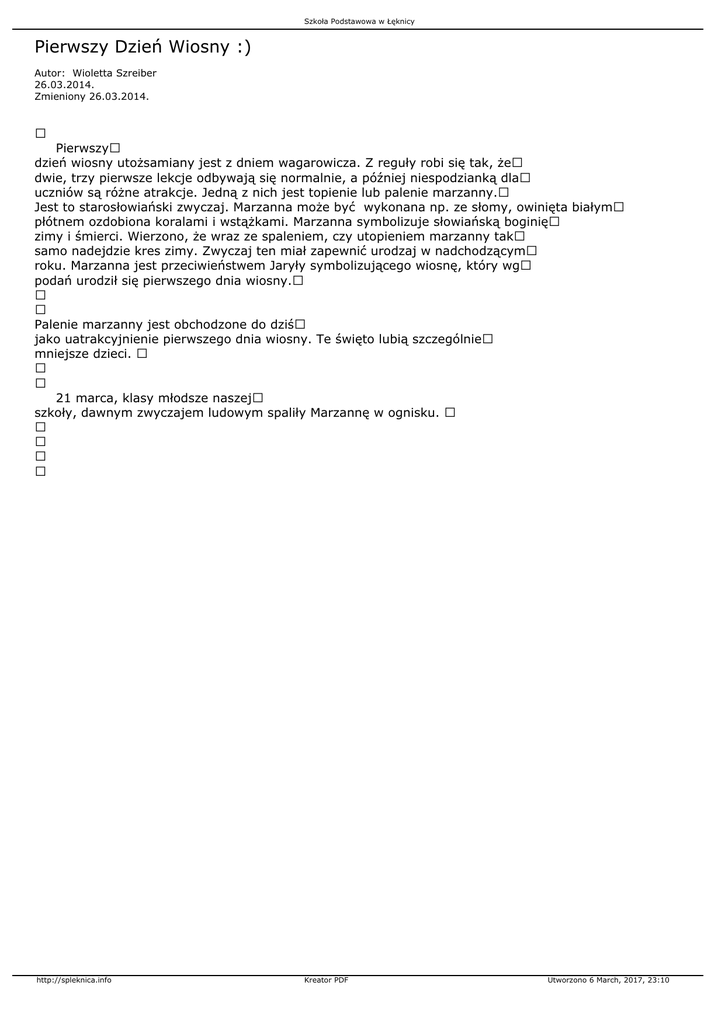 Szkoła Podstawowa w Łęknicy Pierwszy Dzień Wiosny :) Autor: Wioletta Szreiber 26.03.2014. Zmieniony 26.03.2014. Pierwszy dzień wiosny utożsamiany jest z dniem wagarowicza. Z reguły robi się tak, że dwie, trzy pierwsze lekcje odbywają się normalnie, a później niespodzianką dla uczniów są różne atrakcje. Jedną z nich jest topienie lub palenie marzanny. Jest to starosłowiański zwyczaj. Marzanna może być wykonana np. ze słomy, owinięta białym płótnem ozdobiona koralami i wstążkami. Marzanna symbolizuje słowiańską boginię zimy i śmierci. Wierzono, że wraz ze spaleniem, czy utopieniem marzanny tak samo nadejdzie kres zimy. Zwyczaj ten miał zapewnić urodzaj w nadchodzącym roku. Marzanna jest przeciwieństwem Jaryły symbolizującego wiosnę, który wg podań urodził się pierwszego dnia wiosny. Palenie marzanny jest obchodzone do dziś jako uatrakcyjnienie pierwszego dnia wiosny. Te święto lubią szczególnie mniejsze dzieci. 21 marca, klasy młodsze naszej szkoły, dawnym zwyczajem ludowym spaliły Marzannę w ognisku. http://spleknica.info Kreator PDF Utworzono 6 March, 2017, 23:10