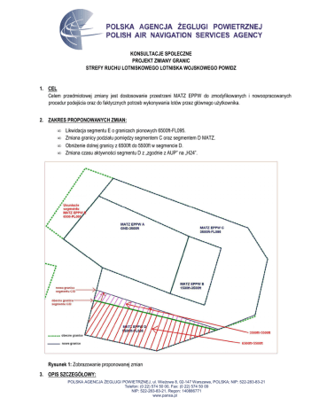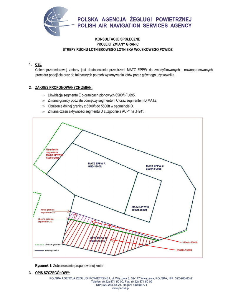 KONSULTACJE SPOŁECZNE PROJEKT ZMIANY GRANIC STREFY RUCHU LOTNISKOWEGO LOTNISKA WOJSKOWEGO POWIDZ 1. CEL Celem przedmiotowej zmiany jest dostosowanie przestrzeni MATZ EPPW do zmodyfikowanych i nowoopracowanych procedur podejścia oraz do faktycznych potrzeb wykonywania lotów przez głównego użytkownika. 2. ZAKRES PROPONOWANYCH ZMIAN: • • • • Likwidacja segmentu E o granicach pionowych 6500ft-FL095. Zmiana granicy podziału pomiędzy segmentem C oraz segmentem D MATZ. Obniżenie dolnej granicy z 6500ft do 5500ft w segmencie D. Zmiana czasu aktywności segmentu D z „zgodnie z AUP” na „H24”. Rysunek 1: Zobrazowanie proponowanej zmian 3. OPIS SZCZEGÓŁOWY: POLSKA AGENCJA ŻEGLUGI POWIETRZNEJ, ul. Wieżowa 8, 02-147 Warszawa, POLSKA; NIP: 522-283-83-21 Telefon: (0 22) 574 50 00, Fax: (0 22) 574 50 09 NIP: 522-283-83-21, Regon: 140886771 www.pansa.pl W chwili obecnej organizacja przestrzeni powietrznej w rejonie EPPW przedstawia się następująco: Rysunek 2: MATZ Powidz – stan obecny W związku z planowaną publikacją złożonego pakietu zmodyfikowanych oraz nowych procedur opracowanych przez stronę wojskową, obecne granice struktury MATZ zostały poddane szczegółowej analizie pod kątem zabezpieczenia procedur. W wyniku analizy stwierdzono, że z punktu widzenia zabezpieczenia przestrzenią MATZ instrumentalnych procedur dla lotniska EPPW, istnieje możliwość znacznego pomniejszenia granic dolnej przestrzeni zabezpieczającej zarówno segmenty początkowego podejścia każdej z procedur, segmenty missed approach jak i dolne wysokości holdingów. W wyniku analizy instrumentalnych procedur dla lotniska EPPW Ośrodek Planowania Strategicznego PAŻP opracował propozycję zmiany granic MATZ EPPW. Zobrazowanie graficzne zostało przedstawione poniżej. Rysunek 3: MATZ EPPW –granice opracowane przez OPS na potrzeby zabezpieczenia procedur przekazanych przez SSRL SZ RP. Podczas spotkania konsultacyjnego w którym udział wzięli przedstawiciele OPS, SSRL SZ RP, 33 Bazy Lotnictwa Transportowego (EPPW) oraz wojskowi kontrolerzy pełniący służbę ruchu lotniczego w oparciu o przepisy i procedury wojskowe na lotnisku Powidz, strona wojskowa jednoznacznie stwierdziła niemożność wprowadzenia powyższych granic struktury MATZ, gdyż propozycja ta ograniczała się do zabezpieczenia instrumentalnych procedur podejścia i nie uwzględniała faktycznych potrzeb wykonywania lotów z lotniska EPPW. Przedstawiciele strony wojskowej zaprezentowali stosowane przez nich techniki wektorowania a/c, zobrazowali sposób wykonywania dolotów i odlotów do/z EPPW oraz przekazali informacje o istniejących strefach pilotażu. Mając powyższe na uwadze, w wyniku konsultacji, strony ustaliły możliwość wprowadzenia zmian, które zostały zobrazowane w punkcie 2: • • • • likwidacja segmentu E o granicach pionowych 6500ft-FL095 (strona wojskowa potwierdziła, że nie ma potrzeby jego utrzymywania ze względu na jego niewykorzystywanie. W likwidowanym segmencie nie znajdują się instrumentalne procedury lotu dla EPPW); zmiana granicy pomiędzy segmentem C oraz segmentem D MATZ (strona wojskowa potwierdziła, że nie ma uzasadnienia operacyjnego na wysokość dolnej granicy 3500ft w części południowej segmentu C. Podniesienie w przedmiotowym rejonie granicy z 3500ft do 5500ft nie wpływa również na zabezpieczenie instrumentalnych procedur lotu dla EPPW); obniżenie górnej granicy z 6500ft do 5500ft w segmencie D (uzasadnienie – możliwość płynnego zniżania a/c przy dolotach do EPPW): Zmiana czasu aktywności segmentu D na H24. Propozycja nowej struktury MATZ EPPW stanowi kompromis pomiędzy niezbędną ilością przestrzeni wymaganej do zabezpieczenia procedur podejścia a faktycznymi potrzebami użytkownika wynikającymi z charakterystyki wykonywanych operacji na tym lotnisku. 5. KORZYŚCI I OGRANICZENIA WYNIKAJĄCE Z WPROWADZENIA PRZEDMIOTOWYCH ZMIAN: Cost Benefit Analysis POTENCJALNE ZYSKI Z1 Z2 Zwiększenie dostępności lotnictwa GA do przestrzeni klasy G poprzez usunięcie segmentu E MATZ oraz podniesienie w części obecnego segmentu C MATZ dolnej granicy z 3500ft do 5500ft Umożliwienie dolatującym od południa a/c do EPPW swobodniejszego, optymalnego profilu zniżania ASPEKT OPS/ EFF OPS/ EFF POTENCJALNE STRATY S1 Zmniejszenie dostępności lotnictwa GA do przestrzeni klasy G poprzez obniżenie dolnej granicy południowej części MATZ z 6500ft do 5500ft. ASPEKT EFF