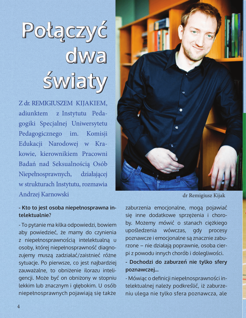 Połączyć dwa światy Z dr. REMIGIUSZEM KIJAKIEM, adiunktem z Instytutu Pedagogiki Specjalnej Uniwersytetu Pedagogicznego im. Komisji Edukacji Narodowej w Krakowie, kierownikiem Pracowni Badań nad Seksualnością Osób Niepełnosprawnych, działającej w strukturach Instytutu, rozmawia Andrzej Karnowski - Kto to jest osoba niepełnosprawna intelektualnie? - To pytanie ma kilka odpowiedzi, bowiem aby powiedzieć, że mamy do czynienia z niepełnosprawnością intelektualną u osoby, której niepełnosprawność diagnozujemy muszą zadziałać/zaistnieć różne sytuacje. Po pierwsze, co jest najbardziej zauważalne, to obniżenie ilorazu inteligencji. Może być on obniżony w stopniu lekkim lub znacznym i głębokim. U osób niepełnosprawnych pojawiają się także 4 dr Remigiusz Kijak zaburzenia emocjonalne, mogą pojawiać się inne dodatkowe sprzężenia i choroby. Możemy mówić o stanach ciężkiego upośledzenia wówczas, gdy procesy poznawcze i emocjonalne są znacznie zaburzone – nie działają poprawnie, osoba cierpi z powodu innych chorób i dolegliwości. - Dochodzi do zaburzeń nie tylko sfery poznawczej... - Mówiąc o definicji niepełnosprawności intelektualnej należy podkreślić, iż zaburzeniu ulega nie tylko sfera poznawcza, ale także zdolności komunikacyjne (sprawne posługiwanie się mową nie jest w pełni i w każdym przypadku możliwe – często zdarza się, iż komunikacja werbalna zaczyna być zastępowana komunikacją alternatywną – inną w stosunku do mowy słownej). Osoby te gorzej funkcjonują w relacjach społecznych i są mniej samodzielne życiowo, gorsze są zdolności samoobsługowe. Osoby niepełnosprawne intelektualnie wypadają słabiej niż pełnosprawni rówieśnicy w testach diagnostycznych (np. skali Monachij- ska Funkcjonalna Diagnostyka Rozwojowa, Skala umiejętności społecznych Gunzburga PAC). Oczywiście nie należy skupiać się tylko na brakach. Zadał pan pytanie kim jest osoba niepełnosprawna intelektualnie. Więc oprócz tego co powiedziałem wcześniej osoba ta może być genialnym artystą – mamy wielu artystów niepełnosprawnych intelektualnie, jednym z nich jest poznany przeze mnie w Pakówce Henryk Żarski zwany polskim Nikiforem – cudowne obrazy i przeogromna wrażliwość artystyczna. Wypracował własny styl, podąża za własnym wewnętrznym przeżyciem piękna, jego prace wystawiane są w miejskich galeriach. Inną poznaną przeze mnie artystką jest Dorota Bereska, pracująca w Małej Galerii Wielkich Pasji w Bytomiu: rewelacyjny styl – maluje szeregi małych domków ułożonych w figury geometryczne, kręgi i spirale – coś fantastycznego. Są przecież dobrzy sportowcy biorący udział w olimpiadach specjalnych – moim zdaniem lepsze byłyby sporty zunifikowane, ale może nie dojrzeliśmy, jako społeczeństwo, do takiej integracji. Są aktorzy, piosenkarze. Tak więc diagnoza niepełnosprawności, oprócz realnych ograniczeń, nie pozbawia człowieka jego autonomii i chęci uczestnictwa społecznego. Praca, życie codzienne wśród innych osób są w zasięgu ich możliwości. Należy znaleźć wspólną przestrzeń do spotkania. - Ile jest w Polsce takich osób? - Statystyka mówi o 3 milionach ludzi niepełnosprawnych, z czego 10 proc. to osoby niepełnosprawne intelektualnie. . 5 Jednak nie ma pełnych i dokładnych statystyk. W Polsce nie robi się już badań epidemiologicznych – na dużych grupach. Pedagogika specjalna nie interesuje się już tak bardzo liczbami, bo one nie mówią nic o człowieku – badania zmierzają ku poznaniu zjawisk i oczywiście prowadzi się badania diagnostyczne na większych grupach, ale ciekawe jest to, kim jest człowiek niepełnosprawny, ważny jest jego jednostkowy świat – to jest ciekawe poznanie człowieka. - Czy ludzie ci mają świadomość swojej niepełnosprawności? - To trudne pytanie, ale powiem prosto: mają, jeżeli wzrastają w otwartym i wrażliwym środowisku społecznym, pogodzonym z niepełnosprawnością; może inaczej - mających zgodę na życie z dzieckiem z niepełnosprawnością. Można latami zaprzeczać istnieniu niepełnosprawności u dziecka i w pewnym stopniu udaje się to niektórym. Pozwolenie jednak na rozmowę o niepełnosprawności – trudnej rozmowy – daje szanse na budowanie dobrej tożsamości siebie jako osoby pełnej z własnymi ograniczeniami. No skomplikowane są biografie tych ludzi, którzy całe życie żyli pod kloszem – ich rozczarowanie faktem trudności rozwojowych, jakie ich spotyka przecież codziennie jest trudne do ukrycia, jednak bez zewnętrznych kontaktów społecznych, bez narażania się na konfrontację z innymi można wzrastać w poczuciu nieświadomości siebie, ale na dłuższą metę jest to niemożliwe. - Obecnie osobom niepełnosprawnym 6 – jak się może wydawać – żyje się nieco lepiej niż jeszcze kilkadziesiąt lat temu... - O tak. Szczególnie zmienił się system wsparcia społecznego, złagodniały postawy społeczne względem osób niepełnosprawnych. Widok niepełnosprawnej osoby nie wzbudza już tylu emocji. Lepiej radzimy sobie w kontaktach z osobami niepełnosprawnymi. Niepełnosprawni pojawiają się w urzędach, na ulicach, w środkach komunikacji miejskiej. No jest lepiej. Przyczyniły się do tego liczne badania naukowe, prowadzone w różnych ośrodkach akademickich w Polsce. To efekt boomu na niepełnosprawność dr Remigiusz Kijak - zaryzykowałbym stwierdzeniem - mody na niepełnosprawność - dobrze być tolerancyjnym. Mówię o tym trochę prześmiewczo, ale i moda i media zarazem wykształciły pozytywny obraz niepełnosprawnego. Jeszcze 10 lat temu w mediach pojawiał się obraz niepełnosprawnego bohatera lub nieudacznika. Dziś mamy modelki niepełnosprawne, gwiazdy filmowe mające nie tylko jeden cel – rehabilitację. Mają szereg życiowych problemów, takich jak zakupy, rachunki... Pracują coraz więcej. Są aktywni w rożnego typu instytucjach. Zak