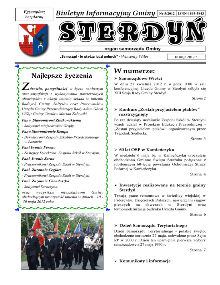 Egzemplarz bezpłatny Biuletyn Informacyjny Gminy Nr 5/2012 ISNN-1895-5843 STERDYÑ organ samorządu Gminy „Samorząd - to władza ludzi wolnych" - Wincenty Witos Najlepsze ¿yczenia Z drowia, pomyślności w Ŝyciu osobistym oraz satysfakcji z wykonywania powierzonych obowiązków z okazji imienin składa w imieniu Radnych Gminy, Sołtysów oraz Pracowników Urzędu Gminy Przewodniczący Rady Adam Góral i Wójt Gminy Czesław Marian Zalewski Panu Sławomirowi Złotkowskiemu - Sołtysowi miejscowości Grądy, Panu Słowomirowie Kempa - Dyrektorowi Zespołu Szkolno-Przedszkolnego w Łazowie, Pani Iwonie Ferenc - Zastępcy Dyrektora Zespołu Szkół w Sterdyni, Pani Iwonie Sarna - Pracownikowi Zespołu Szkół w Sterdyni, Pani Zuzannie Ceglarz - Pracownikowi Zespołu Szkół w Sterdyni, Pani Zuzannie Chendoszko - Sołtysowi Seroczyna oraz wszystkim mieszkańcom Gminy obchodzącym uroczystość imienin w dniach 10 30 maja 2012 roku.. 16 maja 2012 r. W numerze: Samorządowe Wieści W dniu 27 kwietnia 2012 r. o godz. 9.00 w sali konferencyjnej Urzędu Gminy w Sterdyni odbyła się XIII Sesja Rady Gminy Sterdyń. Strona 2 Konkurs „Zostań przyjacielem ptaków” rozstrzygnięty Po raz dziesiąty uczniowie Zespołu Szkół w Sterdyni wzięli udział w Projekcie Edukacji Przyrodniczej „Zostań przyjacielem ptaków” organizowanym przez Tygodnik Siedlecki. Strona 3 60 lat OSP w Kamieńczyku W niedzielę 6 maja br. w Kamieńczyku uroczyście obchodzono Gminne Święto StraŜaka połączone z jubileuszem 60-lecia powstania Ochotniczej StraŜy PoŜarnej w Kamieńczyku. Strona 4 Inwestycje realizowane na terenie gminy Sterdyń Trwają prace remontowe w świetlicy wiejskiej w Paderewku, Dzięciołach Dalszych, nawierzchni ciągów pieszych na skwerach w Sterdyni oraz termomodernizacja budynku Urzędu Gminy. Strona 6 Dzień Samorządu Terytorialnego Dzień Samorządu Terytorialnego - polskie święto, obchodzone corocznie 27 maja, uchwalone przez Sejm RP w 2000 r. Dzień ten upamiętnia pierwsze wybory samorządowe z 27 maja 1990 r. Strona 7 Komunikaty i informacje 2 Biuletyn Informacyjny Gminy STERDYŃ SAMORZĄDOWE WIEŚCI Gminy Sterdyń W dniu 27 kwietnia 2012 r. o godz. 9.00 w sali konferencyjnej Urzędu Gminy w Sterdyni odbyła się XIII Sesja Rady Gminy Sterdyń. Frekwencja radnych wynosiła 93,3%. Po przyjęciu porządku obrad Rada Gminy przyjęła następujące informacje oraz sprawozdania: - o ocenie zasobów pomocy społecznej dla Gminy Sterdyń, - o stanie bezpieczeństwa i porządku publicznego na terenie gminy Sterdyń w 2011 r. - z realizacji „Gminnego Programu Profilaktyki i Rozwiązywania Problemów Alkoholowych dla gminy Sterdyń za rok 2011”, - z realizacji „ Gminnego Programu Przeciwdziałania Narkomanii dla gminy Sterdyń za rok 2011”. Rada Gminy Sterdyń na sesji podjęła następujące uchwały: - w sprawie przystąpienia Gminy Sterdyń do projektu kluczowego realizowanego przez samorząd Województwa Mazowieckiego w ramach Regionalnego Programu Operacyjnego Województwa Mazowieckiego 2007 – 2013, działania II – Przyśpieszenie eRozwoju Mazowsza, poddziałania 2.2 Rozwój e-usług pn.: Rozwój e-usług i ich dostępu w ramach Mazowieckiej sieci Społeczeństwa Informacyjnego „M@zowszanie”. Rada Gminy Sterdyń zaakceptowała stanowisko Wójta Gminy dotyczące uczestnictwa Gminy w w/w projekcie przyjmując jednocześnie, Ŝe celami projektu są: 1) wytworzenie e-usług na platformie projektu; 2) utworzenie Mazowieckiej Sieci Społeczeństwa Informacyjnego „M@zowszanie” w ramach której, tworzone będą punkty umoŜliwiające mieszkańcom Gminy dostęp do komputera i Internetu; 3) aktywizacja obywateli oraz przedsiębiorców w procesach inwestycyjnych. - w sprawie przyjęcia programu opieki nad zwierzętami bezdomnymi oraz zapobieganie bezdomności zwierząt na terenie Gminy Sterdyń w 2012 roku. -w sprawie określenia przystanków komunikacyjnych na terenie gminy Sterdyń, warunków i zasad korzystania z tych przystanków. Warunki korzystania z przystanków. 1. Z przystanków komunikacyjnych korzystać mogą wyłącznie przewoźnicy będący operatorami publicznego transportu zbiorowego oraz przedsiębiorcy uprawnieni do prowadzenia działalności w zakresie przewozu osób zwani dalej przewoźnikami. 2.Udostępnienie operatorom lub przewoźnikom przystanków komunikacyjnych, których właścicielem lub zarządzającym jest Gmina Sterdyń, następuje na podstawie stosownej umowy zawartej pomiędzy operatorem lub przewoźnikiem, a Gminą Sterdyń. Zasady korzystania z przystanków 1.Operatorzy i przewoźnicy wykonujący przewozy w krajowym transporcie drogowym zobowiązani są do: 1) zatrzymywania pojazdu na początku zatoki przystankowej, a w przypadku jej braku w taki sposób, aby nie ograniczać przepustowości i nie blokować przystanku dla innych uŜytkowników, 2) podjeŜdŜania jak najbliŜej krawęŜnika celem umoŜliwienia wsiadania osobom starszym i niepełnosprawnym. 2. Zabrania się postoju ponad czas potrzebny do obsługi pasaŜerów. 3. Rozkłady jazdy środków transportu poszczególnych przedsiębiorców (operatorów i przewoźników) są podawane do publicznej wiadomości na wszystkich wymienionych w rozkładzie jazdy przystankach komunikacyjnych. KaŜdy rozkład jazdy zawiera nazwę operatora lub przewoźnika i ewentualnie jego logo. 4. Umieszczenie tablicy z rozkładem jazdy oraz jej utrzymanie w naleŜytym stanie technicznym naleŜy do przedsiębiorcy (operatora, przewoźnika). 5. Rozkład jazdy (wymiary tablicy, grafika, sposób montaŜu) podlega uzgodnieniu z Gminą Sterdyń. 6. Zabrania się umieszczania na przystankach innych informacji lub reklam niŜ te, które dotyczą rozkładu jazdy. 7. Rozkład jazdy uwzględnia wyłącznie przystanki komunikacyjne określone przez operatora lub przewoźnika. 8. Przedsiębiorca korzystający z przystanku zobowiązuje się do: - powiadamiania zarządzającego przystankami o zmianie rozkładu jaz