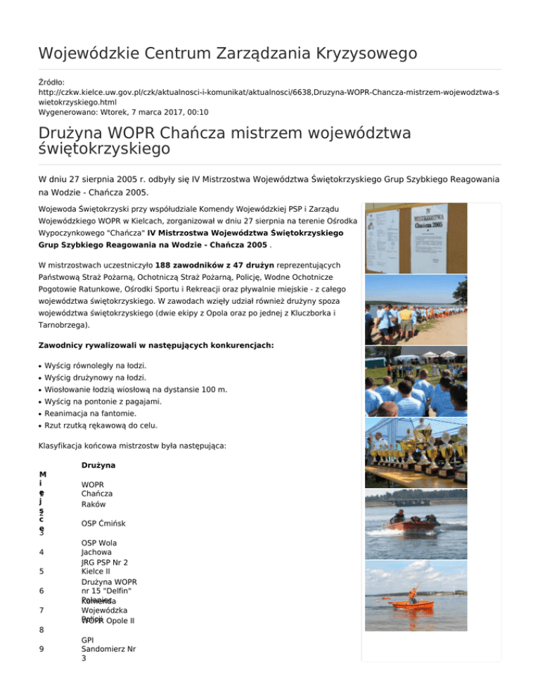 Wojewódzkie Centrum Zarządzania Kryzysowego Źródło: http://czkw.kielce.uw.gov.pl/czk/aktualnosci-i-komunikat/aktualnosci/6638,Druzyna-WOPR-Chancza-mistrzem-wojewodztwa-s wietokrzyskiego.html Wygenerowano: Wtorek, 7 marca 2017, 00:10 Drużyna WOPR Chańcza mistrzem województwa świętokrzyskiego W dniu 27 sierpnia 2005 r. odbyły się IV Mistrzostwa Województwa Świętokrzyskiego Grup Szybkiego Reagowania na Wodzie - Chańcza 2005. Wojewoda Świętokrzyski przy współudziale Komendy Wojewódzkiej PSP i Zarządu Wojewódzkiego WOPR w Kielcach, zorganizował w dniu 27 sierpnia na terenie Ośrodka Wypoczynkowego "Chańcza" IV Mistrzostwa Województwa Świętokrzyskiego Grup Szybkiego Reagowania na Wodzie - Chańcza 2005 . W mistrzostwach uczestniczyło 188 zawodników z 47 drużyn reprezentujących Państwową Straż Pożarną, Ochotniczą Straż Pożarną, Policję, Wodne Ochotnicze Pogotowie Ratunkowe, Ośrodki Sportu i Rekreacji oraz pływalnie miejskie - z całego województwa świętokrzyskiego. W zawodach wzięły udział również drużyny spoza województwa świętokrzyskiego (dwie ekipy z Opola oraz po jednej z Kluczborka i Tarnobrzega). Zawodnicy rywalizowali w następujących konkurencjach: ● Wyścig równoległy na łodzi. ● Wyścig drużynowy na łodzi. ● Wiosłowanie łodzią wiosłową na dystansie 100 m. ● Wyścig na pontonie z pagajami. ● Reanimacja na fantomie. ● Rzut rzutką rękawową do celu. Klasyfikacja końcowa mistrzostw była następująca: Drużyna M i e 1 j s 2 c e 3 4 5 6 7 WOPR Chańcza Raków OSP Ćmińsk OSP Wola Jachowa JRG PSP Nr 2 Kielce II Drużyna WOPR nr 15 "Delfin" Połaniec Komenda Wojewódzka Policji Opole II WOPR 8 9 GPI Sandomierz Nr 3 1 0 1 1 1 2 1 2 1 4 1 5 1 5 1 7 1 8 1 8 2 0 2 1 2 1 2 3 2 4 2 5 2 6 2 7 2 8 2 8 3 0 3 1 3 2 3 3 3 4 3 5 3 6 3 7 3 8 39 40 Drużyna Ratownictwa Wodnego JRG PSP Nr 2 Sedziszów Kielce I KP PSP Włoszczowa JRG PSP Nr 1 Kielce KP PSP Starachowice OSP Klimontów (SokołyRybitwy II) WOPR OSP Słupiec Junior OSP Śladków Mały Grupa Patrolowa-Inte rwencyjna Sandomierz OSP Klimontów GPI 2 (Sokoły) OSP Zdzieci Stare OSP Dwikozy KP PSP Pińczów KP PSP Jędrzejów OSP Daleszyce KP PSP Staszów WOPR Tarnobrzeg JRG PSP Sandomierz OSP Maśnik Grupa Patrolowa-Inte rwencyjna Sandomierz KP PSP GPI 1 Skarżysko Kamienna OSP Ruszcza Dziewczyny OSP Ruszcza 1 Seniorzy WOPR-OSP Ożarów WOPR Kluczbork JRG PSP Kazimierza Wielka KP PSP Końskie OSP Rudniki OSP Ruszcza 2 Młodzieżówka WOPR Sandomierz Pilkington II 40 OSP Tursko Małe 42 KP PSP Ostrowiec Świętokrzyski 42 WOPR Sandomierz Pilkington I 44 OSP Słupiec 45 WOPR Opole I 46 JRG PSP Opatów 47 KP PSP Busko Zdrój Drukuj Generuj PDF Powiadom znajomego Wstecz