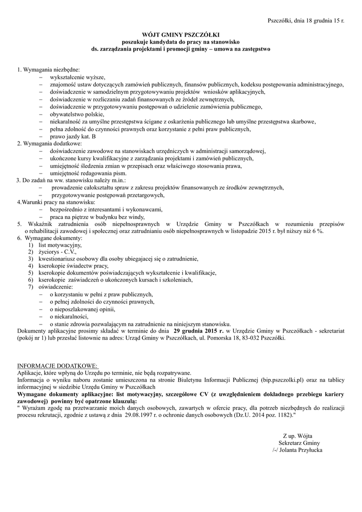 Pszczółki, dnia 18 grudnia 15 r. WÓJT GMINY PSZCZÓŁKI poszukuje kandydata do pracy na stanowisko ds. zarządzania projektami i promocji gminy – umowa na zastępstwo 1. Wymagania niezbędne: wykształcenie wyższe, znajomość ustaw dotyczących zamówień publicznych, finansów publicznych, kodeksu postępowania administracyjnego, doświadczenie w samodzielnym przygotowywaniu projektów wniosków aplikacyjnych, doświadczenie w rozliczaniu zadań finansowanych ze źródeł zewnętrznych, doświadczenie w przygotowywaniu postępowań o udzielenie zamówienia publicznego, obywatelstwo polskie, niekaralność za umyślne przestępstwa ścigane z oskarżenia publicznego lub umyślne przestępstwa skarbowe, pełna zdolność do czynności prawnych oraz korzystanie z pełni praw publicznych, prawo jazdy kat. B 2. Wymagania dodatkowe: doświadczenie zawodowe na stanowiskach urzędniczych w administracji samorządowej, ukończone kursy kwalifikacyjne z zarządzania projektami i zamówień publicznych, umiejętność śledzenia zmian w przepisach oraz właściwego stosowania prawa, umiejętność redagowania pism. 3. Do zadań na ww. stanowisku należy m.in.: prowadzenie całokształtu spraw z zakresu projektów finansowanych ze środków zewnętrznych, przygotowywanie postępowań przetargowych, 4.Warunki pracy na stanowisku: bezpośrednio z interesantami i wykonawcami, praca na piętrze w budynku bez windy, 5. Wskaźnik zatrudnienia osób niepełnosprawnych w Urzędzie Gminy w Pszczółkach w rozumieniu przepisów o rehabilitacji zawodowej i społecznej oraz zatrudnianiu osób niepełnosprawnych w listopadzie 2015 r. był niższy niż 6 %. 6. Wymagane dokumenty: 1) list motywacyjny, 2) życiorys - C.V., 3) kwestionariusz osobowy dla osoby ubiegajacej się o zatrudnienie, 4) kserokopie świadectw pracy, 5) kserokopie dokumentów poświadczających wykształcenie i kwalifikacje, 6) kserokopie zaświadczeń o ukończonych kursach i szkoleniach, 7) oświadczenie: o korzystaniu w pełni z praw publicznych, o pełnej zdolności do czynności prawnych, o nieposzlakowanej opinii, o niekaralności, o stanie zdrowia pozwalającym na zatrudnienie na niniejszym stanowisku. Dokumenty aplikacyjne prosimy składać w terminie do dnia 29 grudnia 2015 r. w Urzędzie Gminy w Pszczółkach - sekretariat (pokój nr 1) lub przesłać listownie na adres: Urząd Gminy w Pszczółkach, ul. Pomorska 18, 83-032 Pszczółki. INFORMACJE DODATKOWE: Aplikacje, które wpłyną do Urzędu po terminie, nie będą rozpatrywane. Informacja o wyniku naboru zostanie umieszczona na stronie Biuletynu Informacji Publicznej (bip.pszczolki.pl) oraz na tablicy informacyjnej w siedzibie Urzędu Gminy w Pszczółkach Wymagane dokumenty aplikacyjne: list motywacyjny, szczegółowe CV (z uwzględnieniem dokładnego przebiegu kariery zawodowej) powinny być opatrzone klauzulą: " Wyrażam zgodę na przetwarzanie moich danych osobowych, zawartych w ofercie pracy, dla potrzeb niezbędnych do realizacji procesu rekrutacji, zgodnie z ustawą z dnia 29.08.1997 r. o ochronie danych osobowych (Dz.U. 2014 poz. 1182)." Z up. Wójta Sekretarz Gminy /-/ Jolanta Przyłucka