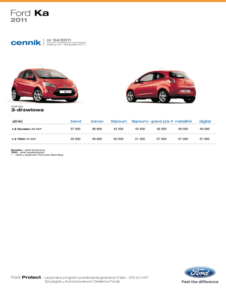 Ford Ka 2011 cennik nr 04/2011 wa˝ny od 7 listopada 2011 r. wersja 3-drzwiowa silniki trend trend+ titanium 1.2 Duratec 69 KM* 37 000 38 800 42 200 43 400 49 500 49 000 49 000 1.3 TDCi 75 KM* 45 000 46 800 50 200 51 400 57 500 57 000 57 000 titanium+ grand prix II metalKA Duratec - silnik benzynowy TDCi - silnik wysokopr´˝ny * - silnik z systemem Ford Auto-Start-Stop Ford Protect – opcjonalny program przed∏u˝enia gwarancji 3 lata – 400 z∏ z VAT Szczegó∏y u Autoryzowanych Dealerów Forda digital Ford Ka 2011 wyposa˝enie bezpieczeƒstwo nd tre Uk∏ad przeciwblokujàcy (ABS) z elektronicznym systemem podzia∏u si∏y hamowania (EBD) oraz uk∏adem wsomagajàcym awaryjne hamowanie (EBA) Poduszki powietrzne – poduszki czo∏owe kierowcy i pasa˝era z przodu Boczne poduszki powietrzne Przednie Êwiat∏a przeciwmgielne Wycieraczki przedniej szyby o pr´dkoÊci pracy dostosowujàcej si´ do pr´dkoÊci jazdy Elektroniczny uk∏ad stabilizacji toru jazdy (ESP) wraz z uk∏adem wspomagania awaryjnego hamowania (EBA) oraz systemem u∏atwiajàcym ruszanie z miejsca na wzniesieniach (HSA) 2 + nd tre II + l m rix m lKA u p ta i u i a n t d n igi a e n a t d i t a t m ti gr s s s s s s s s – – s s – s s s s s s s s s s s s s s s s s s s s s s 2 000 2 000 2 000 2 000 2 000 2 000 s – s s s s s s s s s s s s – s s s – s – – – – – – – s – p – p – p – p – s 900 p – s 900 p s s 900 p – s 900 p – s 900 p – – 40 – – 40 – s 40 s s 40 s s 40 s s 40 s s 40 s s s s s s s s – s s s s s s s s s s s s p p s s s s s 100 s 100 s 100 s 100 s 100 s 100 s 100 s 000 komfort Elektryczny uk∏ad wspomagania kierownicy Elektrycznie sterowane szyby przednich drzwi Elektrycznie sterowane i podgrzewane lusterka boczne, obudowy w kolorze nadwozia Elektrycznie sterowane i podgrzewane lusterka boczne, obudowy w kontrastujàcym kolorze Elektrycznie sterowane i podgrzewane lusterka boczne, obudowy w kolorze Carbon Fibre Klimatyzacja manualna Klimatyzacja z automatycznà regulacjà temperatury Podgrzewana przednia szyba Kierownica pokryta skórà dla Grand Prix II, Digital, Metal KA w unikalnym wykoƒczeniu. Dywaniki welurowe z przodu i z ty∏u Pakiet dla palàcych Dodatkowa elektryczna nagrzewnica wn´trza PTC (tylko do silników wysokopr´˝nych) zabezpieczenia Elektroniczny immobilizer Centralny zamek sterowany pilotem systemy audio i nawigacji Radioodbiornik z odtwarzaczem p∏yt CD/MP3, 6 g∏oÊników, gniazdo AUX–IN do pod∏àczania zewn´trznych odtwarzaczy elementy funkcjonalne Ko∏o zapasowe dojazdowe mini (zamiast zestawu do naprawy ogumienia) Zestaw do naprawy ogumienia s – wyposa˝enie standardowe – – opcja niedost´pna p – opcja dost´pna tylko w pakiecie Ford Ka 2011 wyposa˝enie stylizacja nd tre Lakier niemetalizowany bia∏y – Crystal White 500 Lakier metalik 1 300 Lakier specjalny – Piste – Lakier specjalny – Blush – Tylny spoiler – Przyciemniane szyby tylnej cz´Êci przedzia∏u pasa˝erskiego – Dach panoramiczny z filtrem przeciws∏onecznym oraz boczne kurtyny powietrzne – Logo KA z wykoƒczeniem chromowanym na s∏upku B – 14” obr´cze stalowe, ko∏paki (wzór 6–ramienny) s 15” obr´cze stalowe, ko∏paki (wzór 10–ramienny) – 15” obr´cze ze stopów lekkich (wzór 13–ramienny) – 16” obr´cze ze stopów lekkich (wzór 5x2–ramienny) – 16” obr´cze ze stopów lekkich (wzór 5x2–ramienny) black – + nd tre II + l m rix m lKA u p ta i u i a n t d n igi a e n a t d i t a t m ti gr 500 1 300 – – – 500 1 300 1 950 1 950 – 500 1 300 1 950 1 950 – 500 1 300 1 950 – s – 1 300 – – – 500 1 300 1 950 – – – s s s s s – – s – – – – 2 200 – – s – – – 2 200 s – – s – – 2 200 – – – – – s 2 200 s – – – s – 2 200 – – – – s – pakiety wyposa˝enia dodatkowego Indywidualny pakiet stylizacji nadwozia „Digital” – obr´cze ze stopów lekkich 16”, zestaw folii na nadwozie z motywami „Digital”, obramowanie przedniej kraty wlotu powietrza oraz obudowy lusterek bocznych lakierowane w kolorze Jump, chromowana koƒcówka rury wydechowej – Indywidualny pakiet wykoƒczenia wn´trza „Digital” – tapicerka foteli i wykoƒczenia wewn. wyk∏adzin drzwi z oryginalnymi motywami „Digital”, lakierowane elementy wykoƒczenia wn´trza (wewn. uchwyty drzwi, obramowanie postumentu dêwigni zmiany biegów, obramowania centralnej konsoli, obramowania dysz nawiewu, obramowanie zespo∏u wskaêników), welurowe dywaniki pod∏ogowe z kolorowymi szwami, kierownica pokryta barwnà skórà, barwny uchwyt dêwigni zmiany biegów, barwna oprawa dêwigni hamulca r´cznego – Indywidualny pakiet stylizacji nadwozia „Grand Prix II” – obr´cze ze stopów lekkich wykoƒczone w kolorze czarnym 16”, zestaw folii na nadwozie z motywami „Grand Prix II”, obramowanie przedniej kraty wlotu powietrza oraz obudowy lusterek bocznych lakierowane w kolorze Carbon Fibre, chromowana koƒcówka rury wydechowej – Indywidualny pakiet wykoƒczenia wn´trza „Grand Prix II” – tapicerka foteli w kolorze czerwonym ze wstawkami w tonacji Carbon Fibre, wstawki w drzwiach w czerwonym kolorze, elementy wykoƒczenia wn´trza (wewn. uchwyty drzwi, obramowanie postumentu dêwigni zmiany biegów, obramowania centralnej konsoli) wykoƒczone w tonacji Fibre Carbon, pierÊcienie nawiewów oraz obramowanie zegarów wykoƒczone w tonacji Sunrise, welurowe dywaniki pod∏ogowe z lamówkami w tonacji Carbon Fibre oraz z przeszyciami w kolorze czerwonym, kierownica pokryta 2 kolorami skóry: Syracuse i w kolorze czerwonym, uchwyt dêwigni zmiany oraz uchwyt dêwigni hamulca r´cznego wykoƒczone skórà Syracuse z czerwonymi przeszyciami s – wyposa˝enie standardowe – – opcja niedost´pna p – opcja dost´pna tylko w pakiecie – – – – – S – – – – – S – – – S – – – – – S – – Ford Ka 2011 wyposa˝enie nd 