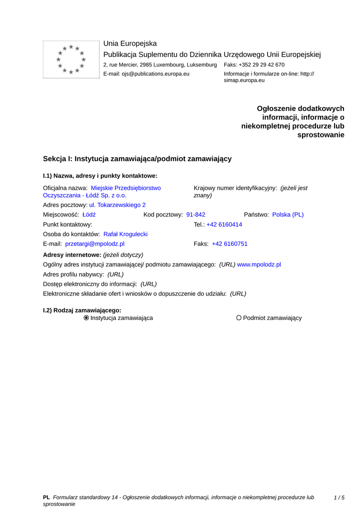 Unia Europejska Publikacja Suplementu do Dziennika Urzędowego Unii Europejskiej 2, rue Mercier, 2985 Luxembourg, Luksemburg Faks: +352 29 29 42 670 E-mail: [email protected] Informacje i formularze on-line: http:// simap.europa.eu Ogłoszenie dodatkowych informacji, informacje o niekompletnej procedurze lub sprostowanie Sekcja I: Instytucja zamawiająca/podmiot zamawiający I.1) Nazwa, adresy i punkty kontaktowe: Oficjalna nazwa: Miejskie Przedsiębiorstwo Oczyszczania - Łódź Sp. z o.o. Krajowy numer identyfikacyjny: (jeżeli jest znany) _____ Adres pocztowy: ul. Tokarzewskiego 2 Miejscowość: Łódź Kod pocztowy: 91-842 Punkt kontaktowy: _____ Państwo: Polska (PL) Tel.: +42 6160414 Osoba do kontaktów: Rafał Krogulecki E-mail: [email protected] Faks: +42 6160751 Adresy internetowe: (jeżeli dotyczy) Ogólny adres instytucji zamawiającej/ podmiotu zamawiającego: (URL) www.mpolodz.pl Adres profilu nabywcy: (URL) _____ Dostęp elektroniczny do informacji: (URL) _____ Elektroniczne składanie ofert i wniosków o dopuszczenie do udziału: (URL) _____ I.2) Rodzaj zamawiającego: Instytucja zamawiająca Podmiot zamawiający PL Formularz standardowy 14 - Ogłoszenie dodatkowych informacji, informacje o niekompletnej procedurze lub sprostowanie 1/5 Sekcja II: Przedmiot zamówienia II.1.1) Nazwa nadana zamówieniu: Dotyczy: przetargu nieograniczonego na wynajem długoterminowy 4 sztuk fabrycznie nowych, samochodów ciężarowych z zabudową bezpylną o pojemności bębna 19m3 - 20m3 wraz z ich serwisem oraz z możliwością wykupu, na podwoziu trzyosiowym, z trzecią osią skrętną. II.1.2) Krótki opis zamówienia lub zakupu: (podano w pierwotnym ogłoszeniu) Przedmiotem zamówienia jest wynajem długoterminowy, czterech fabrycznie nowych samochodów ciężarowych, z fabrycznie nową zabudową bezpylną, o pojemności bębna 19m3 - 20m3, na podwoziu trzyosiowym, z trzecią osią skrętną. Rok produkcji samochodów oraz zabudowy 2013 r., 2014 r. lub 2015 r. II.1.3) Wspólny Słownik Zamówień (CPV) Główny przedmiot Słownik główny 66000000 Słownik uzupełniający (jeżeli dotyczy) PL Formularz standardowy 14 - Ogłoszenie dodatkowych informacji, informacje o niekompletnej procedurze lub sprostowanie 2/5 Sekcja IV: Procedura IV.1)Rodzaj procedury (podano w pierwotnym ogłoszeniu) Otwarta Ograniczona Ograniczona przyspieszona Negocjacyjna Negocjacyjna przyspieszona Dialog konkurencyjny Negocjacyjna z uprzednim ogłoszeniem Negocjacyjna bez uprzedniego ogłoszenia Negocjacyjna z publikacją ogłoszenia o zamówieniu Negocjacyjna bez publikacji ogłoszenia o zamówieniu Udzielenie zamówienia bez uprzedniej publikacji ogłoszenia o zamówieniu w Dzienniku Urzędowym Unii Europejskiej IV.2)Informacje administracyjne IV.2.1)Numer referencyjny: (podano w pierwotnym ogłoszeniu) ZP/03/2015 IV.2.2)Dane referencyjne ogłoszenia w przypadku ogłoszeń przesłanych drogą elektroniczną: Pierwotne ogłoszenie przesłane przez eNotices TED eSender Login: ENOTICES_MPO-Lodz Dane referencyjne ogłoszenia: 2015-010909 rok i numer dokumentu IV.2.3)Ogłoszenie, którego dotyczy niniejsza publikacja: Numer ogłoszenia w Dz.U.: _____ z dnia: ______ (dd/mm/rrrr) IV.2.4)Data wysłania pierwotnego ogłoszenia: 26/01/2015 (dd/mm/rrrr) PL Formularz standardowy 14 - Ogłoszenie dodatkowych informacji, informacje o niekompletnej procedurze lub sprostowanie 3/5 Sekcja VI: Informacje uzupełniające VI.1) Ogłoszenie dotyczy: Procedury niepełnej Sprostowania Informacji dodatkowych VI.2) Informacje na temat niepełnej procedury udzielenia zamówienia: Postępowanie o udzielenie zamówienia zostało przerwane Postępowanie o udzielenie zamówienia uznano za nieskuteczne Zamówienia nie udzielono Zamówienie może być przedmiotem ponownej publikacji VI.3) Informacje do poprawienia lub dodania : VI.3.1) Zmiana oryginalnej informacji podanej przez instytucję zamawiającą Publikacja w witrynie TED niezgodna z oryginalną informacją, przekazaną przez instytucję zamawiającą Oba przypadki VI.3.2) W ogłoszeniu pierwotnym W odpowiedniej dokumentacji przetargowej (więcej informacji w odpowiedniej dokumentacji przetargowej) W obu przypadkach (więcej informacji w odpowiedniej dokumentacji przetargowej) VI.3.3) Tekst, który należy poprawić w pierwotnym ogłoszeniu Miejsce, w którym znajduje się Zamiast: Powinno być: zmieniany tekst: Dotyczy: przetargu nieograniczonego Dotyczy: przetargu nieograniczonego II.1.1 Nazwa nadana zamówieniu na wynajem długoterminowy 4 sztuk na wynajem długoterminowy 4 sztuk fabrycznie nowych, samochodów fabrycznie nowych, samochodów przez instytucję zamawiającą : ciężarowych z zabudową bezpylną ciężarowych z zabudową bezpylną o o pojemności bębna 19m3 pojemności 19m3 - 20m3 wraz z ich 20m3 wraz z ich serwisem oraz z serwisem oraz z możliwością możliwością wykupu, na podwoziu trzyosiowym, z wykupu, na podwoziu trzyosiowym, z trzecią osią skrętną. trzecią osią skrętną. Miejsce, w którym znajduje się zmieniany tekst: II.1.5) Krótki opis zamówienia lub zakupu Zamiast: Powinno być: Przedmiotem zamówienia jest Przedmiotem zamówienia jest wynajem długoterminowy, czterech wynajem długoterminowy, czterech fabrycznie nowych samochodów fabrycznie nowych samochodów ciężarowych, z fabrycznie nową ciężarowych, z fabrycznie nową zabudową bezpylną, o pojemności zabudową bezpylną, o pojemności bębna 19m3 - 20m3, na podwoziu 19m3 - 20m3, na podwoziu trzyosiowym, z trzecią osią skrętną. trzyosiowym, z trzecią osią skrętną. Rok produkcji samochodów oraz Rok produkcji samochodów oraz zabudowy 2013 r., 2014 r. lub 2015 r. zabudowy 2013 r., 2014 r. lub 2015 r. VI.3.4) Daty, które należy poprawić w pierwotnym ogłoszeniu Miejsce, w którym znajdują się Zamiast: zmieniane daty: Powinno być: PL Formularz standardowy 14 - Ogłoszenie dodatkowych informacji, informacje o niekompletnej procedurze lub sprostowanie 4/5 VI.3.5) Adresy i p