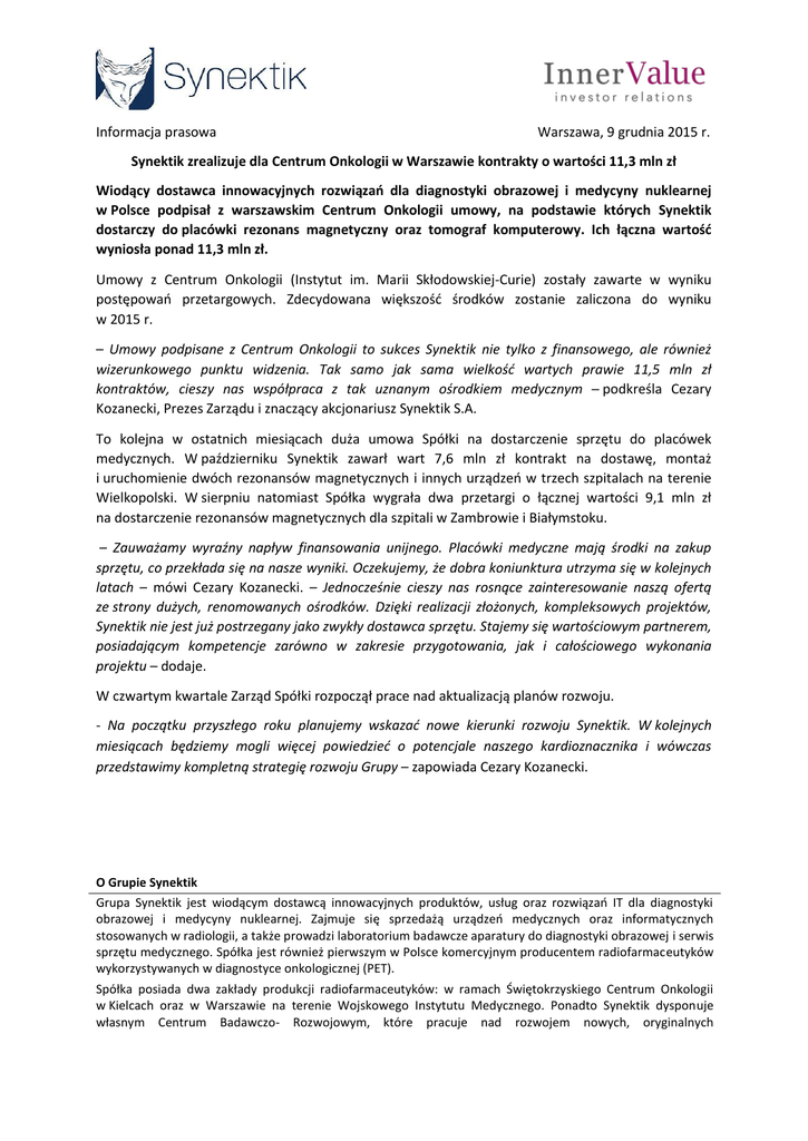 Informacja prasowa Warszawa, 9 grudnia 2015 r. Synektik zrealizuje dla Centrum Onkologii w Warszawie kontrakty o wartości 11,3 mln zł Wiodący dostawca innowacyjnych rozwiązań dla diagnostyki obrazowej i medycyny nuklearnej w Polsce podpisał z warszawskim Centrum Onkologii umowy, na podstawie których Synektik dostarczy do placówki rezonans magnetyczny oraz tomograf komputerowy. Ich łączna wartość wyniosła ponad 11,3 mln zł. Umowy z Centrum Onkologii (Instytut im. Marii Skłodowskiej-Curie) zostały zawarte w wyniku postępowań przetargowych. Zdecydowana większość środków zostanie zaliczona do wyniku w 2015 r. – Umowy podpisane z Centrum Onkologii to sukces Synektik nie tylko z finansowego, ale również wizerunkowego punktu widzenia. Tak samo jak sama wielkość wartych prawie 11,5 mln zł kontraktów, cieszy nas współpraca z tak uznanym ośrodkiem medycznym ─ podkreśla Cezary Kozanecki, Prezes Zarządu i znaczący akcjonariusz Synektik S.A. To kolejna w ostatnich miesiącach duża umowa Spółki na dostarczenie sprzętu do placówek medycznych. W październiku Synektik zawarł wart 7,6 mln zł kontrakt na dostawę, montaż i uruchomienie dwóch rezonansów magnetycznych i innych urządzeń w trzech szpitalach na terenie Wielkopolski. W sierpniu natomiast Spółka wygrała dwa przetargi o łącznej wartości 9,1 mln zł na dostarczenie rezonansów magnetycznych dla szpitali w Zambrowie i Białymstoku. – Zauważamy wyraźny napływ finansowania unijnego. Placówki medyczne mają środki na zakup sprzętu, co przekłada się na nasze wyniki. Oczekujemy, że dobra koniunktura utrzyma się w kolejnych latach – mówi Cezary Kozanecki. – Jednocześnie cieszy nas rosnące zainteresowanie naszą ofertą ze strony dużych, renomowanych ośrodków. Dzięki realizacji złożonych, kompleksowych projektów, Synektik nie jest już postrzegany jako zwykły dostawca sprzętu. Stajemy się wartościowym partnerem, posiadającym kompetencje zarówno w zakresie przygotowania, jak i całościowego wykonania projektu – dodaje. W czwartym kwartale Zarząd Spółki rozpoczął prace nad aktualizacją planów rozwoju. - Na początku przyszłego roku planujemy wskazać nowe kierunki rozwoju Synektik. W kolejnych miesiącach będziemy mogli więcej powiedzieć o potencjale naszego kardioznacznika i wówczas przedstawimy kompletną strategię rozwoju Grupy – zapowiada Cezary Kozanecki. O Grupie Synektik Grupa Synektik jest wiodącym dostawcą innowacyjnych produktów, usług oraz rozwiązań IT dla diagnostyki obrazowej i medycyny nuklearnej. Zajmuje się sprzedażą urządzeń medycznych oraz informatycznych stosowanych w radiologii, a także prowadzi laboratorium badawcze aparatury do diagnostyki obrazowej i serwis sprzętu medycznego. Spółka jest również pierwszym w Polsce komercyjnym producentem radiofarmaceutyków wykorzystywanych w diagnostyce onkologicznej (PET). Spółka posiada dwa zakłady produkcji radiofarmaceutyków: w ramach Świętokrzyskiego Centrum Onkologii w Kielcach oraz w Warszawie na terenie Wojskowego Instytutu Medycznego. Ponadto Synektik dysponuje własnym Centrum Badawczo- Rozwojowym, które pracuje nad rozwojem nowych, oryginalnych radioznaczników kardiologicznych i onkologicznych. Firma powstała w 2001 roku. Dziesięć lat później akcje Synektik debiutowały na rynku NewConnect. W październiku 2014 roku Spółka przeniosła notowania na rynek regulowany GPW w Warszawie. Synektik był wielokrotnie nagradzany w najbardziej prestiżowych rankingach. Otrzymał m.in. statuetkę „Gazele Biznesu 2011” oraz znalazł się wśród wyróżnionych nagrodą „Diamenty Forbesa 2012”. W 2013 roku Spółka została doceniona przez Gazetę Giełdy Parkiet i Inwestorów w rankingu „Byki i Niedźwiedzie”, uzyskując tytuł spółki roku rynku NewConnect. W październiku 2015 r. Cezary Kozanecki, Prezes Synektik został laureatem nagrody „Wizjonerzy Biznesu”. Więcej informacji: www.synektik.pl Kontakt dla mediów i inwestorów: InnerValue Piotr Książek +48 501 988 693 [email protected]