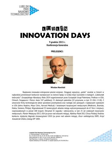 9 grudnia 2015 r. Konferencja Generalna PRELEGENCI: Wiesław Nowiński Naukowiec-innowator-entreprener-pionier-wizjoner. Osiągnął najwyższy „polski” rezultat w historii w najbardziej prestiżowym konkursie wynalazczym na świecie będąc w ścisłej trójce laureatów w kategorii „Całokształt twórczości” Europejskiego Wynalazcy Roku 2014 organizowanym przez Europejski Urząd Patentowy. Profesor w USA, Chinach, Singapurze i Polsce. Autor 547 publikacji, 51 złożonych patentów (32 przyznane, w tym 15 USA i 8 UE), 3 utworzone firmy technologiczne (dwie sprzedane przemysłowi) oraz rozległa sieć powiązań z najlepszymi szpitalami w USA (Johns Hopkins, Mayo Clinic, Harvard Medical) i światowymi korporacjami medycznymi (Medtronic, Brainlab, Elekta, Siemens, Philips). Wyprodukował 35 komercyjnych atlasów mózgu wylicencjonowanych do 67 firm i instytucji, rozprowadzonych w ponad 100 krajach. Otrzymał 42 nagrody i odznaczenia, w tym 25 od czołowych towarzystw medycznych; Pionier Medycyny 2013, USA (za prace nad atlasami mózgu), Wybitny Polak 2012 (Teraz Polska), finalista konkursu Azjatycka Nagroda Innowacyjności 2010 (za prace nad udarem mózgu), Oscar radiologiczny 2009, Krzyż Kawalerski Orderu Zasługi RP 2005. Lubelski Park Naukowo-Technologiczny S.A. ul. Dobrzańskiego 3, 20-262 Lublin tel.: 81 534 61 00, fax: 81 351 85 48, e-mail: [email protected], www.lpnt.pl, KRS 0000228715, NIP 712 29 14 578, REGON: 060005172 Sąd Rejonowy w Lublinie, XI Wydział Gospodarczy, Kapitał zakładowy 53 703 000,00 zł, kapitał wpłacony 53 703 000,00 zł. Piotr Pietrzak Chief Technologist, STG CEE System Architects Leader. Jest członkiem 28-osobowej grupy Innovation Network, zajmującej się w IBM rozwijaniem nowatorskich rozwiązań. Pełni też funkcję lidera architektów Systems & Technology Group w regionie CEE. Entuzjasta i technologiczny ewangelista, od 13 lat związany z branżą IT. Specjalizuje się w projektach optymalizacji infrastruktury IT klientów IBM. Aktywnie wspiera partnerów IBM w oferowaniu i dostarczaniu zaawansowanych i innowacyjnych rozwiązań. Autor wielu branżowych publikacji, między innymi IBM RedBook's. Przełamuje schematy, promuje innowacje. Miłośnik szybkich motocykli, otwarych standardów i umysłów. Konrad Frontczak Fundraiser, menedżer projektów inwestycyjnych, infrastrukturalnych oraz badawczych. Prezes Zarządu Centrum Innowacji Akademii Morskiej w Szczecinie Sp. z o.o., której celem jest komercjalizacji własności intelektualnej. Ekspert oceniający w programach regionalnych oraz krajowych. Reprezentant regionalny KIC InnoEnergy. Lubelski Park Naukowo-Technologiczny S.A. ul. Dobrzańskiego 3, 20-262 Lublin tel.: 81 534 61 00, fax: 81 351 85 48, e-mail: [email protected], www.lpnt.pl, KRS 0000228715, NIP 712 29 14 578, REGON: 060005172 Sąd Rejonowy w Lublinie, XI Wydział Gospodarczy, Kapitał zakładowy 53 703 000,00 zł, kapitał wpłacony 53 703 000,00 zł. Adam Kuzdraliński Skutecznie łączy naukę z biznesem. Prezes zarządu w spółce Vitagenum, zajmującej się genetyką człowieka oraz prezes zarządu w spółce Nexbio, której przedmiotem działalności jest genetyka mikroorganizmów, roślin i zwierząt. Kieruje zespołem biotechnologów wdrażających nowe produkty i usługi z zakresu biologii molekularnej. Zajął III miejsce w tegorocznym konkursie infoShare StartUp Contest. Adiunkt w Katedrze Biotechnologii, Żywienia Człowieka i Towaroznawstwa Żywności UP. Znalazł się w gronie 36 naukowców poniżej 35. roku życia, którzy otrzymali granty naukowe w ramach programu Lider. Jego zainteresowania naukowe dotyczą zastosowania metod i technik biologii molekularnej oraz bioinformatyki do analiz genetycznych mikroorganizmów i człowieka. Jest autorem kilkudziesięciu prac naukowych i kilkuset popularnonaukowych. Kazimierz Murzyn Prezes Zarządu Fundacji i Dyrektor Zarządzający Klastra LifeScience w Krakowie. V-ce Prezes Global Innovation Network, organizacji non-profit w Pn. Karolinie, USA, członek Komitetu Biotechnologii PAN. Absolwent Politechniki Krakowskiej. Dodatkowo: Polsko-Amerykańska Szkoła Biznesu w Krakowie (Zarządzanie i marketing), Sloan School of Management, MIT Cambridge USA (Dynamika Systemów), Rutgers University, NJ N.Brunswick, USA (Biopharma Global Entrepreneurship) i inne. Zajmuje się rozwojem innowacyjnych ekosystemów, oceną i transferem technologii, innowacyjnością i przedsiębiorczością. Ekspert w zakresie planowania strategicznego, planowania scenariuszowego, kreatywności i kreatywnego rozwiązywania problemów, zarządzania projektami. Lubelski Park Naukowo-Technologiczny S.A. ul. Dobrzańskiego 3, 20-262 Lublin tel.: 81 534 61 00, fax: 81 351 85 48, e-mail: [email protected], www.lpnt.pl, KRS 0000228715, NIP 712 29 14 578, REGON: 060005172 Sąd Rejonowy w Lublinie, XI Wydział Gospodarczy, Kapitał zakładowy 53 703 000,00 zł, kapitał wpłacony 53 703 000,00 zł. 10 grudnia 2015 r. Wydarzenia branżowe 11 grudnia 2015 r. Warsztaty Otwarte warsztaty – komercjalizacja wiedzy. Prowadzący – Inno-brokerzy LPNT - Kamil Chmielewski, Dawid Kowalczyk, Edyta Chruściel, Ilona Dąbrowska. Otwarte warsztaty – wspieranie innowacyjności i kreatywności. Prowadząca – Joanna Hołda, Dyrektor Lubelskiego Instytutu Designu LPNT Organizator Os. do kontaktu: Jagoda Kwiecień Animator StartUp j.kwiecien@lpnt 519 169 390 Lubelski Park Naukowo-Technologiczny S.A. ul. Dobrzańskiego 3, 20-262 Lublin tel.: 81 534 61 00, fax: 81 351 85 48, e-mail: [email protected], www.lpnt.pl, KRS 0000228715, NIP 712 29 14 578, REGON: 060005172 Sąd Rejonowy w Lublinie, XI Wydział Gospodarczy, Kapitał zakładowy 53 703 000,00 zł, kapitał wpłacony 53 703 000,00 zł.