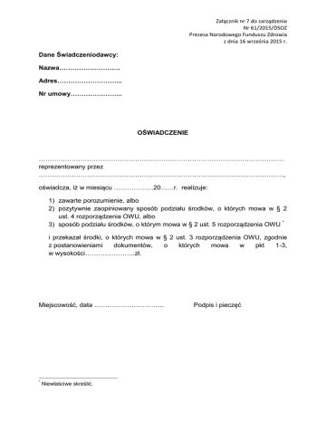 Załącznik nr 7 do zarządzenia Nr 61/2015/DSOZ Prezesa Narodowego Funduszu Zdrowia z dnia 16 września 2015 r. Dane Świadczeniodawcy: Nazwa………………………. Adres………………………... Nr umowy…………………... OŚWIADCZENIE …………………………………………………………………………………………………. reprezentowany przez …………………………………………………………………………………………………., oświadcza, iż w miesiącu ………………20……r. realizuje: 1) zawarte porozumienie, albo 2) pozytywnie zaopiniowany sposób podziału środków, o których mowa w § 2 ust. 4 rozporządzenia OWU, albo 3) sposób podziału środków, o którym mowa w § 2 ust. 5 rozporządzenia OWU * i przekazał środki, o których mowa w § 2 ust. 3 rozporządzenia OWU, zgodnie z postanowieniami dokumentów, o których mowa w pkt 1-3, w wysokości…………………..zł. Miejscowość, data ………………………….. * Niewłaściwe skreślić. Podpis i pieczęć