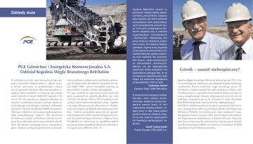 Zakłady duże PGE Górnictwo i Energetyka Konwencjonalna S.A. Oddział Kopalnia Węgla Brunatnego Bełchatów W zakładzie corocznie opracowywany jest plan poprawy warunków bezpieczeństwa i higieny pracy, w którym ujmowane są przedsięwzięcia mające na celu poprawę warunków bhp oraz warunków socjalnych. Suma wydatków na realizację tego rodzaju zadań wyniosła w latach 2009-2011 przeszło 12,6 mln zł. W celu ograniczenia zagrożeń dokonuje się remontu i modernizacji maszyn, wymiany taboru samochodowego oraz dźwigów, równiarek, ładowarek, spycharek, wymianę obrabiarek obróbki skrawaniem. Wykonano obudowę osłoną przeciwpyłową przenośnika transportującego węgiel z Pola Szczerców do elektrowni i na plac uśredniania. Laboratorium Higieny Pracy dokonuje pomiarów czynników szkodliwych dla zdrowia występujących na stanowiskach pracy. Ustalane są miejsca zagrożeń tymi czynnikami. Na tej podstawie podejmowane są działania zmierzające do ograniczenia szkodliwych czynników do wartości NDS i NDN – jeśli to niemożliwe wyposaża się pracowników w środki ochrony indywidualnej. W ciągu ostatnich lat ograniczono liczbę stanowisk pracy narażonych na czynniki szkodliwe, np. hałas z 421 do 320, łącznie: 880 do 790. W zakładzie funkcjonuje system szkoleń zawodowych załogi – zgodnie z rocznym „Planem potrzeb szkoleniowych”. Realizowany jest program profilaktyki zdrowotnej pracowników – badania prowadzone przez lekarzy specjalistów. Kopalnia od 2009 r. posiada Zintegrowany System Zarządzania Bezpieczeństwem i Higieną Pracy. W zakładzie nie odnotowuje się wypadków ciężkich przy pracy, liczba wypadków lekkich jest systematycznie ograniczana (2009-40, 2011-23). Kopalnia Bełchatów zawsze na pierwszym miejscu stawia bezpieczeństwo pracowników. Zdajemy sobie sprawę, jak ważne podczas prowadzenia robót eksploatacyjnych są bezpieczne warunki pracy. Corocznie podejmujemy skuteczne działania bhp w zakresie organizacyjnym, proceduralnym i technicznym. Wykraczają one poza minimum określone przepisami prawa. W obszarze bezpieczeństwa i higieny pracy kopalnia od lat zapewnia pracownikom ponadstandardową opiekę medyczną oraz szkolenia dla pracowników dozoru i osób zatrudnionych na stanowiskach robotniczych. Staramy się jak najskuteczniej ograniczać liczbę wypadków. Na podkreślenie zasługuje fakt, że na zmniejszanie wypadkowości duży wpływ ma znakomita współpraca ze specjalistami z OIP w Łodzi. Kazimierz Kozioł Dyrektor Oddz. KWB Bełchatów O silnej pozycji naszego przedsiębiorstwa, obok sukcesu ekonomicznego, świadczą również bezpieczne warunki pracy. W celu zwiększenia bezpieczeństwa i higieny pracy w całej naszej spółce podejmowane są działania mające na celu znaczne ograniczenie lub likwidację występujących zagrożeń. Jacek Kaczorowski Prezes Zarządu PGE GiEK S.A. Górnik – zawód niebezpieczny? Kopalnia Węgla Brunatnego Bełchatów funkcjonuje od 1975 r. Proces technologiczny realizowany jest układami koparka-taśmociąg-zwałowarka. Roczne wydobycie węgla brunatnego wynosi ok. 40 mln ton, co stanowi ponad 50% ogółu wydobycia w Polsce i czyni zakład jednym z największych europejskich dostawców tego surowca energetycznego. Rocznie zdejmowanych jest 130 mln m3 nadkładu i wypompowuje się ok. 250 mln m3 wody. Wyrobisko Pola Bełchatów posiada osiem poziomów eksploatacyjnych. Od 2009 r. eksploatowane jest na pięciu poziomach Pole Szczerców. Strategicznym odbiorcą produkcji zakładu jest Elektrownia Bełchatów. Od kilku lat systematycznie rośnie wydobycie i sprzedaż piasków, żwirów, kruszyw i iłów. Część kopalin jest selektywnie eksploatowana i składowana na złożach wtórnych. Służą one jako baza surowcowa dla przedsięwzięć inwestycyjnych kopalni oraz dla zewnętrznych odbiorców surowców mineralnych. W KWB zatrudnionych jest 6 464 pracowników.