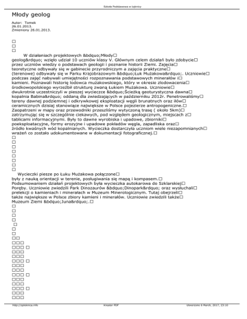 Szkoła Podstawowa w Łęknicy Młody geolog Autor: Tomek 26.01.2013. Zmieniony 26.01.2013. W działaniach projektowych „Młody geolog” wzięło udział 10 uczniów klasy V. Głównym celem działań było zdobycie przez uczniów wiedzy o podstawach geologii i poznanie historii Ziemi. Zajęcia teoretyczne odbywały się w gabinecie przyrodniczym a zajęcia praktyczne (terenowe) odbywały się w Parku Krajobrazowym „Łuk Mużakowa”. Uczniowie podczas zajęć nabywali umiejętności rozpoznawania podstawowych minerałów i kamieni. Poznawali historię lodowca mużakowskiego, który w okresie zlodowacenia środkowopolskiego wyrzeźbił strukturę zwaną Łukiem Mużakowa. Uczniowie dwukrotnie uczestniczyli w pieszej wycieczce „Ścieżką geoturystyczna dawna kopalnia Babina” oddaną dla zwiedzających w październiku 2012r. Penetrowaliśmy tereny dawnej podziemnej i odkrywkowej eksploatacji węgli brunatnych oraz iłów ceramicznych dzisiaj stanowiące największe w Polsce pojezierze antropogeniczne. Zaopatrzeni w mapy oraz przewodniki przeszliśmy wytyczoną trasę ( około 5km) zatrzymując się w szczególnie ciekawych, pod względem geologicznym, miejscach z tablicami informacyjnymi. Były to dawne wyrobiska i upadowe, zbiorniki poeksploatacyjne, formy erozyjne i upadowe pokładów węgla, zapadliska oraz źródło kwaśnych wód kopalnianych. Wycieczka dostarczyła uczniom wiele niezapomnianych wrażeń co zostało udokumentowane w dokumentacji fotograficznej. Wycieczki piesze po Łuku Mużakowa połączone były z nauką orientacji w terenie, posługiwania się mapą i kompasem. Podsumowaniem działań projektowych była wycieczka autokarowa do Szklarskiej Poręby. Uczniowie zwiedzili Park Dinozaurów „Dinopark” oraz wysłuchali prelekcji o kamieniach i minerałach w Muzeum Minerologicznym. Tutaj obejrzeli także największe w Polsce zbiory kamieni i minerałów. Uczniowie zwiedzili także Muzeum Ziemi „Juna”. http://spleknica.info Kreator PDF Utworzono 6 March, 2017, 23:10 Szkoła Podstawowa w Łęknicy http://spleknica.info Kreator PDF Utworzono 6 March, 2017, 23:10