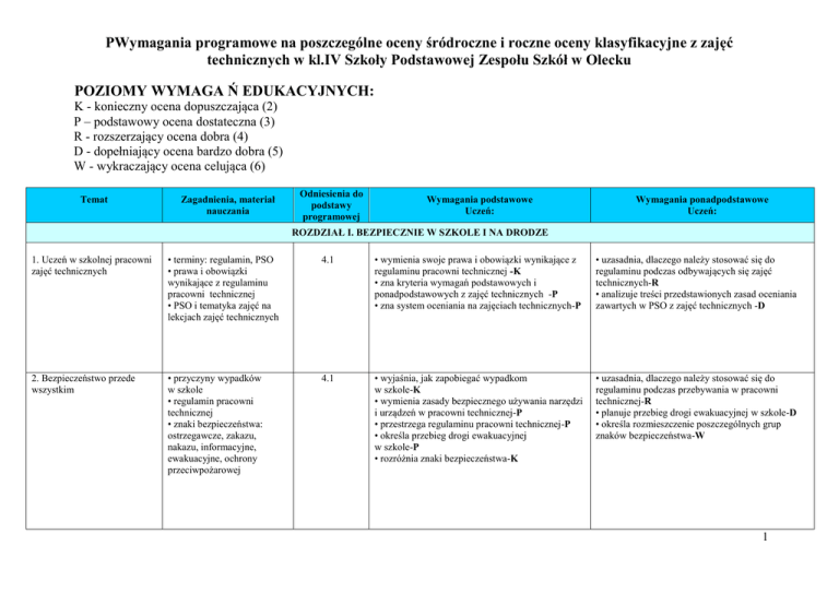 PWymagania programowe na poszczególne oceny śródroczne i roczne oceny klasyfikacyjne z zajęć technicznych w kl.IV Szkoły Podstawowej Zespołu Szkół w Olecku POZIOMY WYMAGA Ń EDUKACYJNYCH: K - konieczny ocena dopuszczająca (2) P – podstawowy ocena dostateczna (3) R - rozszerzający ocena dobra (4) D - dopełniający ocena bardzo dobra (5) W - wykraczający ocena celująca (6) Temat Zagadnienia, materiał nauczania Odniesienia do podstawy programowej Wymagania podstawowe Uczeń: Wymagania ponadpodstawowe Uczeń: ROZDZIAŁ I. BEZPIECZNIE W SZKOLE I NA DRODZE 1. Uczeń w szkolnej pracowni zajęć technicznych • terminy: regulamin, PSO • prawa i obowiązki wynikające z regulaminu pracowni technicznej • PSO i tematyka zajęć na lekcjach zajęć technicznych 4.1 • wymienia swoje prawa i obowiązki wynikające z regulaminu pracowni technicznej -K • zna kryteria wymagań podstawowych i ponadpodstawowych z zajęć technicznych -P • zna system oceniania na zajęciach technicznych-P • uzasadnia, dlaczego należy stosować się do regulaminu podczas odbywających się zajęć technicznych-R • analizuje treści przedstawionych zasad oceniania zawartych w PSO z zajęć technicznych -D 2. Bezpieczeństwo przede wszystkim • przyczyny wypadków w szkole • regulamin pracowni technicznej • znaki bezpieczeństwa: ostrzegawcze, zakazu, nakazu, informacyjne, ewakuacyjne, ochrony przeciwpożarowej 4.1 • wyjaśnia, jak zapobiegać wypadkom w szkole-K • wymienia zasady bezpiecznego używania narzędzi i urządzeń w pracowni technicznej-P • przestrzega regulaminu pracowni technicznej-P • określa przebieg drogi ewakuacyjnej w szkole-P • rozróżnia znaki bezpieczeństwa-K • uzasadnia, dlaczego należy stosować się do regulaminu podczas przebywania w pracowni technicznej-R • planuje przebieg drogi ewakuacyjnej w szkole-D • określa rozmieszczenie poszczególnych grup znaków bezpieczeństwa-W 1 4.2 • posługuje się terminami: droga, chodnik, droga rowerowa, jezdnia, torowisko, pas ruchu, autostrada, droga ekspresowa i ogólnodostępna, droga twarda i gruntowa-K • nazywa części drogi-P • wymienia rodzaje znaków drogowych i opisuje ich kolor oraz kształt-P • stosuje się do informacji przekazywanych przez znaki drogowe-P • opisuje różne rodzaje dróg-R • wymienia zasady obowiązujące na poszczególnych rodzajach dróg-D • wyjaśnia i uzasadnia, które znaki drogowe są szczególnie ważne dla pieszych-W 4-5. To takie proste! – Pan Stop • planowanie etapów pracy • narzędzia do obróbki papieru • zastosowanie papieru 1.2 2.1 2.2 3.1 3.2 • wykonuje pracę w sposób twórczy-D • formułuje ocenę gotowej pracy-W 6. Piechotą po mieście • terminy: przejście dla pieszych, sygnalizator • zasady przechodzenia przez jezdnię na przejściach dla pieszych 1.1 4.2 7-8. Pieszy poza miastem • terminy: obszar zabudowany i niezabudowany • zasady poruszania się po drodze bez chodnika • znaczenie elementów odblaskowych 4.2 9. W podróży • terminy: środki komunikacji 4.2 • właściwie organizuje miejsce pracy-K • wymienia kolejność działań (operacji technologicznych)-P • posługuje się narzędziami do obróbki papieru zgodnie z ich przeznaczeniem-P • wykonuje pracę według przyjętych założeń-P • dba o porządek i bezpieczeństwo w miejscu pracy-P • szacuje czas kolejnych działań (operacji technologicznych)-R • posługuje się terminami: przejście dla pieszych, sygnalizator-K • opisuje sposób przechodzenia przez jezdnię na przejściach dla pieszychz sygnalizacją świetlną i bez niej-P • przedstawia zasadę działania sygnalizatorów na przejściach dla pieszych-P • wskazuje sytuacje zagrażające bezpieczeństwu pieszego na przejściu dla pieszych-R • posługuje się terminami: obszar zabudowany i niezabudowany-K • określa sposób poruszania się po drogach w obszarze niezabudowanym-P • uzasadnia konieczność noszenia odblasków-P • wskazuje, na jakich częściach ubrania pieszego należy umieścić odblaski, aby był on widoczny po zmroku na drodze-P • projektuje element odblaskowy przypinany do plecaka-R • posługuje się terminami: środki komunikacji 3. Na drodze • terminy: droga, chodnik, droga rowerowa, jezdnia, torowisko, pas ruchu, autostrada, droga ekspresowa i ogólnodostępna, droga twarda i gruntowa • części drogi • znaki drogowe ważne dla pieszych • formułuje reguły bezpiecznego przechodzenia przez jezdnię-D • ocenia bezpieczeństwo pieszego w różnych sytuacjach-W • wskazuje różnice między drogą w obszarze zabudowanym i niezabudowanym-R • ocenia, z jakimi zagrożeniami na drodze mogą się zetknąć piesi w obszarze niezabudowanym-R • analizuje, jak noszenie odblasków wpływa na widoczność pieszych na drodze-D • wykazuje się kreatywnością, projektując element odblaskowy-W • formułuje zasady właściwego zachowania się w 2 publicznej, piktogram, rozkład jazdy • zasady korzystania ze środków komunikacji publicznej • piktogramy na dworcach i lotniskach • informacje zawarte w rozkładzie jazdy 10. Piesza wycieczka • zasady planowania wycieczki • znaki obowiązujące na terenie kąpieliska • wskazówki dotyczące pakowania plecaka 4.2 11-12. To takie proste! – Pamiątkowy album • planowanie etapów pracy • narzędzia do obróbki papieru • zastosowanie papieru 1.2 2.1 2.2 3.1 3.2 publicznej, piktogram, rozkład jazdy-K • podaje przykłady właściwego zachowania w środkach komunikacji miejskiej-P • wyjaśnia znaczenie piktogramów-P • czyta ze zrozumieniem rozkład jazdy-P • wybiera na podstawie rozkładu jazdy najdogodniejsze połączenie między miejscowościami-P • planuje cel wycieczki i dobiera odpowiedni środek transportu, korzystając z rozkładu jazdy-R • projektuje własny piktogram na podstawie gotowych wzorów-R • wyznacza trasę pieszej wycieczki-K • wykonuje przewodnik turystyczn