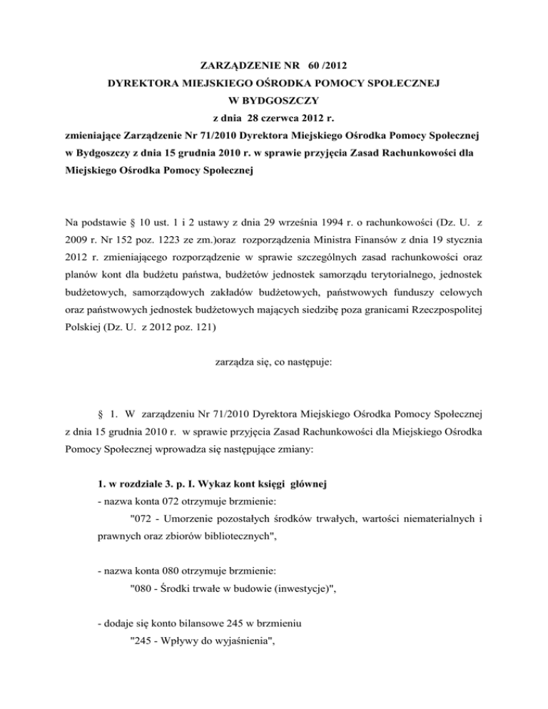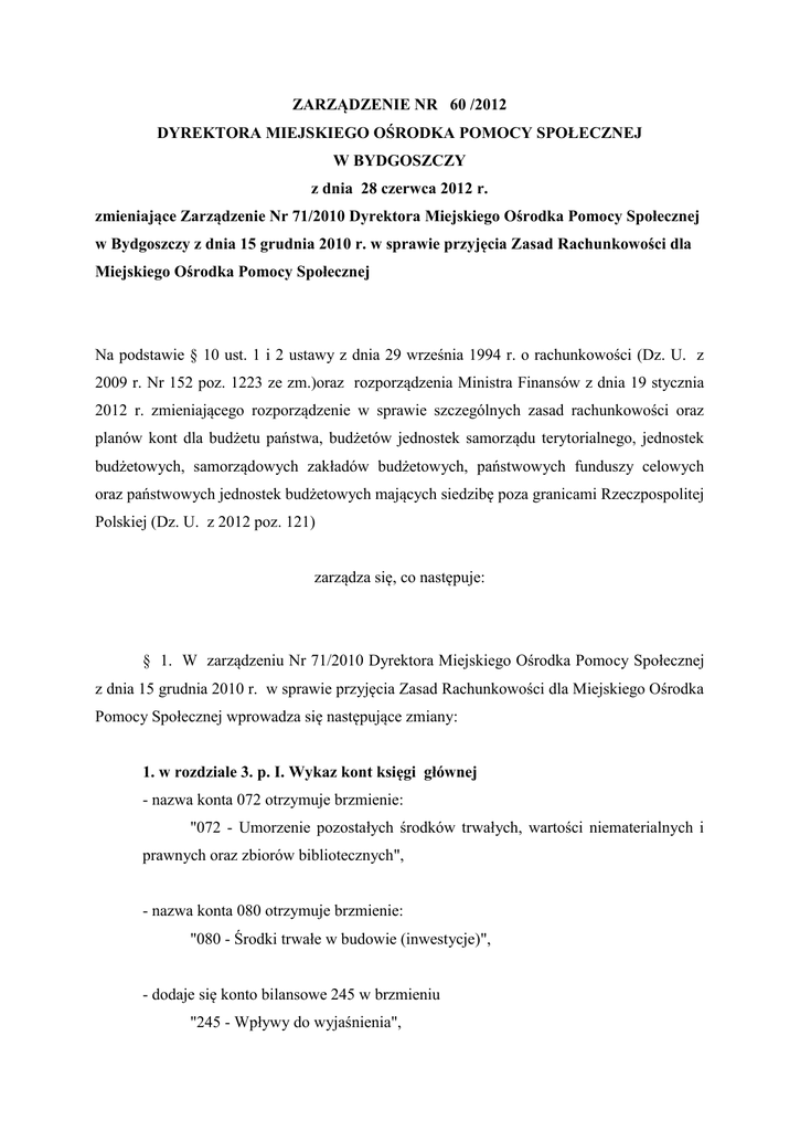 ZARZĄDZENIE NR 60 /2012 DYREKTORA MIEJSKIEGO OŚRODKA POMOCY SPOŁECZNEJ W BYDGOSZCZY z dnia 28 czerwca 2012 r. zmieniające Zarządzenie Nr 71/2010 Dyrektora Miejskiego Ośrodka Pomocy Społecznej w Bydgoszczy z dnia 15 grudnia 2010 r. w sprawie przyjęcia Zasad Rachunkowości dla Miejskiego Ośrodka Pomocy Społecznej Na podstawie § 10 ust. 1 i 2 ustawy z dnia 29 września 1994 r. o rachunkowości (Dz. U. z 2009 r. Nr 152 poz. 1223 ze zm.)oraz rozporządzenia Ministra Finansów z dnia 19 stycznia 2012 r. zmieniającego rozporządzenie w sprawie szczególnych zasad rachunkowości oraz planów kont dla budżetu państwa, budżetów jednostek samorządu terytorialnego, jednostek budżetowych, samorządowych zakładów budżetowych, państwowych funduszy celowych oraz państwowych jednostek budżetowych mających siedzibę poza granicami Rzeczpospolitej Polskiej (Dz. U. z 2012 poz. 121) zarządza się, co następuje: § 1. W zarządzeniu Nr 71/2010 Dyrektora Miejskiego Ośrodka Pomocy Społecznej z dnia 15 grudnia 2010 r. w sprawie przyjęcia Zasad Rachunkowości dla Miejskiego Ośrodka Pomocy Społecznej wprowadza się następujące zmiany: 1. w rozdziale 3. p. I. Wykaz kont księgi głównej - nazwa konta 072 otrzymuje brzmienie: "072 - Umorzenie pozostałych środków trwałych, wartości niematerialnych i prawnych oraz zbiorów bibliotecznych", - nazwa konta 080 otrzymuje brzmienie: "080 - Środki trwałe w budowie (inwestycje)", - dodaje się konto bilansowe 245 w brzmieniu "245 - Wpływy do wyjaśnienia", - dodaje się konto pozabilansowe 976 w brzmieniu "976 - Wzajemne rozliczenia między jednostkami", 2. w rozdziale 3. p. II. Zasady klasyfikacji zdarzeń - opisy kont otrzymują brzmienie: KONTA BILANSOWE Zespół 2 – „Rozrachunki i roszczenia” Konto 245 – „Wpływy do wyjaśnienia” Konto 245 służy do ewidencji wpłaconych, a niewyjaśnionych kwot należności z tytułu dochodów budżetowych. Na stronie Wn konta 245 ujmuje się w szczególności kwoty wyjaśnionych wpłat i ich zwroty. Na stronie Ma konta 245 ujmuje się w szczególności kwoty niewyjaśnionych wpłat. Konto 245 może wykazywać saldo Ma, które oznacza stan niewyjaśnionych wpłat." Konto 290 - „Odpisy aktualizujące należności” Konto 290 służy do ewidencji odpisów aktualizujących wartość należności wątpliwych. Odpisy aktualizujące dokonuje się w odniesieniu do należności wątpliwych wymienionych w art. 35b ust. 1 w ustawie o rachunkowości. Należności wątpliwe to takie, co do których jest prawdopodobne, że nie zostaną zapłacone w terminie i w pełnej wysokości, a przedwczesne byłoby uznanie ich za nieściągalne. W MOPS ustala się, że należności wątpliwe to należności których termin wymagalności wynosi 6 miesięcy. Odsetki od tych należności również uznaje się za wątpliwe do czasu zapłaty i księguje się na stronie Ma konta 290. Brak reakcji na wezwania do zapłaty może świadczyć o wysokim stopniu prawdopodobieństwa nieściągalności. Aktualizacja nie zwalnia od działań służących ściągnięciu należności. Odpisy aktualizujące wartość należności zalicza się odpowiednio do pozostałych kosztów operacyjnych lub do kosztów finansowych zależnie od tytułu należności, której dotyczy odpis aktualizacji. Na stronie Wn konta 290 ujmuje się zmniejszenie wartości odpisów aktualizujących należności a na stronie Ma naliczone odpisy i ich zwiększenie. Należności umorzone, przedawnione lub nieściągalne zmniejszają dokonane uprzednio odpisy aktualizujące ich wartości. Konto 290 może wykazywać saldo Ma, które oznacza wartość odpisów aktualizujących należności. Odpisy aktualizujące należności korygują (zmniejszają) wykazywane w aktywach należności, do których te odpisy zostały dokonane i dlatego ewidencja szczegółowa do konta 290 zapewnia ustalenie odpisów aktualizujących należności. Zespół 7 – „Przychody, dochody i koszty” Konto 720 - "Przychody z tytułu dochodów budżetowych" Konto 720 służy do ewidencji przychodów z tytułu dochodów budżetowych związanych bezpośrednio z podstawową działalnością jednostki, do których przede wszystkim zalicza się dochody należne na podstawie ustawy o pomocy społecznej Na stronie Wn konta 720 ujmuje się odpisy z tytułu dochodów budżetowych, a na stronie Ma konta 720 - przychody z tytułu dochodów budżetowych. Ewidencja szczegółowa prowadzona do konta 720 zapewnia wyodrębnienie przychodów z tytułu dochodów budżetowych według pozycji planu finansowego. W końcu roku obrotowego saldo konta 720 przenosi się na konto 860. Na koniec roku konto 720 nie wykazuje salda.", Konto 750 - "Przychody finansowe" Konto 750 służy do ewidencji przychodów finansowych. Na stronie Ma konta 750 ujmuje się przychody z tytułu operacji finansowych, w szczególności odsetki za zwłokę w zapłacie należności oraz kapitalizację odsetek na rachunkach bankowych. Ewidencja szczegółowa do konta 750 zapewnia wyodrębnienie przychodów z tytułu dochodów budżetowych według pozycji planu finansowego W końcu roku obrotowego przenosi się przychody finansowe na stronę Ma konta 860 (Wn konto 750). Na koniec roku konto 750 nie wykazuje salda. Konto 751 - "Koszty finansowe" Konto 751 służy do ewidencji kosztów finansowych. Na stronie Wn konta 751 ujmuje się w szczególności odsetki za zwłokę w zapłacie zobowiązań, odpisy aktualizujące wartość należności z tytułu operacji finansowych oraz ujemne różnice kursowe. W końcu roku obrotowego przenosi się koszty operacji finansowych na stronę Wn konta 860 (Ma konto 751). Na koniec roku konto 751 nie wykazuje salda. Konto 760 - "Pozostałe przychody operacyjne" Konto 760 służy do ewidencji przychodów niezwiązanych bezpośrednio z podstawową działalnością jednostki, w tym wszelkich innych przychodów niż podlegające ewidencji na kontach: 720, 750. W szczególności na stronie Ma konta 760 u