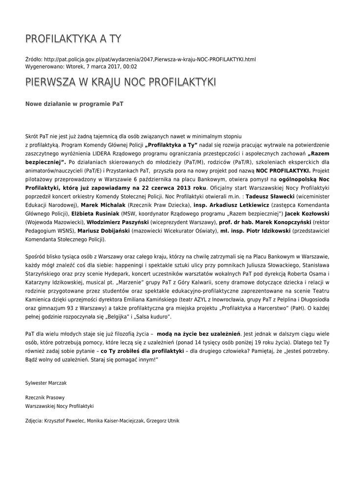 PROFILAKTYKA A TY Źródło: http://pat.policja.gov.pl/pat/wydarzenia/2047,Pierwsza-w-kraju-NOC-PROFILAKTYKI.html Wygenerowano: Wtorek, 7 marca 2017, 00:02 PIERWSZA W KRAJU NOC PROFILAKTYKI Nowe działanie w programie PaT Skrót PaT nie jest już żadną tajemnicą dla osób związanych nawet w minimalnym stopniu z profilaktyką. Program Komendy Głównej Policji „Profilaktyka a Ty” nadal się rozwija pracując wytrwale na potwierdzenie zaszczytnego wyróżnienia LIDERA Rządowego programu ograniczania przestępczości i aspołecznych zachowań „Razem bezpieczniej”. Po działaniach skierowanych do młodzieży (PaT/M), rodziców (PaT/R), szkoleniach eksperckich dla animatorów/nauczycieli (PaT/E) i Przystankach PaT, przyszła pora na nowy projekt pod nazwą NOC PROFILAKTYKI. Projekt pilotażowy przeprowadzony w Warszawie 6 października na placu Bankowym, otwiera pomysł na ogólnopolską Noc Profilaktyki, którą już zapowiadamy na 22 czerwca 2013 roku. Oficjalny start Warszawskiej Nocy Profilaktyki poprzedził koncert orkiestry Komendy Stołecznej Policji. Noc Profilaktyki otwierali m.in. : Tadeusz Sławecki (wiceminister Edukacji Narodowej), Marek Michalak (Rzecznik Praw Dziecka), insp. Arkadiusz Letkiewicz (zastępca Komendanta Głównego Policji), Elżbieta Rusiniak (MSW, koordynator Rządowego programu „Razem bezpieczniej”) Jacek Kozłowski (Wojewoda Mazowiecki), Włodzimierz Paszyński (wiceprezydent Warszawy), prof. dr hab. Marek Konopczyński (rektor Pedagogium WSNS), Mariusz Dobijański (mazowiecki Wicekurator Oświaty), mł. insp. Piotr Idzikowski (przedstawiciel Komendanta Stołecznego Policji). Spośród blisko tysiąca osób z Warszawy oraz całego kraju, którzy na chwilę zatrzymali się na Placu Bankowym w Warszawie, każdy mógł znaleźć coś dla siebie: happeningi i spektakle sztuki ulicy przy pomnikach Juliusza Słowackiego, Stanisława Starzyńskiego oraz przy scenie Hydepark, koncert uczestników warsztatów wokalnych PaT pod dyrekcją Roberta Osama i Katarzyny Idzikowskiej, musical pt. „Marzenie” grupy PaT z Góry Kalwarii, sceny dramowe dotyczące dziecka i relacji w rodzinie przygotowane przez studentów oraz spektakle edukacyjno-profilaktyczne zaprezentowane na scenie Teatru Kamienica dzięki uprzejmości dyrektora Emiliana Kamińskiego (teatr AZYL z Inowrocławia, grupy PaT z Pelplina i Długosiodła oraz gimnazjum 93 z Warszawy) a także profilaktyczna gra miejska projektu „Profilaktyka a Harcerstwo” (PaH). O każdej pełnej godzinie rozpoczynała się „Belgijka” i „Salsa kuduro”. PaT dla wielu młodych staje się już filozofią życia – modą na życie bez uzależnień. Jest jednak w dalszym ciągu wiele osób, które potrzebują pomocy, które leczą się z uzależnień (ponad 14 tysięcy osób poniżej 19 roku życia). Dlatego też Ty również zadaj sobie pytanie – co Ty zrobiłeś dla profilaktyki – dla drugiego człowieka? Pamiętaj, że „Jesteś potrzebny. Bądź wolny od uzależnień. Staraj się pomagać innym!” Sylwester Marczak Rzecznik Prasowy Warszawskiej Nocy Profilaktyki Zdjęcia: Krzysztof Pawelec, Monika Kaiser-Maciejczak, Grzegorz Utnik Ocena: 4.4/5 (10) Tweetnij