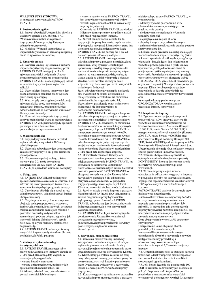 WARUNKI UCZESTNICTWA w imprezach turystycznych PATRON TRAVEL 1. Postanowienia ogólne 1.1. Prawa i obowiązki Uczestników określają wydane w oparciu o art. 385 par. 1 KC "Warunki uczestnictwa w imprezach turystycznych" oraz przepisy Ustawy o usługach turystycznych. 1.2. Niniejsze "Warunki uczestnictwa w imprezach turystycznych" stanowią integralną część ze zgłoszeniem - umową. 2. Zawarcie umowy 2.1. Zawarcie umowy -zgłoszenia o udział w imprezie turystycznej zorganizowanej przez PATRON TRAVEL następuje z chwilą zgłoszenia nazwisk i podpisania Umowy poprzez przedstawiciela lub pełnomocnika PATRON TRAVEL i osobę zgłaszającą udział w imprezie turystycznej oraz wpłacenie zaliczki. 2.2. Uczestnikiem imprezy turystycznej jest osoba zgłaszająca oraz inne osoby wpisane przez osobę zgłaszającą. 2.3. W razie, gdy osoba zgłaszająca dokonuje zgłoszenia kilku osób, jako uczestników zamawianej imprezy, przejmuje również odpowiedzialność za dotrzymanie warunków Umowy przez te osoby. 2.4. Uczestnictwo w imprezie turystycznej osoby niepełnoletniej wymaga przedstawienia PATRON TRAVEL pisemnej zgody opiekuna prawnego wraz z dokumentem potwierdzającym sprawowanie opieki. 3. Warunki płatności 3.1. Przy podpisywaniu Umowy uczestnik wpłaca zaliczkę w wysokości 30 % ceny całości imprezy. 3.2. Uczestnik zobowiązany jest do uiszczenia całości ceny imprezy 45 dni przed terminem jej rozpoczęcia. 3.3. Niedokonanie pełnej wpłaty, o której mowa w pkt. 3.2. może powodować odstąpienie od umowy przez PATRON TRAVEL po uprzednim wezwaniu do zapłaty. 4. Usługi, ceny 4.1. PATRON TRAVEL zobowiązuje się spełnić Świadczenia określone w Umowie, a w zakresie nią nieuregulowanym świadczenia zawarte w katalogu bądź programie imprezy. 4.2. Ceny imprez składają się z trzech usług: usługi przewozowej, usługi pobytowej i usługi ubezpieczeniowej 4.3. Ceny imprez zawartych w katalogu nie obejmują opłat paszportowych, wizowych, bankowych, celnych, lotniskowych, dojazdu z miejsca zamieszkania na miejsce zbiórki i z powrotem oraz usług indywidualnie zamawianych podczas pobytu za granicą, jak wycieczki lokalne (fakultatywne), serwis hotelowy, opłaty za rozmowy telefoniczne, bagażowe, itp. 4.4. PATRON TRAVEL informuje, że ceny wszystkich imprez zostały określone dla osób posiadających Polski paszport. 5. Zmiany w wykonaniu usług turystycznych i cen 5.1. PATRON TRAVEL zastrzega sobie prawo podwyższenia cen imprez w okresie do 21 dni przed planowaną datą wyjazdu w następujących przypadkach: - wzrostu kosztów transportu - wzrostu opłat urzędowych, podatków lub opłat należnych za takie usługi, jak lotniskowe, załadunkowe, przeładunkowe w portach morskich lub lotniczych - wzrostu kursów walut. PATRON TRAVEL jest zobowiązany udokumentować wpływ wzrostu wymienionych opłat na wzrost ceny imprezy turystycznej. O zmianie tej, PATRON TRAVEL powiadomi Klienta w formie pisemnej nie później niż 21 dni przed rozpoczęciem imprezy. 5.2. Wzrost cen upoważnia uczestnika do rezygnacji z imprezy bez koniecznych kosztów. W przypadku rezygnacji klient zobowiązany jest do pisemnego powiadomienia o tym fakcie PATRON TRAVEL nie później niż 3 dni od dnia otrzymania informacji o dopłacie. 5.3. PATRON TRAVEL zastrzega prawo odwołania imprezy z przyczyn niezależnych od Uczestnika, w tej sytuacji Uczestnik jest uprawniony – według swojego wyboru – do: - uczestniczenia w imprezie zastępczej o tym samym lub wyższym standardzie, chyba, że wyrazi zgodę na udział w imprezie o niższym standardzie ze zwrotem różnicy w cenie. - żądania natychmiastowego zwrotu wszystkich wniesionych świadczeń. Jeżeli odwołanie imprezy nastąpiło na skutek siły wyższej lub na skutek zgłoszenia się mniejszej liczby uczestników niż minimalna umówiona liczba – zgodnie z pkt. 5.4, Uczestnikowi przysługuje zwrot wniesionych świadczeń i nie jest uprawniony do dochodzenia odszkodowania. 5.4. PATRON TRAVEL zastrzega sobie prawo odwołania imprezy turystycznej w związku ze zgłoszeniem się mniejszej liczby uczestników. PATRON TRAVEL oświadcza, że minimalna liczba uczestników w imprezach turystycznych organizowanych przez PATRON TRAVEL z transportem autokarowym wynosi 40 osób, natomiast z transportem samolotowym wynosi 35 osób. Oświadczenie PATRON TRAVEL o odwołaniu imprezy turystycznej wymaga dla swojej ważności zachowania formy pisemnej i może być złożone Uczestnikowi najpóźniej na 21 dni przed datą rozpoczęcia imprezy. 5.5. O wszelkich zmianach Umowy, a w szczególności: terminu, programu imprezy lub miejsca zakwaterowania PATRON TRAVEL ma obowiązek poinformować uczestników niezwłocznie o zaistnieniu tych zmian. Uczestnik powinien powiadomić PATRON TRAVEL o akceptacji nowych warunków Umowy lub o rezygnacji w przeciągu 3 dni od momentu otrzymania zawiadomienia. W przypadku rezygnacji nastąpi zwrot wpłaconych kwot. Klient może również dochodzić odszkodowania. 5.6. Jeżeli w trakcie trwania imprezy z przyczyn niezależnych od PATRON TRAVEL nastąpiła zmiana programu imprezy bądź obiektu wykupionego przez Uczestnika PATRON TRAVEL zobowiązany jest do zorganizowania świadczeń zastępczych o tym samym bądź wyższym standardzie. 5.7. PATRON TRAVEL jest zobowiązany do poinformowania Uczestników o zmianach dotyczących szczegółów wylotu, spowodowanych przez przeciążenia korytarzy powietrznych, strajki oraz warunki atmosferyczne. 6. Rezygnacje, zmiana uczestnika 6.1. Uczestnik może z własnej inicjatywy zrezygnować z udziału w imprezie, składając wyłącznie pisemne oświadczenie. Za datę rezygnacji przyjmuje się datę otrzymania przez Organizatora stosownego oświadczenia Klienta. 6.2 Klient, który po wpłacie zaliczki lub całej ceny odstępuje od umowy, jest zobowiązany do pokrycia rzeczywistych kosztów poniesionych przez Organizatora związanych z rezerwacją, jednak nie więcej niż 90% wartości imprez