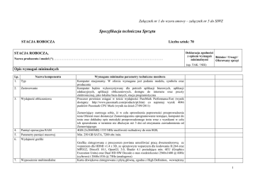 Załącznik nr 1 do wzoru umowy – załącznik nr 5 do SIWZ Specyfikacja techniczna Sprzętu STACJA ROBOCZA Liczba sztuk: 70 STACJA ROBOCZA, Nazwa producenta i model (*)………………………………………………………………………………………………. Deklaracja zgodności z opisem wymagań RóŜnice / Uwagi / minimalnymi Oferowany sprzęt (np. TAK / NIE) Opis wymagań minimalnych Lp. 1. Typ Nazwa komponentu 2. Zastosowanie 3. Wydajność obliczeniowa 4. 5. 6. 7. Pamięć operacyjna RAM Parametry pamięci masowej Wydajność grafiki WyposaŜenie multimedialne Wymagane minimalne parametry techniczne monitora Komputer stacjonarny. W ofercie wymagane jest podanie modelu, symbolu oraz producenta Komputer będzie wykorzystywany dla potrzeb aplikacji biurowych, aplikacji edukacyjnych, aplikacji obliczeniowych, dostępu do internetu oraz poczty elektronicznej, jako lokalna baza danych, stacja programistyczna Procesor powinien osiągać w teście wydajności PassMark PerformanceTest (wynik dostępny: http://www.passmark.com/products/pt.htm) co najmniej wynik 4046 punktów Passmark CPU Mark (wynik na dzień 27/09/2011) Zamawiający zastrzega sobie, iŜ w celu sprawdzenia poprawności przeprowadzenia testu Oferent musi dostarczyć Zamawiającemu oprogramowanie testujące, komputer do testu oraz dokładny opis metodyki przeprowadzonego testu wraz z wynikami w celu ich sprawdzenia w terminie nie dłuŜszym niŜ 3 dni od otrzymania zawiadomienia od Zamawiającego. 4GB (2x2048MB) 1333 MHz moŜliwość rozbudowy do min 8GB, Min. 250 GB SATA, 7200 obr./min. Grafika zintegrowana z procesorem powinna umoŜliwiać pracę dwumonitorową ze wsparciem dla HDMI v1.4 z 3D, ze sprzętowym wsparciem dla kodowania H.264 oraz MPEG2, DirectX 10.1, OpenGL 3.0, Shader 4.1 posiadająca min. 6EU (Graphics Execution Units) oraz Dual HD HW Decode o max rozdzielczości 2560x1600 @ 60Hz (cyfrowo) i 2048x1536 @ 75Hz (analogowo) Karta dźwiękowa zintegrowana z płytą główną, zgodna z High Definition, wewnętrzny 1 głośnik 2W w obudowie komputera Porty słuchawek i mikrofonu na przednim oraz na tylnym panelu obudowy. 8. Obudowa − Małogabarytowa typu Ultra Small Form Chassis, fabrycznie przystosowana do pracy w układzie pionowym i poziomym, umoŜliwiająca montaŜ 1szt zewnętrznego napędu optycznego 5,25” typu „slim” oraz wewnątrz obudowy 1 szt 2,5” dysku twardego − Maksymalna suma wymiarów obudowy nie moŜe przekraczać: 545mm; (240 x 65 x 240 mm), waga max 3,5 kg − Zasilacz w obudowie komputera o mocy max 200W i wydajności 90% − W celu szybkiej weryfikacji usterki w obudowę komputera musi być wbudowany wizualny system diagnostyczny, słuŜący do sygnalizowania i diagnozowania problemów z komputerem i jego komponentami; a w szczególności musi sygnalizować: Przebieg procesu POST Awarię BIOS-u Awarię procesora Uszkodzenia lub braku pamięci RAM, uszkodzenia złączy PCI i PCIe, kontrolera Video, płyty głównej, kontrolera USB 9. Zgodność z systemami operacyjnymi i Oferowane modele komputerów muszą posiadać certyfikat Microsoft, potwierdzający standardami poprawną współpracę oferowanych modeli komputerów z systemem operacyjnym Windows 7 32bit i 64bit (załączyć wydruk ze strony Microsoft WHCL) 10. Bezpieczeństwo Zintegrowany z płytą główną dedykowany układ sprzętowy słuŜący do tworzenia i zarządzania wygenerowanymi przez komputer kluczami szyfrowania. Zabezpieczenie to musi posiadać moŜliwość szyfrowania poufnych dokumentów przechowywanych na dysku twardym przy uŜyciu klucza sprzętowego. 11. BIOS - BIOS zgodny ze specyfikacją UEFI - MoŜliwość, bez uruchamiania systemu operacyjnego z dysku twardego komputera lub innych podłączonych do niego urządzeń zewnętrznych odczytania z BIOS informacji o: a/ wersji BIOS, b/ nr seryjnym komputera wraz z datą jego wyprodukowania, c/ ilości i sposobu obłoŜenia slotów pamięciami RAM, d/ typie procesora wraz z informacją o ilości rdzeni, wielkości pamięci cache L2 i L3, pojemności zainstalowanego dysku twardego e/ rodzajach napędów optycznych f/ MAC adresie zintegrowanej karty sieciowej g/ kontrolerze audio - Funkcja blokowania wejścia do BIOS oraz blokowania startu systemu operacyjnego, (gwarantujący utrzymanie zapisanego hasła nawet w przypadku odłączenia wszystkich źródeł zasilania i podtrzymania BIOS) - Funkcja blokowania/odblokowania BOOT-owania stacji roboczej z zewnętrznych 2 urządzeń MoŜliwość polegająca na kontrolowaniu urządzeń wykorzystujących magistralę komunikacyjną PCI, bez uruchamiania systemu operacyjnego z dysku twardego komputera lub innych podłączonych do niego urządzeń zewnętrznych. Pod pojęciem kontroli Zamawiający rozumie funkcjonalność polegającą na blokowaniu/odblokowaniu slotów PCI. - MoŜliwość, bez uruchamiania systemu operacyjnego z dysku twardego komputera lub innych, podłączonych do niego urządzeń zewnętrznych, ustawienia hasła na poziomie systemu, administratora oraz dysku twardego oraz moŜliwość ustawienia następujących zaleŜności pomiędzy nimi: brak moŜliwości zmiany hasła pozwalającego na uruchomienie systemu bez podania hasła administratora. - Musi posiadać moŜliwość ustawienia zaleŜności pomiędzy hasłem administratora a hasłem systemowy tak, aby nie było moŜliwe wprowadzenie zmian w BIOS wyłącznie po podaniu hasła systemowego. Funkcja ta ma wymuszać podanie hasła administratora przy próbie zmiany ustawień BIOS w sytuacji, gdy zostało podane hasło systemowe. - MoŜliwość włączenia/wyłączenia zintegrowanej karty dźwiękowej, karty sieciowej, portu równoległego, portu szeregowego z poziomu BIOS, bez uruchamiania systemu operacyjnego z dysku twardego komputera lub innych, podłączonych do niego, urządzeń zewnętrznych. - MoŜliwość ustawienia portów USB w trybie „no BOOT”, czyli podczas startu komputer nie wykrywa urządzeń bootujących typu USB, natomia