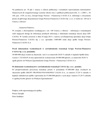 Na podstawie art. 70 pkt 1 ustawy o ofercie publicznej i warunkach wprowadzania instrumentów finansowych do zorganizowanego systemu obrotu oraz o spółkach publicznych (Dz. U. z 2005 r., Nr 184, poz. 1539, ze zm.), Zarząd Grupy Prawno - Finansowej CAUSA S.A. informuje o otrzymaniu pisma od głównego akcjonariusza Grupa Prawno-Finansowa CAUSA Sp. z o.o. w trybie art. 160 ust 4 Ustawy o obrocie: „Szanowni Państwo, W związku z obowiązkiem wynikającym z art. 160 Ustawy o obrocie – informacja o transakcjach osób mających dostęp do informacji poufnych informuję o dokonaniu transakcji zbycia akcji GPF CAUSA. W wyniku zawarcia w dniu 24 maja 2013 r. umowy cywilnoprawnej sprzedaży akcji Grupa Prawno-Finansowa CAUSA Sp. z o.o. sprzedała 3.000.000 sztuk akcji spółki Grupa PrawnoFinansowa CAUSA S.A. Przed dokonaniem wymienionych w zawiadomieniu transakcji Grupa Prawno-Finansowa CAUSA Sp. z o.o. posiadała: 50 000 000 akcji zwykłe na okaziciela serii A co stanowiło 29,03 % udziału w kapitale Spółki który wynosi 1.722.029,95 zł oraz uprawniał do wykonywania 50 000 000 głosów, co stanowiło 29,03 % ogółu głosów na Walnym Zgromadzeniu Grupy Prawno - Finansowej CAUSA S.A. Po dokonaniu wymienionych w zawiadomieniu transakcji CAUSA Sp. z o.o. posiada: Po przeprowadzeniu powyższej transakcji jestem w posiadaniu 47.000.000 akcji zwykłych na okaziciela spółki GRUPY PRAWNO-FINANSOWEJ CAUSA S.A., co stanowi 27,29 % udziału w kapitale zakładowym spółki i upoważnia do 47.000.000 głosów z tych akcji i stanowi 27,29 % udziału w ogólnej liczbie głosów na Walnym Zgromadzeniu”. Podpisy osób reprezentujących spółkę: Prezes Zarządu Piotr Szalbierz