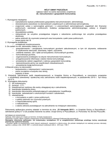 Pszczółki, 13.11.2015 r. WÓJT GMINY PSZCZÓŁKI ogłasza nabór na wolne stanowisko urzędnicze ds. nieruchomości i gospodarki komunalnej 1. Wymagania niezbędne: wykształcenie wyższe preferowane gospodarka nieruchomościami, administracja, doświadczenie zawodowe na stanowiskach urzędniczych w administracji samorządowej, znajomość ustaw o samorządzie gminnym i o pracownikach samorządowych, zagadnień dot. finansów publicznych, zamówień publicznych, kodeksu postępowania administracyjnego, ustawy o drogach publicznych, obywatelstwo polskie, niekaralność za umyślne przestępstwa ścigane z oskarżenia publicznego lub umyślne przestępstwa skarbowe, pełna zdolność do czynności prawnych oraz korzystanie z pełni praw publicznych, prawo jazdy kat. B. 2. Wymagania dodatkowe: umiejętność kosztorysowania. 3. Do zadań na ww. stanowisku należy m.in.: gospodarowanie i zarządzanie komunalnymi gruntami zabudowanymi, w tym ich zbywanie, oddawanie w użytkowanie wieczyste, dzierżawę, najem, użyczenie, ustalanie wartości, cen i opłat za korzystanie z komunalnych gruntów, komunalizacja gruntów, organizowanie przetargów na zbycie nieruchomości komunalnych, przygotowywanie informacji o stanie mienia komunalnego, prowadzenie całości zagadnień z zakresu gospodarki komunalnej, reprezentowanie gminy we wspólnotach mieszkaniowych, prowadzenie ksiąg technicznych. 4.Warunki pracy na stanowisku: bezpośrednio z interesantami i wykonawcami, praca na piętrze w budynku bez windy, wyjazdy w teren. 5. Wskaźnik zatrudnienia osób niepełnosprawnych w Urzędzie Gminy w Pszczółkach, w rozumieniu przepisów o rehabilitacji zawodowej i społecznej oraz zatrudnianiu osób niepełnosprawnych, w październiku 2015 r. był niższy niż 6 %. 6. Wymagane dokumenty: 1) list motywacyjny, 2) życiorys - C.V., 3) kwestionariusz osobowy dla osoby ubiegajacej się o zatrudnienie, 4) kserokopie świadectw pracy, 5) kserokopie dokumentów poświadczających wykształcenie i kwalifikacje, 6) kserokopie zaświadczeń o ukończonych kursach i szkoleniach, 7) oświadczenie: o korzystaniu w pełni z praw publicznych, o pełnej zdolności do czynności prawnych, o nieposzlakowanej opinii, o niekaralności, o stanie zdrowia pozwalającym na zatrudnienie na niniejszym stanowisku. Dokumenty aplikacyjne prosimy składać w terminie do dnia 23 listopada 2015 r. w Urzędzie Gminy w Pszczółkach sekretariat (pokój nr 1) lub przesłać listownie na adres: Urząd Gminy w Pszczółkach, ul. Pomorska 18, 83-032 Pszczółki. INFORMACJE DODATKOWE: Aplikacje, które wpłyną do Urzędu po terminie, nie będą rozpatrywane. Informacja o wyniku naboru zostanie umieszczona na stronie Biuletynu Informacji Publicznej (bip.pszczolki.pl). Wymagane dokumenty aplikacyjne: list motywacyjny, szczegółowe CV (z uwzględnieniem dokładnego przebiegu kariery zawodowej) powinny być opatrzone klauzulą: " Wyrażam zgodę na przetwarzanie moich danych osobowych, zawartych w ofercie pracy, dla potrzeb niezbędnych do realizacji procesu rekrutacji, zgodnie z ustawą z dnia 29.08.1997 r. o ochronie danych osobowych (Dz.U. 2014 poz. 1182 )”