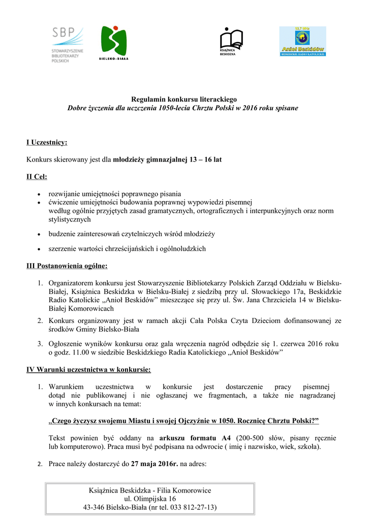Regulamin konkursu literackiego Dobre życzenia dla uczczenia 1050-lecia Chrztu Polski w 2016 roku spisane I Uczestnicy: Konkurs skierowany jest dla młodzieży gimnazjalnej 13 – 16 lat II Cel: rozwijanie umiejętności poprawnego pisania ćwiczenie umiejętności budowania poprawnej wypowiedzi pisemnej według ogólnie przyjętych zasad gramatycznych, ortograficznych i interpunkcyjnych oraz norm stylistycznych budzenie zainteresowań czytelniczych wśród młodzieży szerzenie wartości chrześcijańskich i ogólnoludzkich III Postanowienia ogólne: 1. Organizatorem konkursu jest Stowarzyszenie Bibliotekarzy Polskich Zarząd Oddziału w BielskuBiałej, Książnica Beskidzka w Bielsku-Białej z siedzibą przy ul. Słowackiego 17a, Beskidzkie Radio Katolickie „Anioł Beskidów” mieszczące się przy ul. Św. Jana Chrzciciela 14 w BielskuBiałej Komorowicach 2. Konkurs organizowany jest w ramach akcji Cała Polska Czyta Dzieciom dofinansowanej ze środków Gminy Bielsko-Biała 3. Ogłoszenie wyników konkursu oraz gala wręczenia nagród odbędzie się 1. czerwca 2016 roku o godz. 11.00 w siedzibie Beskidzkiego Radia Katolickiego „Anioł Beskidów” IV Warunki uczestnictwa w konkursie: 1. Warunkiem uczestnictwa w konkursie jest dostarczenie pracy pisemnej dotąd nie publikowanej i nie ogłaszanej we fragmentach, a także nie nagradzanej w innych konkursach na temat: „Czego życzysz swojemu Miastu i swojej Ojczyźnie w 1050. Rocznicę Chrztu Polski?” Tekst powinien być oddany na arkuszu formatu A4 (200-500 słów, pisany ręcznie lub komputerowo). Praca musi być podpisana na odwrocie ( imię i nazwisko, wiek, szkoła). 2. Prace należy dostarczyć do 27 maja 2016r. na adres: Książnica Beskidzka - Filia Komorowice ul. Olimpijska 16 43-346 Bielsko-Biała (nr tel. 033 812-27-13) 3. Wyniki konkursu zostaną podane do wiadomości publicznej na falach radiowych i stronie internetowej Beskidzkiego Radia Katolickiego ”Anioł Beskidów” oraz na stronie internetowej Książnicy Beskidzkiej w Bielsku-Białej. Wręczenie nagród nastąpi 1 czerwca 2016r. o godz.11.00. V Ocenianie: Prace oceniać będzie jury w składzie: ■ ks. Jacek Pędziwiatr (przewodniczący jury), ■ Janina Lepianka (kierownik filii Komorowice), ■ Anna Kadewska (bibliotekarz filii Komorowice), ■ Miriam Arbter –Korczyńska / dziennikarka Radia „Anioł Beskidów” Ocenie będzie podlegać w stopniu równym: oryginalny pomysł, samodzielność w tworzeniu, zgodność z tematem, poprawność językowa, forma: konsekwencja w doborze konwencji gatunkowej, estetyka pracy. Prace nie spełniające warunków konkursu nie będą podlegały ocenie jury. VI Nagrody: Nagrodzone zostaną trzy pierwsze, najlepsze prace Jury zastrzega sobie prawo przyznawania nagród równorzędnych, ewentualnie wyróżnień. Laureaci otrzymają nagrody rzeczowe. VII Postanowienia końcowe: Organizator informuje, że dostarczone na konkurs prace nie będą zwracane ani odsyłane. Dodatkowe informacje na temat konkursu można uzyskać bezpośrednio pod adresem: Książnica Beskidzka - Filia Komorowice ul. Olimpijska 16 43-346 Bielsko-Biała lub pod numerem telefonu biblioteki: (033) 812-27-13. Decyzja organizatorów co do wskazania laureatów konkursu oraz przyznania nagród nie podlega żadnym reklamacjom. Organizatorzy zastrzegają sobie prawo do zmian w regulaminie dotyczących przebiegu konkursu wynikłych z przyczyn niezależnych od organizatora. Sprawy nie ujęte w regulaminie rozstrzyga organizator konkursu.