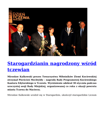 Starogardzianin nagrodzony wśród tczewian Mirosław Kalkowski prezes Towarzystwa Miłośników Ziemi Kociewskiej otrzymał Pierścień Mechtyldy – nagrodę Rady Programowej Kociewskiego Kantoru Edytorskiego w Tczewie. Wyróżnienie odebrał 30 stycznia podczas uroczystej sesji Rady Miejskiej, organizowanej co roku z okazji powrotu miasta Tczewa do Macierzy. Mirosław Kalkowski urodził się w Starogardzie, ukończył starogardzkie Liceum Ekonomiczne oraz studia w tym kierunku w Sopocie, następnie podjął pracę zawodową w Starogardzie, z którym jest związany do dzisiaj. Od wczesnych lat należał do ZHP. Był założycielem wędrownej drużyny turystycznej przy SM „Kociewie”. W 1987 r. wstąpił do Towarzystwa Miłośników Ziemi Kociewskiej, któremu prezesuje od 1997 r. Ściśle współpracował przy organizacji kolejnych Kongresów Kociewskich. Zadbał m.in. o pełne udokumentowanie działań kongresowych poprzez zgromadzenie wszelkich materiałów związanych z tym wydarzeniem, które zamieścił w Księdze Pamiątkowej III (wyd. 2010 r.) i IV (wyd. 2013 r.) Kongresu Kociewskiego – obszernych wydawnictwach starannie przygotowanych pod jego redakcją. Merytoryczną i organizacyjną pomoc okazuje Trójmiejskiemu Klubowi Kociewiaków (od chwili powstania w 2005 r.). Wniósł znaczący wkład w organizowanie prestiżowych imprez, które towarzyszyły ważnym wydarzeniom i rocznicom miejskim i regionalnym. Dzięki stałej współpracy z mediami popularyzuje regionalizm kociewski oraz dba o bieżącą informację w mediach na temat pracy TMZK w środowisku miasta i regionu. Jako zapalony filokartysta, kolekcjoner pamiątek i zbieracz starych druków zgromadził spory ich zasób, którego część sukcesywnie udostępnia publicznie: na wystawach kolekcjonerskich, ekspozycjach ulicznych (okna wystawowe, plansze), kalendarzach, folderach oraz w postaci ciekawych albumów starych widokówek: Pozdrowienia z Powiatu Starogardzkiego i Pozdrowienia z Kociewia (dwa wydania). Unikalne fotografie ze swoich zbiorów udostępnił też do zilustrowania różnych pozycji wydawniczych. Wieloletnia działalność społeczna oraz zaangażowanie w ruchu regionalnym – połączone z pasją kolekcjonera i dokumentalisty – zostały wysoko ocenione przez władze lokalne i gremia opiniotwórcze, co znalazło odbicie w nominacji do nagród: Starosty Powiatu Starogardzkiego i „Wierzyczanki” – wyróżnienia Prezydenta Miasta Starogardu Gd. Wyróżnienie wręczył mu przewodniczący Rady Programowej KKE Kazimierz Ickiewicz, przewodniczący Rady Miejskiej Mirosław Augustyn oraz dyrektor Miejskiej Biblioteki Publicznej w Tczewie Krzysztof Korda. Regulamin Pierścienia Mechtyldy stanowi, że jest to wyróżnienie przyznawane autorom publikującym na łamach kwartalnika „Kociewski Magazyn Regionalny” oraz innych pism pomorskich i krajowych. Wyróżnienie jest przyznawane za dokonania literackie, wyróżniającą publicystykę, interesujący dorobek w dziedzinie edukacji regionalnej. Fizycznym wyobrażeniem wyróżnienia jest sygnet pierścieniowy wytworzony ze szlachetnego metalu, przedstawiający zminiaturyzowaną pieczęć księżnej Mechtyldy, małżonki tczewskiego Sambora II. Dokumentem potwierdzającym przyznanie wyróżnienia jest ozdobny dyplom z odciskiem pieczęci lakowej księżnej Mechtyldy naturalnej wielkości. – To szczególne wyróżnienie dla mnie z wielu względów – powiedział Mirosław Kalkowski. – Cieszę się, że dostrzeżono i doceniono w Tczewie moje działania dla zachowania dorobku kociewskiego regionu i dokonania publicystyczne. Jestem dumny, że znalazłem się wśród laureatów tego prestiżowego wyróżnienia. Jak wynika z mojej ewidencji, jestem 33 osobą „zaślubioną” księżnej Mechtyldzie w okresie 10 lat istnienia tego wyróżnienia, a zarazem drugim starogardzianinem, gdyż jednym z pierwszych laureatów Pierścienia jest Ryszard Szwoch, sekretarz TMZK. Podczas sesji Rada Miejska Tczewa nadała tytuł Honorowego Obywatela Miasta dwóm profesorom: Grzegorzowi Kołotko i Janowi Strelau, których życie było i jest związane z Tczewem. Dodatkowo Medalem „Pro Domo Trsoviensi” uhonorowano troje tczewian. [Fot. Towarzystwo Miłośników Ziemi Kociewskiej] ngg_shortcode_0_placeholder” order_by=”sortorder” order_direction=”ASC” returns=”included” maximum_entity_count=”500″]