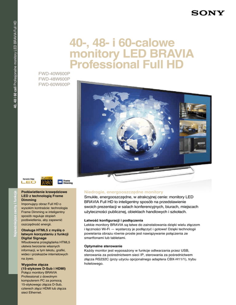 40, 48 i 60 cali Profesjonalne monitory LED BRAVIA Full HD Najważniejsze cechy i funkcje 40-, 48- i 60-calowe monitory LED BRAVIA Professional Full HD FWD-40W600P FWD-48W600P FWD-60W600P Podświetlenie krawędziowe LED z technologią Frame Dimming Imponujący obraz Full HD o wysokim kontraście: technologia Frame Dimming w inteligentny sposób reguluje stopień podświetlenia, aby zapewnić oszczędność energii. Obsługa HTML5 z myślą o łatwym korzystaniu z funkcji Digital Signage Wbudowana przeglądarka HTML5 ułatwia tworzenie własnych informacji, w tym tekstu, grafiki, wideo i przekazów internetowych na żywo. Wygodne złącza (15-stykowe D-Sub i HDMI) Połącz monitory BRAVIA Professional z dowolnym komputerem PC za pomocą 15-stykowego złącza D-Sub, czterech złącz HDMI lub złącza sieci Ethernet. Niedrogie, energooszczędne monitory Smukłe, energooszczędne, w atrakcyjnej cenie: monitory LED BRAVIA Full HD to inteligentny sposób na przedstawienie swoich prezentacji w salach konferencyjnych, biurach, miejscach użyteczności publicznej, obiektach handlowych i szkołach. Łatwość konfiguracji i podłączenia Lekkie monitory BRAVIA są łatwe do zainstalowania dzięki wielu złączom i łączności Wi-Fi — wystarczy je podłączyć i gotowe! Dzięki technologii powielania obrazu równie proste jest nawiązywanie połączenia ze smartfonami lub tabletami. Optymalne sterowanie Każdy monitor jest wyposażony w funkcje odtwarzania przez USB, sterowania za pośrednictwem sieci IP, sterowania za pośrednictwem złącza RS232C (przy użyciu opcjonalnego adaptera CBX-H11/1), trybu hotelowego. 40, 48 i 60 cali Profesjonalne monitory LED BRAVIA Full HD Funkcje Energooszczędny panel LCD Podświetlenie LED panelu pobiera mniej energii niż konwencjonalne podświetlanie fluorescencyjne. Technologia Frame Dimming w inteligentny sposób analizuje zawartość obrazu, regulując podświetlanie, co zapewnia jeszcze większą oszczędność energii. Wbudowana przeglądarka HTML5 do obsługi Digital Signage Dzięki wbudowanej przeglądarce HTML5 w monitorach BRAVIA Professional możliwe jest tworzenie własnych materiałów typu Digital Signage, a także przesyłanie ich na monitory znajdujące się na całym świecie. Możliwe jest wyświetlanie tekstu, grafiki, wideo, a nawet przekazów internetowych na żywo — bez potrzeby stosowania dedykowanego urządzenia zewnętrznego. Dostosuj ustawienia wyświetlania do swoich potrzeb, korzystając z trybu hotelowego Dostosuj ustawienia i funkcje wyświetlania do swoich indywidualnych wymagań. Ustawienia te można zapisać i kopiować z jednego monitora na inny przy użyciu pamięci USB flash. Smukła, lekka konstrukcja Zwiększ atrakcyjność środowiska biznesowego lub przestrzeni publicznej dzięki stylowej konstrukcji monitorów BRAVIA i ich supersmukłej ramce o szerokości zaledwie 16 mm. Wszystkie nasze najnowsze monitory są znacznie lżejsze od poprzednich modeli. Wbudowany odtwarzacz multimedialny Profesjonalne monitory BRAVIA obsługują łącznie 37 różnych formatów plików, co umożliwia bezproblemowe odtwarzanie filmów i innych materiałów multimedialnych dzięki wbudowanej pamięci USB flash. Przyjazny interfejs zapewniający łatwy dostęp i kontrolę Wybierz wejścia, zarządzaj podłączonymi urządzeniami i z łatwością dostosuj ustawienia wyświetlania dzięki nowemu, intuicyjnemu interfejsowi graficznemu. Bardziej płynny i ostry obraz Zaawansowana technologia przetwarzania obrazu Motionflow XR umożliwia precyzyjne odtwarzanie dynamicznych materiałow wideo lub animacji, zapewniając większy komfort ich oglądania. Zapewniający oszczędność energii czujnik światła Jasność obrazu jest automatycznie regulowana w celu dostosowania jej do otaczających warunków oświetleniowych. Pozwala to zmniejszyć pobór energii bez wpływu na jakość obrazu. Powielanie obrazu ze smartfonów i tabletów Przenieś materiały ze swojego smartfonu lub tabletu na ekran monitora, aby odtwarzać filmy, wyświetlać zdjęcia itp. Jest to możliwe dzięki złączu Ethernet i wbudowanemu modułowi Wi-Fi, które pozwalają na łatwe nawiązanie przewodowego lub bezprzewodowego połączenia z Internetem. Przeglądarka internetowa Wbudowana przeglądarka umożliwia nawiązanie połączenia z Internetem w celu uruchamiania aplikacji i przeglądania stron internetowych. Do sterowania kursorem na ekranie i wprowadzania tekstu można wykorzystać smartfon lub tablet (wymaga to pobrania bezpłatnej aplikacji TV SideView, współpracującej z systemem iOS/Android). Obsługa aplikacji Skype Ciesz się doskonałą jakością HD wideopołączeń przez Internet dzięki aplikacji Skype (wymagane jest opcjonalne wyposażenie: kamera/mikrofon CMU-BR200). Uniwersalne opcje sterowania Steruj monitorami BRAVIA Professional zdalnie — m.in. funkcjami włączania/wyłączania, wybierania sygnału wejściowego i regulacji głośności — za pośrednictwem sieci IP (złącze RJ45), interfejsu WEB API lub złącza RS-232C. (Do sterowania przy użyciu złącza RS-232C niezbędny jest opcjonalny konwerter HDMI — CBX-H11/1). Przyjazny w instalacji Ten płaski i elegancki monitor oferuje szeroką gamę opcji montażu, a ponadto dobrze współgra z każdym środowiskiem biurowym, handlowym lub edukacyjnym. Interaktywność Zamień swój profesjonalny monitor BRAVIA w interaktywny ekran dotykowy, korzystając z nakładek U-Touch. Zaprojektowane z myślą o doskonałym dopasowaniu do ekranów monitorów BRAVIA nakładki umożliwiają łatwą konfigurację i zapewniają dostępność 6 punktów dotykowych typu multi-touch w celu zwiększenia zakresu interakcji. Idealny do następujących zastosowań: • Firmowe prezentacje • Digital Signage • Wideokonferencje • Edukacja Wyraźny, czysty obraz Full HD zachwyci Twoją widownię swoją szczegółowością Specyfikacje FWD-40W600P Tuner Typ przyciemniania Typ podświetlenia Urządzenie Rozmiar ekranu 
