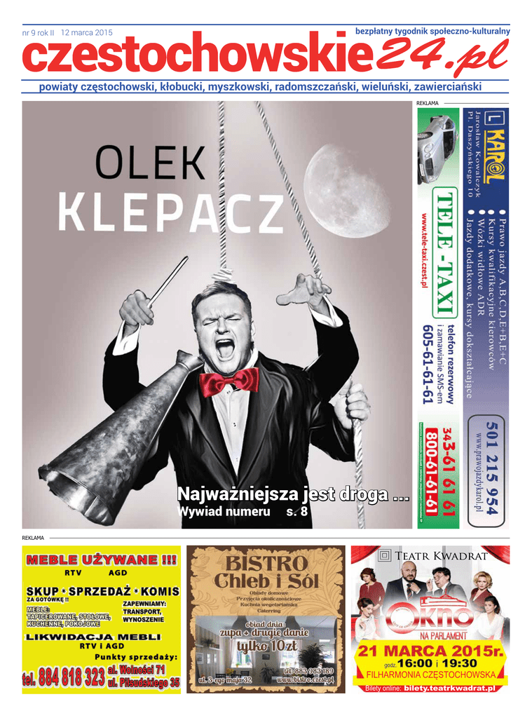 bezpłatny tygodnik społeczno-kulturalny nr 9 rok II 12 marca 2015 powiaty częstochowski, kłobucki, myszkowski, radomszczański, wieluński, zawierciański REKLAMA Najważniejsza jest droga ... Wywiad numeru s. 8 REKLAMA FILHARMONIA CZĘSTOCHOWSKA Bilety online: bilety.teatrkwadrat.pl Rozmowa numeru Olek Klepacz: - Najważniejsza jest droga ... Choć przez chwilę trzeba mnie poznać, by zrozumieć….lub posłuchać by nabrać ciekawości kim naprawdę jestem”. Kim jesteś? - Zacytowałaś motto mojej pierwszej i jedynej jak do tej pory, solowej płyty Olek Klepacz NEUROTYKI, która miała premierę półtora roku temu. Kim naprawdę jestem? Myślę, że szukam swojego miejsca, sensu i próbuje sobie odpowiedzieć na pytanie, czy to wszystko ma sens. Ostatnio przeczytałem wywiad z moim mistrzem - Wojciechem Młynarskim, który uważa, że to wszystko jednak ma sens - Absolutnie. Skoro on tak twierdzi, to ja mu wierzę. Jest dużo osób mądrzejszy ode mnie i czasem wolę się posiłkować wnioskami, które ktoś już sformułował, to skraca czas dochodzenia do prawdy. Nie wyważasz otwartych drzwi, ale życie tak naprawdę upływa na różnych poszukiwaniach. Może nawet na nich polega? Co jest ważniejsze, cel czy droga? - Droga…osiągnięcie celu w konsekwencji może być również frustracją, poza tym spełnienie dla artysty początkiem końca jest :) A może początek czegoś nowego, nowe drzwi? - Masz rację, ale droga musi być. Ona jest dla mnie sensem, wartością samą w sobie. Całe nasze życie to droga. Zdzieramy buty i oby dało się je zmieniać jak najczęściej. Powiem tak, jak wybieram się z punktu A do punktu B, mówię o podróży dosłownej.... ...prozaicznej, nie metaforycznej - Tak! To czas od A do B jest najbardziej interesujący, niestety ani A nie jest takie jakiego oczekiwałem ani B, spełnienie daje pomiędzy. Wiele moich piosenek powstaje w tej przestrzeni, w tym czasie, wiele koncepcji rodzi się i to jest ekscytujące - sublimacja wolności. Fajnie, że o tym mówimy, niestety rzadko kto o to pyta. A to się przekłada na teksty, na piosenki, sam o tym mówisz. Czy pamiętasz w ogóle Olka Klepacza „przed muzycznego”? - Nie, nigdy tak nie było. Jak sięgnę pamięcią to muzyka zawsze była w domu i nie wyobrażałem sobie innej drogi. Tata gra, Dziadek grał. Dziadek zresztą był bardzo dobrym organistą, bardzo emocjonalnie interpretował muzykę. Jeździłem z nim na koncerty, będąc małym brzdącem. Myślę, że wtedy po raz pierwszy poczułem język emocji, jaki daje sztuka. Macie wspólną drogę? - Mamy. To, co nas łączy i to w jaki sposób jesteśmy w stanie tolerować swoje słabości, jest naszą drogą. Uczyliście się tego? - Myślę, że każde z nas na swój sposób tak. A później, to już kwestia tego czy wchodząc w związek starasz się sobie coś tym udowodnić, czy też starasz się kochać drugiego człowieka z jego słabościami, dając mu szansę bycia innym. Najgorzej, jeśli starasz się go sformatować. To jest początek końca. Formatujesz na wzór i podobieństwo. To się raczej nie udaje, ludzie wtedy od siebie uciekają. Trzeba budować na bazie przyjaźni? - To jest kwintesencja. Jedyny przyjaciel, jakiego posiadam na świecie, to właśnie moja Żona. Sprawdzony przyjaciel? - Wiele razy sprawdzony, mam nadzieję że Ona mogłaby powiedzieć o mnie w ten sam sposób, szczególnie w tej przestrzeni, którą wspólnie tworzymy. Mówię tu o Przedszkolu, o edukacji dzieci. Dla nas to była i jest fundamentalna sprawa. Kiedy zaczynaliśmy, założyliśmy sobie, że nie będziemy formatować kulturowo naszych podopiecznych, będziemy pielęgnować w nich dzieci, wzmacniać je i edukować z poszanowaniem ich autonomii, z całą paletą wrażliwości, naiwności i ufności dla świata, której nam dorosłym tak brakuje, zasady przyczynowo - skutkowej, jest czas na nieograniczoną zabawę, ale też czas w którym stawiamy granice, dzięki czemu maluch ma poczucie bezpieczeństwa. Są dwa typy rodziców, pierwszy, który dziecko ma dla siebie-wizytówka, drugi, który czerpie radość z odrębności i autonomii dziecka. Janusz Korczak o tym mówił, że nie dla siebie się ma dzieci. Skoro rozmawiamy o wychowaniu, to chciałabym zapytać o jeszcze j e d n o p o d z i ę ko wanie. Dziękujesz rodzicom, że jesteś taki jaki jesteś. Co masz od nich? - Dostałem od nich miłość, zaufanie i wiarę w siebie. Umiejętność dzielenia się z innymi też? - Dzielenie się z innymi to konsekwencja. Czym się to objawia? Co jest dla ciebie takie ważne, co cię trzyma w pionie? - Oczywiście kręgosłup moralny, fundamentalne rzeczy, co dobre, co złe.Takie rzeczy wynosi się z domu. Później oczywiście była weryfikacja, którą sam przeprowadziłem, ale kręgosłup moralny zawdzięczam rodzicom. Życie też to weryfikuje i sprawdza nie raz i nie dwa. - Życie jest pełne pokus i łatwych rozwiązań które jednak nie dają satysfakcji. Ważne, by pamiętać - nie jestem idealny, mieć pokorę wobec ludzi i cieszyć się małymi rzecza- Pomaga się komunikować? …kwintesencja komunikacji niewerbalnej. Ludzie boją się chodzić na wystawy, wernisaże, bo trzeba będzie się wyrazić o tym co zobaczą, podzielić się refleksją, a kwintesencją jest to, co czujemy patrząc - nie trzeba nic mówić. Można też bardziej akademicko, próbować znaleźć punkty odniesienia: dlaczego, po co i skąd, ale ja tego nie potrzebuje, co nie znaczy, że ignoruję twórce i tworzywo... słowami zasłonić to, co istotne? - Właśnie! Istotne, że jestem wzruszony, podniecony, boję się - jestem w jakimś stanie, bo to co widzę, słyszę mnie dotyka, porusza. Sztuka jest po to, żeby budzić emocje, zmieniać nas i świat. Aby nie pozostawiała nas obojętnymi. - Te słowa:) Chciałabym jeszcze na chwilę wrócić do twojej solowej płyty. Konkretnie do podziękowania, które na niej zamieściłeś. One są szczególne. Dzię