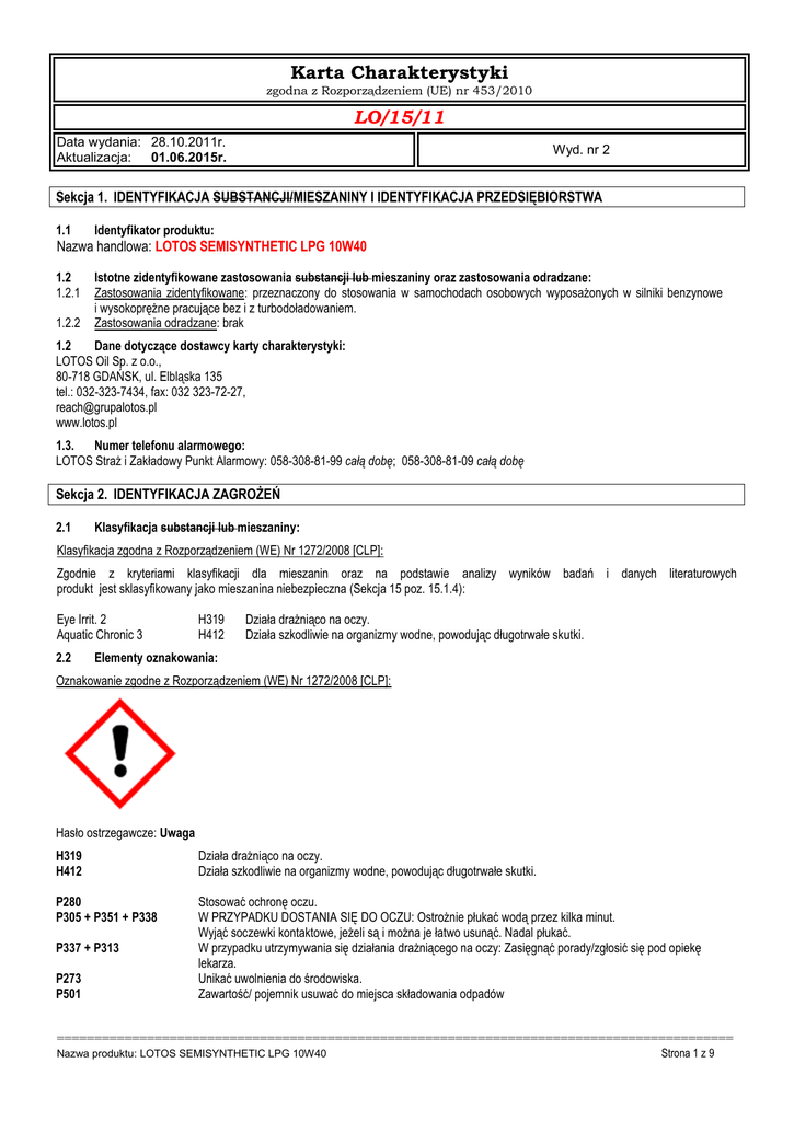 Karta Charakterystyki zgodna z Rozporządzeniem (UE) nr 453/2010 LO/15/11 Data wydania: 28.10.2011r. Aktualizacja: 01.06.2015r. Wyd. nr 2 Sekcja 1. IDENTYFIKACJA SUBSTANCJI/MIESZANINY I IDENTYFIKACJA PRZEDSIĘBIORSTWA 1.1 Identyfikator produktu: Nazwa handlowa: LOTOS SEMISYNTHETIC LPG 10W40 1.2 1.2.1 1.2.2 Istotne zidentyfikowane zastosowania substancji lub mieszaniny oraz zastosowania odradzane: Zastosowania zidentyfikowane: przeznaczony do stosowania w samochodach osobowych wyposażonych w silniki benzynowe i wysokoprężne pracujące bez i z turbodoładowaniem. Zastosowania odradzane: brak 1.2 Dane dotyczące dostawcy karty charakterystyki: LOTOS Oil Sp. z o.o., 80-718 GDAŃSK, ul. Elbląska 135 tel.: 032-323-7434, fax: 032 323-72-27, [email protected] www.lotos.pl 1.3. Numer telefonu alarmowego: LOTOS Straż i Zakładowy Punkt Alarmowy: 058-308-81-99 całą dobę; 058-308-81-09 całą dobę Sekcja 2. IDENTYFIKACJA ZAGROŻEŃ 2.1 Klasyfikacja substancji lub mieszaniny: Klasyfikacja zgodna z Rozporządzeniem (WE) Nr 1272/2008 [CLP]: Zgodnie z kryteriami klasyfikacji dla mieszanin oraz na podstawie analizy wyników badań i danych literaturowych produkt jest sklasyfikowany jako mieszanina niebezpieczna (Sekcja 15 poz. 15.1.4): Eye Irrit. 2 Aquatic Chronic 3 2.2 H319 H412 Działa drażniąco na oczy. Działa szkodliwie na organizmy wodne, powodując długotrwałe skutki. Elementy oznakowania: Oznakowanie zgodne z Rozporządzeniem (WE) Nr 1272/2008 [CLP]: Hasło ostrzegawcze: Uwaga H319 H412 Działa drażniąco na oczy. Działa szkodliwie na organizmy wodne, powodując długotrwałe skutki. P280 P305 + P351 + P338 Stosować ochronę oczu. W PRZYPADKU DOSTANIA SIĘ DO OCZU: Ostrożnie płukać wodą przez kilka minut. Wyjąć soczewki kontaktowe, jeżeli są i można je łatwo usunąć. Nadal płukać. W przypadku utrzymywania się działania drażniącego na oczy: Zasięgnąć porady/zgłosić się pod opiekę lekarza. Unikać uwolnienia do środowiska. Zawartość/ pojemnik usuwać do miejsca składowania odpadów P337 + P313 P273 P501 ========================================================================================== Nazwa produktu: LOTOS SEMISYNTHETIC LPG 10W40 Strona 1 z 9 Karta Charakterystyki zgodna z Rozporządzeniem (UE) nr 453/2010 LO/15/11 Data wydania: 28.10.2011r. Aktualizacja: 01.06.2015r. 2.3 Wyd. nr 2 Inne zagrożenia: Mieszanina nie spełnia kryteriów PBT ani vPvB. W przypadku awarii urządzeń pracujących w wysokich temperaturach i ciśnieniach istnieje możliwość wniknięcia produktu przez skórę do tkanek podskórnych. Podczas prac z gorącym produktem istnieje niebezpieczeństwo oparzeń termicznych. Produkt może powodować podrażnienie układu oddechowego w przypadku, gdy występuje w postaci mgły olejowej lub w postaci gorących oparów, lub po połknięciu. Badania przeprowadzone dla podobnych produktów nie wykazały działań szkodliwych dla oczu lub wykazały występowanie lekkich podrażnień. Sekcja 3. SKŁAD / INFORMACJA O SKŁADNIKACH 3.1 Substancje: 3.2 Mieszaniny: Numer CAS rejestracji WE Stężenie [% m/m] Nazwa substancji 01-2119543726-33 93819-94-4 298-577-9 ≤ 2,16 Zinc bis[O-(6-methylheptyl)] bis[O(sec-butyl)]bis(dithiophosphate) 01-2119513207-49 121158-58-5 310-154-3 ≤ 0,20 Phenol, dodecyl-, branched 01-2119524004-56 68784-26-9 272-234-3 ≤ 0,91 Phenol, dodecyl-,sulfurized, carbonates, calcium salts, overbased *Rozporządzenie Klasyfikacja substancji zgodna z Rozporządzeniem CLP* Skin Irrit.2 H315 Eye Dam.1 H318 Aquatic Chronic 2 H411 Skin Irrit.2 H315; Eye Dam.1 H318 Rep.2 H361f Aquatic Acute 1 H400 Aquatic Chronic 1 H410; M(Acute)=10, M(Chronic)=10 Aquatic Chronic 4 H413 (WE) Nr 1272/2008 Sekcja 4. ŚRODKI PIERWSZEJ POMOCY 4.1 Opis środków pierwszej pomocy: Przez drogi oddechowe: Jeśli obserwuje się szkodliwy wpływ oparów na poszkodowanego, należy wyprowadzić lub wynieść go z zagrożonego miejsca na świeże powietrze. Zdjąć zanieczyszczoną odzież. Zapewnić poszkodowanemu spokój i ciepło (okryć kocami). Kontrolować jego oddech i tętno. Przy występowaniu zaburzeń w oddychaniu podawać tlen. W przypadku zatrzymania oddechu stosować sztuczne oddychanie za pomocą aparatu AMBU, po uprzednim oczyszczeniu jamy ustnej z ciał obcych i śluzu. Jeżeli stanie się to konieczne, wykonać masaż serca. W przypadku kontaktu ze skórą: Zdjąć zanieczyszczoną odzież. Miejsce kontaktu, a w razie potrzeby całe ciało, należy dokładnie umyć wodą z mydłem, o ile nie ma oparzeń gorącym produktem. Do mycia nie wolno używać rozpuszczalników organicznych takich jak: nafta, lekkie destylaty czy benzyna. W przypadku kontaktu gorącego produktu ze skórą oparzone miejsce należy natychmiast zanurzyć w zimnej wodzie lub poddawać działaniu strumienia bieżącej zimnej wody przez co najmniej 10 minut. Jeśli produkt wniknął pod ciśnieniem do tkanek podskórnych, należy natychmiast udzielić poszkodowanemu pomocy medycznej. Po dostaniu się do oczu: Należy ostrożnie przemywać je wodą przez kilka minut. Jeśli to możliwe i łatwe do wykonania, wyjąć poszkodowanemu soczewki kontaktowe. Kontynuować przemywanie. W przypadku wystąpienia i utrzymywania się podrażnienia, niewyraźnego widzenia lub obrzęku, należy zwrócić się do specjalisty. Uwaga! Osoby narażone na skażenie oczu powinny być pouczone o konieczności i sposobie ich natychmiastowego płukania. ========================================================================================== Nazwa produktu: LOTOS SEMISYNTHETIC LPG 10W40 Strona 2 z 9 Karta Charakterystyki zgodna z Rozporządzeniem (UE) nr 453/2010 LO/15/11 Data wydania: 28.10.2011r. Aktualizacja: 01.06.2015r. Wyd. nr 2 Spożycie / aspiracja: Nie należy wywoływać wymiotów, gdyż istnieje możliwość przedostania się produktu do dróg oddechowych, co może powodować zachłystowe zapalenie płuc, a to wymaga natychmiastowego leczenia. W przypadku zanieczyszczenia jamy ustnej w