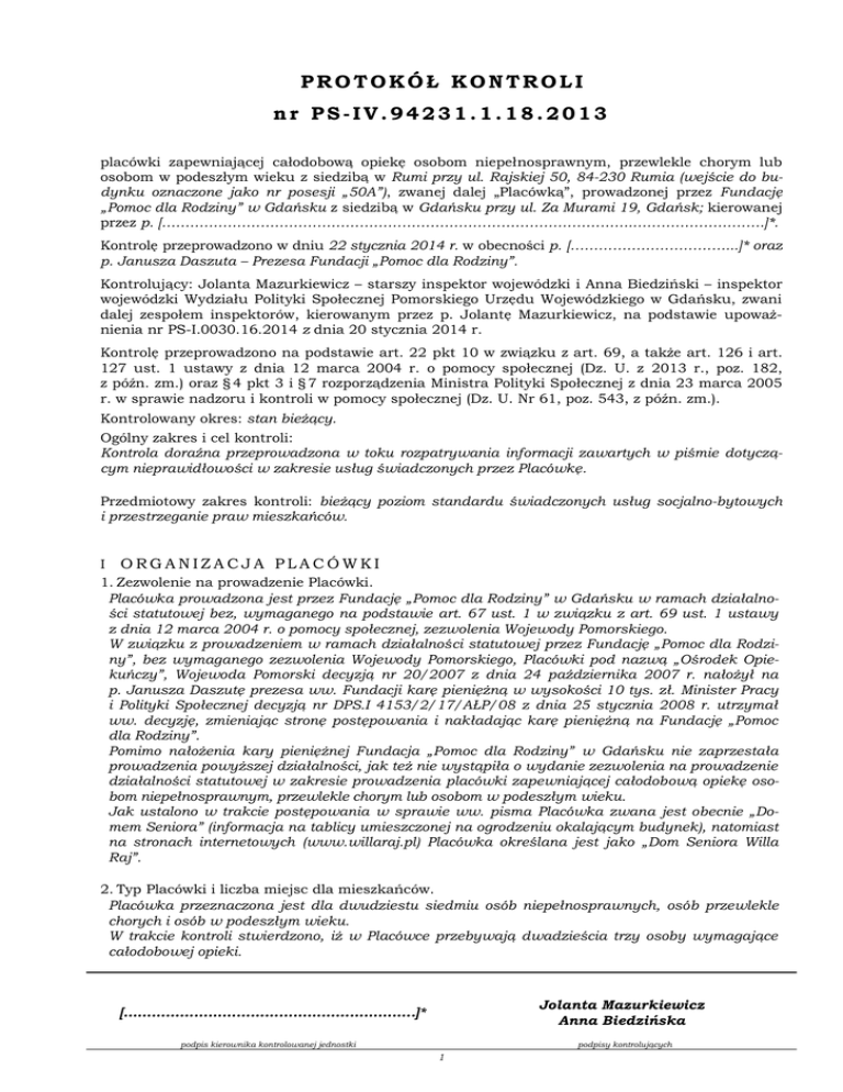 PROTOKÓŁ KONTROLI nr PS-IV.94231.1.18.2013 placówki zapewniającej całodobową opiekę osobom niepełnosprawnym, przewlekle chorym lub osobom w podeszłym wieku z siedzibą w Rumi przy ul. Rajskiej 50, 84-230 Rumia (wejście do budynku oznaczone jako nr posesji „50A”), zwanej dalej „Placówką”, prowadzonej przez Fundację „Pomoc dla Rodziny” w Gdańsku z siedzibą w Gdańsku przy ul. Za Murami 19, Gdańsk; kierowanej przez p. [……………………………………………………………………………………….……………………….]*. Kontrolę przeprowadzono w dniu 22 stycznia 2014 r. w obecności p. [……………………………...]* oraz p. Janusza Daszuta – Prezesa Fundacji „Pomoc dla Rodziny”. Kontrolujący: Jolanta Mazurkiewicz – starszy inspektor wojewódzki i Anna Biedziński – inspektor wojewódzki Wydziału Polityki Społecznej Pomorskiego Urzędu Wojewódzkiego w Gdańsku, zwani dalej zespołem inspektorów, kierowanym przez p. Jolantę Mazurkiewicz, na podstawie upoważnienia nr PS-I.0030.16.2014 z dnia 20 stycznia 2014 r. Kontrolę przeprowadzono na podstawie art. 22 pkt 10 w związku z art. 69, a także art. 126 i art. 127 ust. 1 ustawy z dnia 12 marca 2004 r. o pomocy społecznej (Dz. U. z 2013 r., poz. 182, z późn. zm.) oraz § 4 pkt 3 i § 7 rozporządzenia Ministra Polityki Społecznej z dnia 23 marca 2005 r. w sprawie nadzoru i kontroli w pomocy społecznej (Dz. U. Nr 61, poz. 543, z późn. zm.). Kontrolowany okres: stan bieżący. Ogólny zakres i cel kontroli: Kontrola doraźna przeprowadzona w toku rozpatrywania informacji zawartych w piśmie dotyczącym nieprawidłowości w zakresie usług świadczonych przez Placówkę. Przedmiotowy zakres kontroli: bieżący poziom standardu świadczonych usług socjalno-bytowych i przestrzeganie praw mieszkańców. I ORGANIZACJA PLACÓWKI 1. Zezwolenie na prowadzenie Placówki. Placówka prowadzona jest przez Fundację „Pomoc dla Rodziny” w Gdańsku w ramach działalności statutowej bez, wymaganego na podstawie art. 67 ust. 1 w związku z art. 69 ust. 1 ustawy z dnia 12 marca 2004 r. o pomocy społecznej, zezwolenia Wojewody Pomorskiego. W związku z prowadzeniem w ramach działalności statutowej przez Fundację „Pomoc dla Rodziny”, bez wymaganego zezwolenia Wojewody Pomorskiego, Placówki pod nazwą „Ośrodek Opiekuńczy”, Wojewoda Pomorski decyzją nr 20/2007 z dnia 24 października 2007 r. nałożył na p. Janusza Daszutę prezesa ww. Fundacji karę pieniężną w wysokości 10 tys. zł. Minister Pracy i Polityki Społecznej decyzją nr DPS.I 4153/2/17/AŁP/08 z dnia 25 stycznia 2008 r. utrzymał ww. decyzję, zmieniając stronę postępowania i nakładając karę pieniężną na Fundację „Pomoc dla Rodziny”. Pomimo nałożenia kary pieniężnej Fundacja „Pomoc dla Rodziny” w Gdańsku nie zaprzestała prowadzenia powyższej działalności, jak też nie wystąpiła o wydanie zezwolenia na prowadzenie działalności statutowej w zakresie prowadzenia placówki zapewniającej całodobową opiekę osobom niepełnosprawnym, przewlekle chorym lub osobom w podeszłym wieku. Jak ustalono w trakcie postępowania w sprawie ww. pisma Placówka zwana jest obecnie „Domem Seniora” (informacja na tablicy umieszczonej na ogrodzeniu okalającym budynek), natomiast na stronach internetowych (www.willaraj.pl) Placówka określana jest jako „Dom Seniora Willa Raj”. 2. Typ Placówki i liczba miejsc dla mieszkańców. Placówka przeznaczona jest dla dwudziestu siedmiu osób niepełnosprawnych, osób przewlekle chorych i osób w podeszłym wieku. W trakcie kontroli stwierdzono, iż w Placówce przebywają dwadzieścia trzy osoby wymagające całodobowej opieki. Jolanta Mazurkiewicz Anna Biedzińska [……………………………………………………..]* podpis kierownika kontrolowanej jednostki podpisy kontrolujących 1 Protokół nr PS-IV.9423.1.18.2013 z, przeprowadzonej w dniu 22 stycznia 2014 r., kontroli standardu usług świadczonych przez „Dom Seniora Willa Raj” z siedzibą w Rumi przy ul. Rajska 50, 84-230 Rumia. II USŁUGI ZASPOKAJAJĄCE POTRZEBY BYTOWE . 1. Budynek i otoczenie Placówki (bariery architektoniczne). Placówka mieści się w trzykondygnacyjnym budynku zamieszkania zbiorowego w zabudowie jednorodzinnej. W otoczeniu i wewnątrz budynku występują bariery architektoniczne: do wejścia budynku prowadzą schody, brak pochylni, wewnątrz budynku znajdują się liczne schody między kondygnacjami i spocznikami, budynek nie jest wyposażony w windę. Na pierwszej kondygnacji (poziom przyziemia) znajdują się pomieszczenia wspólne (jadalnia), pomieszczenia kuchenne oraz gospodarcze, a także dyżurka pielęgniarska. Pomieszczenia mieszkalne znajdują się na drugiej i trzeciej kondygnacji. Na drugiej kondygnacji znajduje się pokój dziennego pobytu. 2. Pokoje mieszkalne oraz pomieszczenia higieniczno-sanitarne. Placówka dysponuje czternastoma pokojami mieszkalnymi, w tym pięcioma pokojami jednoosobowymi, siedmioma pokojami dwuosobowymi, jednym pokojem trzyosobowym i jednym pokojem pięcioosobowym. Placówka zapewnia mieszkańcom sześć pomieszczeń higieniczno-sanitarnych. Użytkowane pomieszczenia mieszkalne oraz pomieszczenia higieniczno-sanitarne znajdują się na drugiej i trzeciej kondygnacji. Informacja na temat pomieszczeń mieszkalnych stanowi załącznik nr 1 do protokółu. 3. Wyżywienie. W Placówce jest przygotowywanych i wydawanych pięć posiłków: śniadanie, drugie śniadanie, obiad, podwieczorek oraz kolacja. Wszystkie posiłki przygotowywane są przez kucharkę w pomieszczeniach kuchni na terenie Placówki (pierwsza kondygnacja). [………………………………………………………………………………..]* [……………………………………………………………………………………………………………..…………..]* [……………………………………