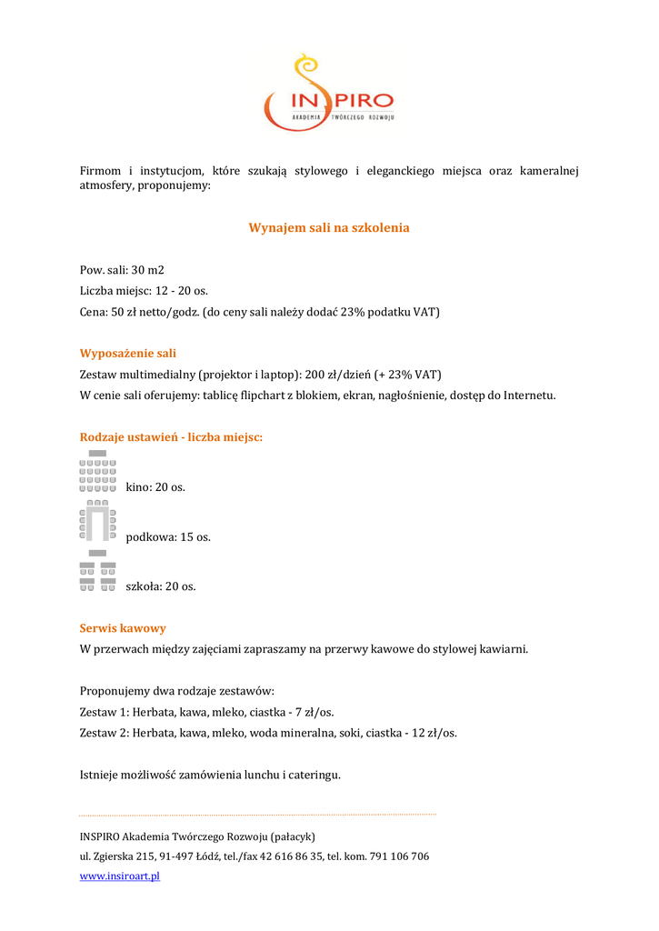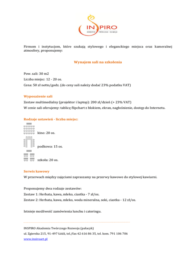 Firmom i instytucjom, które szukają stylowego i eleganckiego miejsca oraz kameralnej atmosfery, proponujemy: Wynajem sali na szkolenia Pow. sali: 30 m2 Liczba miejsc: 12 - 20 os. Cena: 50 zł netto/godz. (do ceny sali należy dodać 23% podatku VAT) Wyposażenie sali Zestaw multimedialny (projektor i laptop): 200 zł/dzień (+ 23% VAT) W cenie sali oferujemy: tablicę flipchart z blokiem, ekran, nagłośnienie, dostęp do Internetu. Rodzaje ustawień - liczba miejsc: kino: 20 os. podkowa: 15 os. szkoła: 20 os. Serwis kawowy W przerwach między zajęciami zapraszamy na przerwy kawowe do stylowej kawiarni. Proponujemy dwa rodzaje zestawów: Zestaw 1: Herbata, kawa, mleko, ciastka - 7 zł/os. Zestaw 2: Herbata, kawa, mleko, woda mineralna, soki, ciastka - 12 zł/os. Istnieje możliwość zamówienia lunchu i cateringu. INSPIRO Akademia Twórczego Rozwoju (pałacyk) ul. Zgierska 215, 91-497 Łódź, tel./fax 42 616 86 35, tel. kom. 791 106 706 www.insiroart.pl
