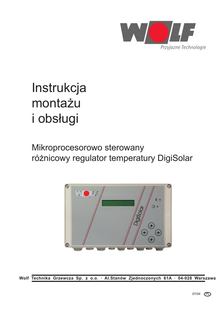 DigiSolar Przyjazne Technologie Technik, die dem Menschen Instrukcja montażu i obsługi Mikroprocesorowo sterowany różnicowy regulator temperatury DigiSolar Wolf Technika Grzewcza Sp. z o.o. · Al.Stanów Zjednoczonych 61A · 04-028 Warszawa 07/04 PL 1 Spis treści DigiSolar 1 Zastosowanie / Cechy .......................................................................................................................... 3 2 Wskazówki bezpieczeństwa ................................................................................................................. 4 3 Znaczenie skrótów i znaków ................................................................................................................ 4 4 Główne tryby pracy .............................................................................................................................. 5 4.1 Tryb “Ustawienie podstawowe“ ............................................................................................. 5 4.2 Tryb “Wskazania“ .................................................................................................................. 6 4.3 Tryb "Informacja” ................................................................................................................... 6 4.4 Tryb “Praca ręczna” .............................................................................................................. 7 4.5 Tryb “Programowanie” .......................................................................................................... 7 4.6 Struktura menu ..................................................................................................................... 8 5 Obsługa / Wskazania ................................................................................................................... 8 5.1 Obsługa ................................................................................................................................. 8 5.2 Wskazania ............................................................................................................................ 9 6 Ogólne funkcje regulatora .................................................................................................................. 10 6.1 Funkcja chłodzenia ............................................................................................................. 10 6.2 Funkcja ochrony kolektora / schładzanie ........................................................................... 10 6.3 Praca równoległa zasobników ciepła ...................................................................................11 6.4 Regulacja prędkości obrotowej ............................................................................................11 6.5 Sterowanie priorytetem zasobników ...................................................................................11 6.6 Pomiar ilości ciepła ..............................................................................................................11 6.7 Zabezpieczenie przed zablokowaniem pompy ................................................................... 12 7 Montaż urządzenia ............................................................................................................................. 12 8 Przyłącze elektryczne......................................................................................................................... 12 8.1 Przyłącze 230V ................................................................................................................... 13 8.2 Przyłączenie czujników ....................................................................................................... 14 9 Plany urządzenia ................................................................................................................................ 14 9.1 Schemat urządzenia - Typ 1 ............................................................................................... 14 9.2 Schemat urządzenia - Typ 2 ............................................................................................... 15 9.3 Schemat urządzenia - Typ 3 ............................................................................................... 15 10 Uruchomienie ..................................................................................................................................... 16 11 Usuwanie usterek ............................................................................................................................... 16 12 Dane techniczne regulatora DigiSolar ................................................................................................ 18 13 Warunki gwarancji .............................................................................................................................. 19 14 Deklaracja zgodności z normami ....................................................................................................... 19 15 Tabela oporności dla czujnika PT1000 .............................................................................................. 19 16 Schemat połączeń układu regulacyjnego ........................................................................................... 20 2 DigiSolar 1 Zastosowanie / Cechy Różnicowy regulator temperatury DigiSolar jest mikroprocesorowo sterowanym urządzeniem do regulacji słonecznych instalacj ciepła. Regulator DigiSolar można zastosować do trzech typów cieplnych instalacji słonecznych. - Urządzęnie jednoobiegowe z jednym polem kolektorów i jednym zasobnikiem ciepła. = typ urządzenia 1 = 1S - Urządzęnie dwuobiegowe z jednym polem kolektorów i dwoma zasobnikami ciepła; praca z dwiema pompami = typ urządzenia 2 = 2S / 2P - Urządzęnie dwuobiegowe z jednym polem kolektorów i dwoma zasobnikami ciepła; praca z jedną pompą i jednym zaworem = typ urządzenia 3 = 2S / 1P / 1V Regulator zna