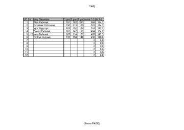 TAB] LP hd 1 2 3 4 5 15 6 7 8 9 10 11 12 Imię Nazwisko Alex Pabiniak Grzesiek Cichowlas Igor Węgrzyn Dawid Pabiniak Irek Stefanek Piotrek Kuźniak 1 gra 2 gra 3 gra suma 1-3 śr 1-3 181 192 211 584 194,7 150 213 160 523 174,3 202 152 164 518 172,7 161 142 191 494 164,7 167 114 161 487 147,3 132 158 148 438 146,0 0 0,0 0 0,0 0 0,0 0 0,0 0 0,0 0 0,0 Strona PAGE]