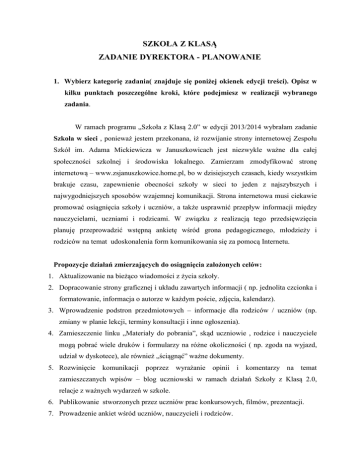 SZKOŁA Z KLASĄ ZADANIE DYREKTORA - PLANOWANIE 1. Wybierz kategorię zadania( znajduje się poniżej okienek edycji treści). Opisz w kilku punktach poszczególne kroki, które podejmiesz w realizacji wybranego zadania. W ramach programu „Szkoła z Klasą 2.0” w edycji 2013/2014 wybrałam zadanie Szkoła w sieci , ponieważ jestem przekonana, iż rozwijanie strony internetowej Zespołu Szkół im. Adama Mickiewicza w Januszkowicach jest niezwykle ważne dla całej społeczności szkolnej i środowiska lokalnego. Zamierzam zmodyfikować stronę internetową – www.zsjanuszkowice.home.pl, bo w dzisiejszych czasach, kiedy wszystkim brakuje czasu, zapewnienie obecności szkoły w sieci to jeden z najszybszych i najwygodniejszych sposobów wzajemnej komunikacji. Strona internetowa musi ciekawie promować osiągnięcia szkoły i uczniów, a także usprawnić przepływ informacji między nauczycielami, uczniami i rodzicami. W związku z realizacją tego przedsięwzięcia planuję przeprowadzić wstępną ankietę wśród grona pedagogicznego, młodzieży i rodziców na temat udoskonalenia form komunikowania się za pomocą Internetu. Propozycje działań zmierzających do osiągnięcia założonych celów: 1. Aktualizowanie na bieżąco wiadomości z życia szkoły. 2. Dopracowanie strony graficznej i układu zawartych informacji ( np. jednolita czcionka i formatowanie, informacja o autorze w każdym poście, zdjęcia, kalendarz). 3. Wprowadzenie podstron przedmiotowych – informacje dla rodziców / uczniów (np. zmiany w planie lekcji, terminy konsultacji i inne ogłoszenia). 4. Zamieszczenie linku „Materiały do pobrania”, skąd uczniowie , rodzice i nauczyciele mogą pobrać wiele druków i formularzy na różne okoliczności ( np. zgoda na wyjazd, udział w dyskotece), ale również „ściągnąć” ważne dokumenty. 5. Rozwinięcie komunikacji poprzez wyrażanie opinii i komentarzy na temat zamieszczanych wpisów – blog uczniowski w ramach działań Szkoły z Klasą 2.0, relacje z ważnych wydarzeń w szkole. 6. Publikowanie stworzonych przez uczniów prac konkursowych, filmów, prezentacji. 7. Prowadzenie ankiet wśród uczniów, nauczycieli i rodziców. 2. Jak zadanie, które wybrałaś odpowiada na potrzeby wyrażone przez nauczycieli na spotkaniu otwierającym? Odnieś się do kilku konkretnych problemów i postulatów zdiagnozowanych podczas spotkania otwierającego. Wybór zadania do realizacji nastąpił po wspólnym przeanalizowaniu przez dyrektora i nauczycieli problemów zgłoszonych na spotkaniu otwierającym w dn. 28. 10. 2013 r. W czasie dyskusji nauczyciele zwrócili uwagę między innymi na mało efektywny kontakt w relacjach: wychowawcy klas- rodzice uczniów. Postulowali, aby w większym stopniu wdrażać uczniów do przygotowywania materiałów na stronę internetową pod opieką nauczycieli i w ten sposób kształtować aktywną, odpowiedzialną postawę młodych ludzi oraz rozwijać ich kompetencje językowe i komunikacyjne. Jeden z nauczycieli zasugerował, iż umożliwienie wyrażania własnych opinii internautów przyczyni się do poprawy komunikacji z odbiorcami i częstego odwiedzania naszej strony internetowej. 3. Podaj przybliżone terminy realizacji poszczególnych zadań, czas ich trwania, napisz kto będzie brał w nim udział i w jakim zakresie. Zadania do realizacji Terminy realizacji zadań Aktualizowanie wiadomości na bieżąco z życia szkoły Dopracowanie strony graficznej informacji Wprowadzenie podstron przedmiotowych, linków Wyrażanie opinii i komentarzy internautów Publikowanie działań uczniów Prowadzenie ankiet, sondaży na bieżąco styczeń przez cały rok przez cały rok styczeń- luty, maj Osoby odpowiedzialne nauczyciel informatyki wszyscy nauczyciele, uczniowie nauczyciel informatykiopiekun strony internetowej nauczyciel informatyki uczniowie, nauczyciele, rodzice uczniowie, nauczyciele dyrektor, nauczyciele, uczniowie, rodzice 4. Jak zamierzasz sprawdzić, że zadanie się udało? Opisz jak zorganizujesz ewaluację przedsięwzięcia, jakie przyjmiesz kryteria. Zaplanuj konkretne metody. Zaplanowana modyfikacja szkolnej strony internetowej nie będzie pierwszą i zapewne ostatnią, bo profesjonalna strona musi podlegać nieustannej ewaluacji w dobie nieustannie zmieniających się warunków technologicznych. Jedną z form ewaluacji przedsięwzięcia będą ankiety wśród uczniów, nauczycieli i rodziców. Przeanalizowanie ich wyników posłuży do wprowadzenia korekty i konkretnych pomysłów na przyszłość. Innym wyznacznikiem skuteczności podjętych działań będzie statystyka zawierająca liczbę odwiedzających naszą stronę w określonym okresie czasu. Zamierzam również na bieżąco zasięgać opinii nauczycieli, uczniów i rodziców na temat prowadzonych działań, organizować konsultacje w różnych grupach, aby integrować społeczność szkolną i wspomagać w realizacji wybranego zadania.