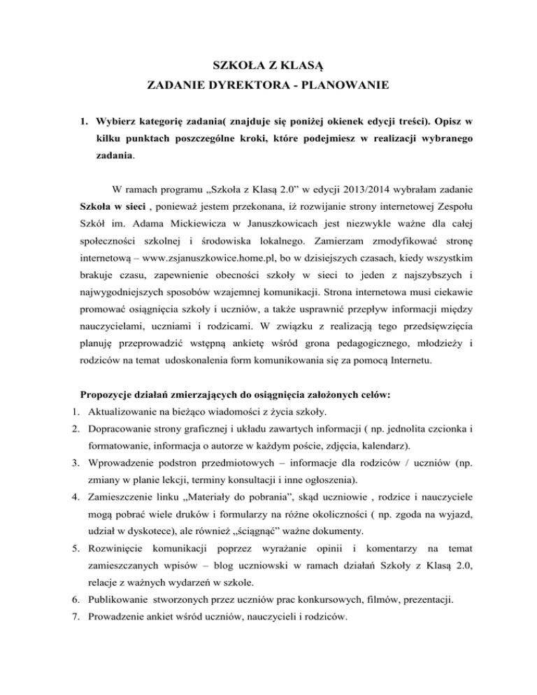 Zadanie dyrektora- planowanie - Zespół Szkół w Januszkowicach
