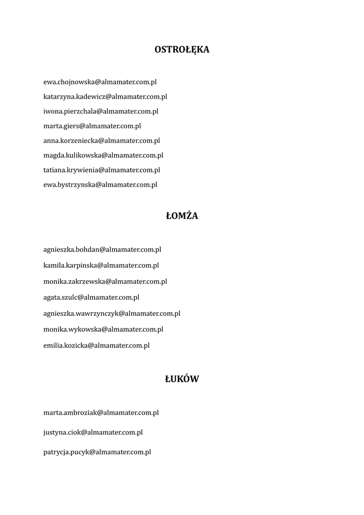 OSTROŁĘKA [email protected] [email protected] [email protected] [email protected] [email protected] [email protected] [email protected] [email protected] ŁOMŻA [email protected] [email protected] [email protected] [email protected] [email protected] [email protected] [email protected] ŁUKÓW [email protected] [email protected] [email protected] [email protected] [email protected] [email protected] [email protected] [email protected] [email protected] [email protected] [email protected] SIEDLCE [email protected] [email protected] [email protected] [email protected] [email protected] [email protected] [email protected] [email protected] [email protected] [email protected]