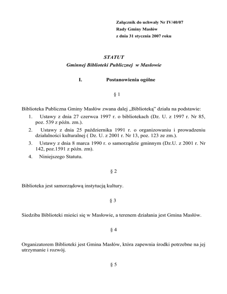 STATUT Gminnej Biblioteki Publicznej w Masłowie I. Postanowienia