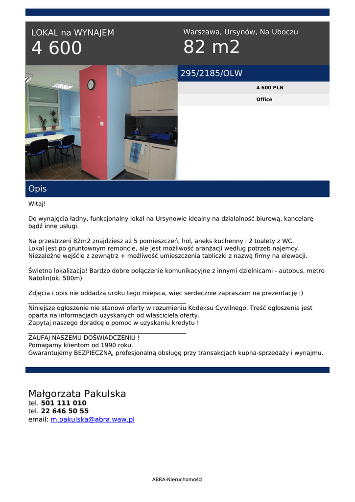 LOKAL na WYNAJEM 4 600 Warszawa, Ursynów, Na Uboczu 82 m2 295/2185/OLW 4 600 PLN Office Opis Witaj! Do wynajęcia ładny, funkcjonalny lokal na Ursynowie idealny na działalność biurową, kancelarę bądź inne usługi. Na przestrzeni 82m2 znajdziesz aż 5 pomieszczeń, hol, aneks kuchenny i 2 toalety z WC. Lokal jest po gruntownym remoncie, ale jest możliwość aranżacji według potrzeb najemcy. Niezależne wejśćie z zewnątrz + możliwość umieszczenia tabliczki z nazwą firmy na elewacji. Świetna lokalizacja! Bardzo dobre połączenie komunikacyjne z innymi dzielnicami - autobus, metro Natolin(ok. 500m) Zdjęcia i opis nie oddadzą uroku tego miejsca, więc serdecznie zapraszam na prezentację :) _____________________________________________________ Niniejsze ogłoszenie nie stanowi oferty w rozumieniu Kodeksu Cywilnego. Treść ogłoszenia jest oparta na informacjach uzyskanych od właściciela oferty. Zapytaj naszego doradcę o pomoc w uzyskaniu kredytu ! _____________________________________________________ ZAUFAJ NASZEMU DOŚWIADCZENIU ! Pomagamy klientom od 1990 roku. Gwarantujemy BEZPIECZNĄ, profesjonalną obsługę przy transakcjach kupna-sprzedaży i wynajmu. Małgorzata Pakulska tel. 501 111 010 tel. 22 646 50 55 email: [email protected] ABRA-Nieruchomości Powered by TCPDF (www.tcpdf.org)