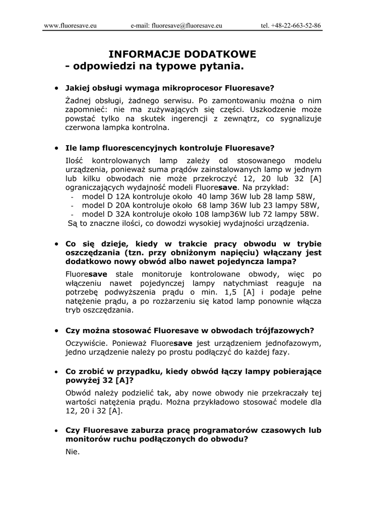 www.fluoresave.eu e-mail: [email protected] tel. +48-22-663-52-86 INFORMACJE DODATKOWE - odpowiedzi na typowe pytania. • Jakiej obsługi wymaga mikroprocesor Fluoresave? Żadnej obsługi, żadnego serwisu. Po zamontowaniu można o nim zapomnieć: nie ma zużywających się części. Uszkodzenie może powstać tylko na skutek ingerencji z zewnątrz, co sygnalizuje czerwona lampka kontrolna. • Ile lamp fluorescencyjnych kontroluje Fluoresave? Ilość kontrolowanych lamp zależy od stosowanego modelu urządzenia, ponieważ suma prądów zainstalowanych lamp w jednym lub kilku obwodach nie może przekroczyć 12, 20 lub 32 [A] ograniczających wydajność modeli Fluoresave. Na przykład: - model D 12A kontroluje około 40 lamp 36W lub 28 lamp 58W, - model D 20A kontroluje około 68 lamp 36W lub 23 lampy 58W, - model D 32A kontroluje około 108 lamp36W lub 72 lampy 58W. Są to znaczne ilości, co dowodzi wysokiej wydajności urządzenia. • Co się dzieje, kiedy w trakcie pracy obwodu w trybie oszczędzania (tzn. przy obniżonym napięciu) włączany jest dodatkowo nowy obwód albo nawet pojedyncza lampa? Fluoresave stale monitoruje kontrolowane obwody, więc po włączeniu nawet pojedynczej lampy natychmiast reaguje na potrzebę podwyższenia prądu o min. 1,5 [A] i podaje pełne natężenie prądu, a po rozżarzeniu się katod lamp ponownie włącza tryb oszczędzania. • Czy można stosować Fluoresave w obwodach trójfazowych? Oczywiście. Ponieważ Fluoresave jest urządzeniem jednofazowym, jedno urządzenie należy po prostu podłączyć do każdej fazy. • Co zrobić w przypadku, kiedy obwód łączy lampy pobierające powyżej 32 [A]? Obwód należy podzielić tak, aby nowe obwody nie przekraczały tej wartości natężenia prądu. Można przykładowo stosować modele dla 12, 20 i 32 [A]. • Czy Fluoresave zaburza pracę programatorów czasowych lub monitorów ruchu podłączonych do obwodu? Nie. www.fluoresave.eu • e-mail: [email protected] Czy Fluoresave żarówkach? obniża zużycie prądu tel. +48-22-663-52-86 w normalnych Nie, ale ich większa ilość w podłączonym do Fluoresave obwodzie zmniejsza oszczędności. Podobnie jest w przypadku obecności w obwodzie lamp ze statecznikami elektronicznymi. • Co może się zdarzyć, kiedy urządzenie zostanie uszkodzone? Nic. Fluoresave posiada wbudowane zabezpieczenie wyłączające urządzenie z sieci. W przypadku awarii urządzenia na skutek działań zewnętrznych lub nagłych znacznych wahań napięcia Fluoresave automatycznie wyłącza się. Równocześnie czerwona lampka sygnalizuje awarię. • Jak rozpoznać, czy urządzenie pracuje poprawnie? Fluoresave posiada 3 lampki kontrolne. Zielona wskazuje pracę w trybie oszczędzania. Inne szczegóły dotyczące obsługi urządzenia podaje Instrukcja Obsługi. • Od jak dawna urządzenie jest produkowane i w których krajach było stosowane? Pierwsze egzemplarze wyprodukowano w Australii w 1996 roku i eksploatowane były w Australii, gdzie nadal pracują, potem w krajach Azji Południowo–Wschodniej i w Afryce Południowej. W Europie Zachodniej sprzedaż rozpoczęła się po zwiększeniu produkcji i ukończeniu przez VDE badań certyfikacyjnych. Obecnie urządzenie stosowane jest w 33 krajach. Kolejna intensyfikacja produkcji umożliwiła z końcem roku 2006 rozpoczęcie promocji w Europie Środkowej i Wschodniej, chociaż ilość dostępnych w sprzedaży urządzeń będzie przez pewien czas ograniczona, ponieważ popyt przewyższa podaż. • Jak długo urządzenie Fluoresave może pracować? Urządzenie nie posiada części zużywających się. Pierwsze egzemplarze pracują już dziesiąty rok i właściwie nie ma powodu, by nie pracowały nadal. • Jaką gwarancję posiada urządzenie? Okres gwarancji wynosi 24 miesiące od daty zakupu, zgodnie z Ustawą o Ochronie Praw Konsumenta.