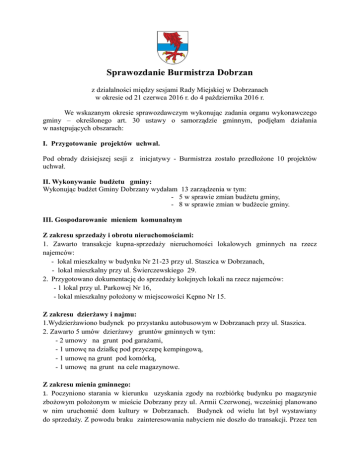 Sprawozdanie Burmistrza Dobrzan z działalności między sesjami Rady Miejskiej w Dobrzanach w okresie od 21 czerwca 2016 r. do 4 października 2016 r. We wskazanym okresie sprawozdawczym wykonując zadania organu wykonawczego gminy – określonego art. 30 ustawy o samorządzie gminnym, podjęłam działania w następujących obszarach: I. Przygotowanie projektów uchwał. Pod obrady dzisiejszej sesji z inicjatywy - Burmistrza zostało przedłożone 10 projektów uchwał. II. Wykonywanie budżetu gminy: Wykonując budżet Gminy Dobrzany wydałam 13 zarządzenia w tym: - 5 w sprawie zmian budżetu gminy, - 8 w sprawie zmian w budżecie gminy. III. Gospodarowanie mieniem komunalnym Z zakresu sprzedaży i obrotu nieruchomościami: 1. Zawarto transakcje kupna-sprzedaży nieruchomości lokalowych gminnych na rzecz najemców: - lokal mieszkalny w budynku Nr 21-23 przy ul. Staszica w Dobrzanach, - lokal mieszkalny przy ul. Świerczewskiego 29. 2. Przygotowano dokumentację do sprzedaży kolejnych lokali na rzecz najemców: - 1 lokal przy ul. Parkowej Nr 16, - lokal mieszkalny położony w miejscowości Kępno Nr 15. Z zakresu dzierżawy i najmu: 1.Wydzierżawiono budynek po przystanku autobusowym w Dobrzanach przy ul. Staszica. 2. Zawarto 5 umów dzierżawy gruntów gminnych w tym: - 2 umowy na grunt pod garażami, - 1 umowę na działkę pod przyczepę kempingową, - 1 umowę na grunt pod komórką, - 1 umowę na grunt na cele magazynowe. Z zakresu mienia gminnego: 1. Poczyniono starania w kierunku uzyskania zgody na rozbiórkę budynku po magazynie zbożowym położonym w mieście Dobrzany przy ul. Armii Czerwonej, wcześniej planowano w nim uruchomić dom kultury w Dobrzanach. Budynek od wielu lat był wystawiany do sprzedaży. Z powodu braku zainteresowania nabyciem nie doszło do transakcji. Przez ten okres ulegał zniszczeniu funkcjonalnemu. Obecnie w najgorszym stanie technicznym jest dach budynku, nie tylko pokrycie dachowe ale również konstrukcja dachu. Do wykonania rozbiórki budynku konieczne jest uzyskanie zgody konserwatora zabytków, do którego wystąpiliśmy już po raz drugi, Starosty Powiatowego, a także opracowanie szeregu innych dokumentów między innymi opracowanie planu rozbiórki obiektu z uwagi na bezpośrednie położenie przy drodze powiatowej. Czynności wymienione wyżej trwają a o kosztach operacji po uzyskaniu wymaganych zgód. 2. Do rozbiórki pozostaje również obiekt po tzw. oczyszczalni ścieków położony w mieście Dobrzany przy ul. Staszica (za blokami mieszkalnymi spółdzielczymi w kierunku rzeki). Budynek ten został wyłączony z eksploatacji z chwilą podłączenia sieci kanalizacyjnej z budynków mieszkalnych wielorodzinnych spółdzielczych do nowo wybudowanej sieci kanalizacyjnej i podłączenia jej z istniejącą kanalizacją. Niewątpliwie konieczne będzie uzyskanie opinii budowlanej w zakresie przydatności obiektu do dalszego wykorzystania lub przeznaczenia go do rozbiórki w celu racjonalnego wykorzystania i zagospodarowania działki na której jest zlokalizowany. Teren działki mógłby być wykorzystany np. na cele garażowe z uwagi na takie zapotrzebowanie w tym rejonie. 3. W dniu 22.06.2016r. przeprowadzony został pisemny przetarg ograniczony na dzierżawę nieruchomości ozn. działką Nr 106/2 zabudowanej budynkiem Przychodni Dobrzanach przy ul. Świerczewskiego Nr 22. Do przetargu na dzierżawę przystąpiły 2 podmioty medyczne. Największą ilość punktów otrzymał podmiot pod nazwą: Marcin Kołodziejski Niepubliczny Zakład Opieki Zdrowotnej „LEK-STOMED” przy ul. Świerczewskiego 34 w Dobrzanach. Podmiot ten zaproponował wyższy czynsz miesięczny za nieruchomość oraz wykazał większą ilość zatrudnionych lekarzy, w tym dwóch lekarzy specjalistów (stomatologa i ginekologa). Obecnie mieszkańców przyjmują następujący lekarze: internista, pediatra, chirurg, pulmonolog, ginekolog i stomatolog. Zgodnie z warunkami przetargu za 2 lekarzy specjalistów: ginekolog, stomatolog udzielony został upust po 5% od stawki czynszu. W związku z tym czynsz miesięczny wynosi 4 000,00 zł netto miesięcznie plus podatek Vat w stawce 23%. 4. W dniu 07.07.2016r. została zawartą odrębna umowa pomiędzy Gminą Dobrzany, a Niepublicznym Zakładem Opieki Zdrowotnej „LEK-STOMED” na prowadzenie gabinetu rehabilitacji w Dobrzanach. Zabiegi prowadzone są w budynku Przychodni w Dobrzanach przy ul. Świerczewskiego 22. Umowa zawarta została na okres do 31.12.2016r. Działalność gabinetu finansowana jest przez Gminę Dobrzany. IV. Zamówienia publiczne Zostały przeprowadzone postępowania o udzielenie zamówienia publicznego w trybie przetargu nieograniczonego na następujące zadania: 1. Przebudowa drogi, ulic Parkowej i Przechodniej w Dobrzanach – podpisana umowa z firmą Strabag Sp. zoo, 2. Przebudowa dróg w miejscowości Biała w Gminie Dobrzany – podpisana umowa z firmą Rebudrog Sp. zoo. 3. Przebudowa drogi w miejscowości Krzemień w Gminie Dobrzany – podpisana umowa z firmą Rebudrog Sp. zoo. 4. Udzielenie i obsługa kredytu długoterminowego na finansowanie w 2016 roku planowanego deficytu budżetu Gminy Dobrzany – podpisana umowa z Bankiem Spółdzielczym w Goleniowie 5. Dostawa pelletu drzewnego do Zespołu Szkół Publicznych w Dobrzanach – postępowanie w toku. V. Zawarte umowy • umowa nr 35/2016 zwarta w dniu 24.06.2015r. z Szymonem Tomaszewskim na wykonanie dokumentacji projektowo-wykonawczej przydomowych oczyszczalni ścieków na obszarze Gminy Dobrzany, • umowa nr 36/2016 zawarta w dniu 24.06.2016 r. z Kancelarią Adwokacką Robert Olejnik na obsługę prawną organów Gminy Dobrzany, • umowa nr 37/2016 zawarta w dniu 05.07.2016 r. z Ewą Rybak prowadzącą działalność pod nazwą Pracownia Projektowa REV na wykonanie dokumentacji projektowo – kosztorysowej sieci wodociągowej wraz z przyłączami do budynków w Sierakowie, • umowa nr 38/2016 zawarta w dniu 05.07.2016 r. z Jackiem Tybi