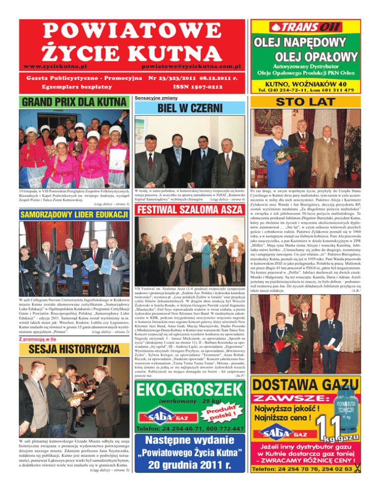 P OWIATO W E ŻYCIE KUTNA www.zyciekutna.pl [email protected] Gazeta Publicystyczno − Promocyjna Egzemplarz bezpłatny GRAND PRIX DLA KUTNA 19 listopada, w VIII Pomorskim Przegl¹dzie Zespo³ów Folklorystycznych, Biesiadnych i Kapel Podwórkowych im. wiêtego Andrzeja, wyst¹pi³ Zespó³ Pieni i Tañca Ziemi Kutnowskiej. (ci¹g dalszy - strona 3) SAMORZĄDOWY LIDER EDUKACJI W auli Collegium Novum Uniwersytetu Jagielloñskiego w Krakowie miasto Kutno zosta³o uhonorowane certyfikatem Samorz¹dowy Lider Edukacji w Ogólnopolskim Konkursie i Programie Certyfikacji Gmin i Powiatów Rzeczpospolitej Polskiej Samorz¹dowy Lider Edukacji - edycja 2011. Samorz¹d Kutna zosta³ wyró¿niony m.in. wród takich miast jak: Wroc³aw, Kraków, Lublin czy Legionowo. Kutno znalaz³o siê równie¿ w gronie 15 gmin uhonorowanych wyró¿nieniem specjalnym Primus. (ci¹g dalszy - strona 2) Z promocj¹ w tle SESJA HISTORYCZNA W sali plenarnej kutnowskiego Urzêdu Miasta odby³a siê sesja historyczna zwi¹zana z promocj¹ wydawnictwa powiêconego dziejom naszego miasta. Zdaniem profesora Jana Szymczaka, redaktora tej publikacji, Kutno jest miastem o podwójnej to¿samoci, poniewa¿ £¹koszyn przez wieki by³ samodzielnym bytem, a dodatkowo równie¿ wiele wsi znalaz³o siê w granicach Kutna. (ci¹g dalszy - strona 5) Nr 23/323/2011 08.12.2011 r. ISSN 1507−0212 Sensacyjne zmiany BIEL W CZERNI W rodê, w samo po³udnie, w kutnowskiej lecznicy rozpoczê³a siê konferencja prasowa. A wszystko za spraw¹ zatrudnienia w NZOZ Kutnowski Szpital Samorz¹dowy wybitnych chirurgów. (ci¹g dalszy - strona 6) FESTIWAL SZALOMA ASZA VII Festiwal im. Szaloma Asza (1-4 grudnia) rozpoczê³o sympozjum naukowe i promocja ksi¹¿ki pt. Szalom Asz. Polskie i ¿ydowskie konteksty twórczoci, wystawa pt. Losy polskich ¯ydów w Izraelu oraz projekcja cyklu filmów dokumentalnych. W drugim dniu atrakcj¹ by³ Wieczór ¯ydowski w hotelu Rondo, w którym Grzegorz Pawlak czyta³ fragmenty Miasteczka; Etel Szyc wprowadza³a widzów w wiat szabatu, a pieni ¿ydowskie prezentowa³ New Klezmer Jazz Band. W niedzielnym zakoñczeniu w KDK, podczas trzygodzinnej uroczystoci wrêczono nagrody w konursie literackim oraz zagrano koncert galowy, który uwietnili New Klezmer Jazz Band, Anna Gadt, Maciej Maciejewski, Studio Piosenki z M³odzie¿owego Domu Kultury w Kutnie oraz warszawski Teatr Tañca Test. Koncert rozpocz¹³ siê od og³oszenia wyników konkursu na opowiadanie. Nagrody otrzymali: I - Janusz Mielczarek, za opowiadanie Sposób na ¿ycie (drukujemy I czêæ na stronie 11), II - Barbara Kresiñska za opowiadanie Jej ogród, III - Andrzej £¹cki, za opowiadanie Zagro¿enie. Wyró¿nienia otrzymali: Grzegorz Przybysz, za opowiadanie Brwinowscy ¯ydzi, Sylwia Krieger, za opowiadanie "Testament", Anna RobakReczek, za opowiadanie Naukrate opowiada. Koncert zakoñczono brawurowym wykonaniem Tzena Tzena Tzena Tzena, Mirona - piosenki, któr¹ uznano za jedn¹ ze stu najlepszych utworów ¿ydowskich wszech czasów. Publicznoæ na stoj¹co domaga³a sie bisów - hit zapiewano jeszcze raz. /Ja.P./ Następne wydanie „Powiatowego Życia Kutna” 20 grudnia 2011 r. STO LAT Po raz drugi, w swym wspólnym ¿yciu, przyby³y do Urzêdu Stanu Cywilnego w Kutnie dwie pary ma³¿eñskie, tym razem w celu uczestniczenia w mi³ej dla nich uroczystoci. Pañstwo Alicja i Kazimierz Zylakowie oraz Wanda i Jan Bierzgalscy, decyzj¹ prezydenta RP, zostali wyró¿nieni medalami Za d³ugoletnie po¿ycie ma³¿eñskie w zwi¹zku z ich jubileuszem 50-lecia po¿ycia ma³¿eñskiego. Te odznaczenia przekaza³ Jubilatom Zbigniew Burzyñski, prezydent Kutna, który po z³o¿eniu im ¿yczeñ i wrêczeniu okolicznociowych dyplomów zaintonowa³ Sto lat, w czym ochoczo wtórowali przybyli gocie i cz³onkowie rodzin. Pañstwo Zylakowie poznali siê w 1960 roku, a w nastêpnym stanêli na lubnym kobiercu. Pani Ala pracowa³a jako nauczycielka, a pan Kazimierz w dziale konstrukcyjnym w ZPR Miflex. Maj¹ syna Marka (¿ona Alicja) i wnuczkê Karolinê. Jubilatka mówi krótko: Umiechamy siê jedno do drugiego, rozumiemy siê i ustêpujemy nawzajem. I to jest w³anie to. Pañstwo Bierzgalscy, mieszkañcy Kutna, poznali siê ju¿ w 1959 roku. Pani Wanda pracowa³a w kutnowskim ZOZ-ie jako pielêgniarka. Polubi³a tê pracê. Ma³¿onek za przez d³ugie 43 lata pracowa³ w PZGS-ie, gdzie by³ magazynierem. Na koniec pracowa³ w Polfie. Jubilaci dochowali siê dwóch córek: Moniki i Ma³gorzaty. S¹ te¿ wnuczêta: Kamila, Daria i Adrian. Je¿eli jestemy na piêædziesiêcioleciu to znaczy, ¿e by³o dobrze podsumowa³ rozmowê pan Jan. Do ¿yczeñ sk³adanych Jubilatom przy³¹cza siê tak¿e nasza redakcja. /A.B./ ¯YCIE KOLOROWE SAMORZĄDOWY LIDER EDUKACJI (ci¹g dalszy ze strony 1) Podczas gali fina³owej miasto reprezentowali: Zbigniew Wdowiak - zastêpca prezydenta miasta Kutno, Mariusz Sikora - przewodnicz¹cy Komisji Edukacji, Kultury, Sportu i Informacji Rady Miasta oraz Jaros³aw Kotliñski - naczelnik Wydzia³u Edukacji, Kultury i Sportu Urzêdu Miasta Kutna. Certyfikat Samorz¹dowy Lider Edukacji jest potwierdzeniem du¿ej aktywnoci miasta Kutna w zakresie budowy i modernizacji obiektów sportowych oraz prowadzonych termomodernizacji obiektów szkolnych. W przypadku wyró¿nienia specjalnego Primus kapitu³a konkursowa wysoko oceni³a realizacjê projektów edukacyjnych finansowanych ze rodków Europejskiego Funduszu Spo³ecznego, tj. Arystoteles w Kutnie, Po pierwsze edukacja, Ludzie mali - doskonali oraz grantów owiatowych na innowacyjne dzia³ania edukacyjne. Przyznane wyró¿nienia w sposób szczególny podkrelaj¹ ró¿norodnoæ dzia³añ samorz¹du miasta Kutna w zapewnieniu coraz lepszych warunków do edukacji dzieci i m³odzie¿y. W konkursie, organizowanym przez Fundacjê Rozwoju Edukacji i Szkolnictwa Wy¿szego, udzia³ wziê³o 170 gmin i powiatów. Patronat honorowy nad konkursem sprawuj¹: przewodnicz¹cy Parlamentu Europejskiego prof. Jerzy