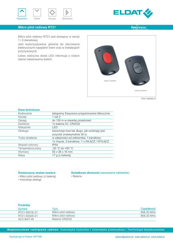 Nadawanie Odbiór Decyzja Sterowanie Mikro pilot radiowy RT21 Mikro pilot radiowy RT21 jest dostępny w wersji 1 i 2-kanałowej. Jest wykorzystywany głównie do sterowania elektrycznymi napędami bram oraz w instalacjach przyzywowych. Łatwo widoczna dioda LED informuje o niskim stanie naładowania baterii. wersja 1-kanałowa wersja 2-kanałowa RT21-500XE-01 Dane techniczne Kodowanie Kanały Zasięg Zasilanie Wskaźniki Obsługa Tryby działania Stopień ochrony Temperatura pracy Wymiary Masa telegramy Easywave programowane fabrycznie 1 lub 2 do 150 m w otwartej przestrzeni 1x bateria 3V, CR2032 LED transmisja trwa tak długo, jak wciśnięty jest przycisk (maksymalnie 36 s) w zależności od odbiornika; 1-kanałowy: 1x Impuls, 2-kanałowy: 1 x WŁĄCZ / WYŁĄCZ IP54 -20 °C do +60 °C 55 x 36 x 16 mm 17 g (z baterią) Dostarczony zestaw zawiera • Mikro pilot radiowy (z baterią) • Instrukcja obsługi Produkty Symbol RT21-5001E-01 RT21-5002E-01 ACC-BAT-05 Dodatkowe akcesoria (zamawiane oddzielnie) • Bateria Opis Mikro pilot radiowy Mikro pilot radiowy Bateria CR2032 Częstotliwość 868,30 MHz 868,30 MHz Bezprzewodowe rozwiązania radiowe: Automatyka budynków | Automatyka przemysłowa | Technologia bezpieczeństwa Dystrybucja w Polsce: APTOM [email protected] www.aptom.pl www.eldat.pl