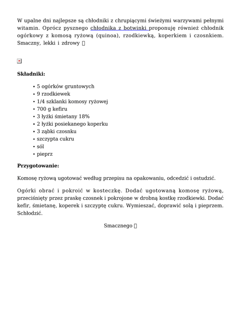W upalne dni najlepsze są chłodniki z chrupiącymi świeżymi warzywami pełnymi witamin. Oprócz pysznego chłodnika z botwinki proponuję również chłodnik ogórkowy z komosą ryżową (quinoa), rzodkiewką, koperkiem i czosnkiem. Smaczny, lekki i zdrowy Składniki: 5 ogórków gruntowych 9 rzodkiewek 1/4 szklanki komosy ryżowej 700 g kefiru 3 łyżki śmietany 18% 2 łyżki posiekanego koperku 3 ząbki czosnku szczypta cukru sól pieprz Przygotowanie: Komosę ryżową ugotować według przepisu na opakowaniu, odcedzić i ostudzić. Ogórki obrać i pokroić w kosteczkę. Dodać ugotowaną komosę ryżową, przeciśnięty przez praskę czosnek i pokrojone w drobną kostkę rzodkiewki. Dodać kefir, śmietanę, koperek i szczyptę cukru. Wymieszać, doprawić solą i pieprzem. Schłodzić. Smacznego