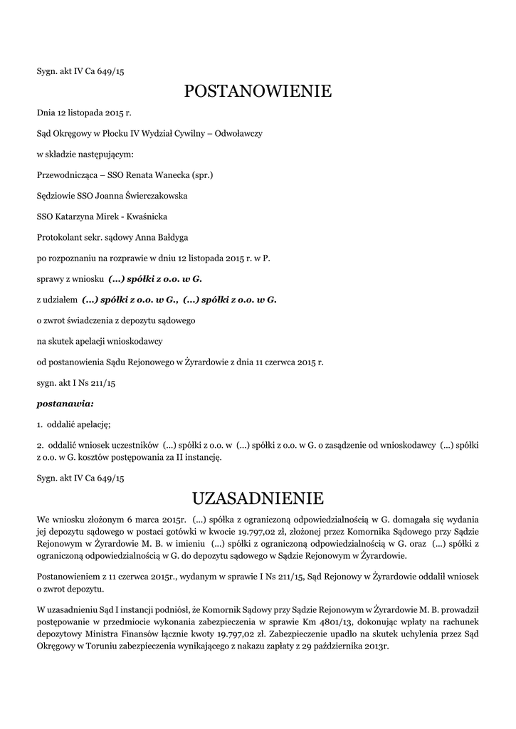 Sygn. akt IV Ca 649/15 POSTANOWIENIE Dnia 12 listopada 2015 r. Sąd Okręgowy w Płocku IV Wydział Cywilny – Odwoławczy w składzie następującym: Przewodnicząca – SSO Renata Wanecka (spr.) Sędziowie SSO Joanna Świerczakowska SSO Katarzyna Mirek - Kwaśnicka Protokolant sekr. sądowy Anna Bałdyga po rozpoznaniu na rozprawie w dniu 12 listopada 2015 r. w P. sprawy z wniosku (...) spółki z o.o. w G. z udziałem (...) spółki z o.o. w G., (...) spółki z o.o. w G. o zwrot świadczenia z depozytu sądowego na skutek apelacji wnioskodawcy od postanowienia Sądu Rejonowego w Żyrardowie z dnia 11 czerwca 2015 r. sygn. akt I Ns 211/15 postanawia: 1. oddalić apelację; 2. oddalić wniosek uczestników (...) spółki z o.o. w (...) spółki z o.o. w G. o zasądzenie od wnioskodawcy (...) spółki z o.o. w G. kosztów postępowania za II instancję. Sygn. akt IV Ca 649/15 UZASADNIENIE We wniosku złożonym 6 marca 2015r. (...) spółka z ograniczoną odpowiedzialnością w G. domagała się wydania jej depozytu sądowego w postaci gotówki w kwocie 19.797,02 zł, złożonej przez Komornika Sądowego przy Sądzie Rejonowym w Żyrardowie M. B. w imieniu (...) spółki z ograniczoną odpowiedzialnością w G. oraz (...) spółki z ograniczoną odpowiedzialnością w G. do depozytu sądowego w Sądzie Rejonowym w Żyrardowie. Postanowieniem z 11 czerwca 2015r., wydanym w sprawie I Ns 211/15, Sąd Rejonowy w Żyrardowie oddalił wniosek o zwrot depozytu. W uzasadnieniu Sąd I instancji podniósł, że Komornik Sądowy przy Sądzie Rejonowym w Żyrardowie M. B. prowadził postępowanie w przedmiocie wykonania zabezpieczenia w sprawie Km 4801/13, dokonując wpłaty na rachunek depozytowy Ministra Finansów łącznie kwoty 19.797,02 zł. Zabezpieczenie upadło na skutek uchylenia przez Sąd Okręgowy w Toruniu zabezpieczenia wynikającego z nakazu zapłaty z 29 października 2013r. Oddalając wniosek, Sąd Rejonowy wskazał, że zgodnie z treścią art. 69311 § 1 kpc na żądanie dłużnika sąd zwróci mu depozyt, jeżeli wierzyciel nie zażądał wydania depozytu. Przepis ten stanowi konsekwencję złożenia przedmiotu do depozytu sądowego na podstawie zezwolenia sądu udzielonego na podstawie art. 6932 kpc. Oznacza to, że zwrot depozytu sądowego w oparciu o przepis art. 69311 § 1 kpc może nastąpić w sytuacji, gdy zostało wydane postanowienie zezwalające na złożenie przedmiotu świadczenia do depozytu. W niniejszej sprawie obowiązany zwrócił się o zwrot zdeponowanej kwoty 19.797,02 zł, która stanowi sumę środków zabezpieczonych przez Komornika Sądowego przy Sądzie Rejonowym w Żyrardowie M. B. w ramach postępowania zabezpieczającego toczącego się pod sygn. akt Km 4801/13 - na podstawie nakazu zapłaty wydanego w postępowaniu nakazowym w dniu 29 października 2013r. sygn. akt VI GNc 437/13. Zdaniem Sądu Rejonowego oznacza to, że dysponentem zdeponowanych środków nie jest Sąd, a komornik sądowy. To organ prowadzący postępowanie zabezpieczające władny jest ocenić, czy istnieje podstawa do zwrotu na rzecz obowiązanego zdeponowanych sum pieniężnych. Na marginesie Sąd podkreślił, że w ramach postępowania zabezpieczającego Komornik w dniu 30 grudnia 2013r. zwrócił się do tut. Sądu o zwrot z sumy zdeponowanej w dniu 14 listopada 2013r. kwoty 1.722,19 zł. Ta okoliczność zdaniem Sądu przesądza o tym, że to Komornik jest władny dysponować kwotą znajdującą się aktualnie w depozycie, mając zaś wiedzę o upadku zabezpieczenia, zwróci się do Sądu o zwrot środków pozostających w depozycie celem przekazania ich obowiązanemu. Apelację na postanowienie złożył wnioskodawca, zaskarżając je w całości i zarzucił obrazę art. 96311 § 1 kpc poprzez jego niezastosowanie, a w konsekwencji niewydanie dłużnikowi depozytu sądowego na jego żądanie, w sytuacji gdy Sąd Rejonowy w Żyrardowie, jako faktyczny dysponent zdeponowanych środków, ma obowiązek wydania tychże środków na żądanie złożone przez dłużnika. Mając powyższe na uwadze, wnioskodawca wniósł o zmianę zaskarżonego postanowienia poprzez zezwolenie na wydanie (...) spółce z o.o. w G. środków zdeponowanych przez Komornika Sądowego przy Sądzie Rejonowym w Żyrardowie na rachunku depozytowym Ministra Finansów oraz o zasadzenie od uczestników na rzecz wnioskodawcy zwrotu kosztów postępowania za obie instancje, ewentualnie o uchylenie zaskarżonego postanowienia i przekazanie sprawy do ponownego rozpoznania Sądowi I instancji. Sąd Okręgowy zważył, co następuje: Apelacja jest niezasadna. Sąd Rejonowy prawidłowo uznał, że art. 69311 kpc nie znajduje w niniejszej sprawie zastosowania. Zgodnie z treścią § 1 tegoż artykułu, na żądanie dłużnika sąd zwróci mu depozyt, jeżeli wierzyciel nie zażądał wydania depozytu. Przepis ten odnosi się do sytuacji, gdy wierzyciel nie zażądał zwrotu świadczenia złożonego do depozytu sądowego, pomimo ziszczenia się warunków uprawniających go do złożenia takiego wniosku. Słusznie Sąd I instancji stwierdził, że wnioskodawca mógłby domagać się zwrotu depozytu w tym trybie tylko wówczas, gdyby wcześniej w postepowaniu o złożenie do depozytu sądowego uzyskał zezwolenie Sądu na podstawie art. 692 – 6932 kpc. W postępowaniu zabezpieczającym lub egzekucyjnym również mówi się o złożeniu do depozytu sądowego pieniędzy (kwoty, sumy, należności, dochodu), dokumentów, rzeczy. Regulacja zawarta w Kodeksie postępowania cywilnego w dziale V Sprawy depozytowe, odnosi się do instytucji prawa materialnego, rodzącej skutki materialnoprawne, podczas gdy oparte na art. 752 kpc złożenie pieniędzy i papierów wartościowych do depozytu, zajętych wskutek zabezpieczenia roszczenia pieniężnego, jest instytucją procesową mającą na celu tylko zabezpieczenie tego roszczenia. Zgodnie z art. 492 § 1 kpc nakaz zapłaty z chwilą wydania stanowi tytuł zabezpieczenia, wykonaln