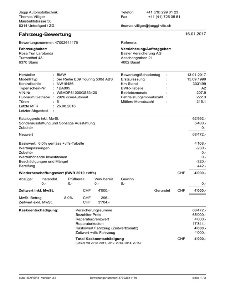 Jäggi Automobiltechnik Thomas Villiger Maisbühlstrasse 50 6314 Unterägeri / ZG Telefon Fax +41 (79) 299 01 23 +41 (41) 725 05 51 [email protected] 16.01.2017 Fahrzeug-Bewertung Bewertungsnummer: 47002641176 Referenz: Fahrzeughalter: Rosa Turi Larotonda Turmatthof 43 6370 Stans Versicherung/Auftraggeber: Basler Versicherung AG Aeschengraben 21 4002 Basel Hersteller Modell/Typ Kontrollschild Typenschein-Nr. VIN-Nr. Hubraum/Getriebe Türen Letzte MFK Letzter Abgastest : : : : : : : : : BMW 5er Reihe E39 Touring 530d ABS NW15486 1BA895 WBADP81000GS83420 2926 ccm/Automat 5 26.08.2016 Bewertung/Schadentag Erstzulassung Km-Stand BWR-Tabelle Betriebsmonate Fahrleistungsmonatszahl Mittlere Monatszahl : : : : : : : 13.01.2017 15.09.1999 333'499 A2 207.9 222.3 215.1 Katalogpreis inkl. MwSt. Sonderausstattung und Sonstige Ausstattung Zubehör 62'992.5'480.0.- Neuwert 68'472.- Basiswert: 6.0% gemäss +vffs-Tabelle Wertanpassungen Zubehör Werterhöhende Investitionen Beschädigungen und Mängel Bereifung 4'108.-230.0.0.-320.442.- Wiederbeschaffungswert (BWR 2010 +vffs) Abzüge: Instandst. 0.- Prüfbereit. 0.- Zeitwert inkl. MwSt. MwSt. Betrag Zeitwert exkl. MwSt. Kaskoentschädigung: 8.0% CHF Verk.bereit. 0.- CHF 4'000.- CHF CHF 296.3'704.- Gewinn 0.- 0.Gerundet CHF Versicherungssumme Bezahlter Preis Reparaturgrenzwert Reparaturkosten Kaskowert Fahrzeug (Zeitwertzusatz) Zeitwert +vffs Fahrzeug Total Kaskoentschädigung 4'000.- 4'000.- 68'472.65'000.4'000.17'844.4'000.4'000.CHF 4'000.- (Basler VB 2010, 2011, 2012, 2013, 2014, 2015) auto-i EXPERT Version 3.8 Bewertungsnummer: 47002641176 Seite 1 / 2 Jäggi Automobiltechnik Thomas Villiger Maisbühlstrasse 50 6314 Unterägeri / ZG Telefon Fax +41 (79) 299 01 23 +41 (41) 725 05 51 [email protected] 16.01.2017 Details zur Fahrzeug-Bewertung Serienausstattung Elektronische Wegfahrsperre, Fernbedienung für Zentralverriegelung, Fensterheber elektrisch hinten, Aussenspiegel elektrisch verstellbar und heizbar, Nebelscheinwerfer vorne, Leichtmetallfelgen, Antiblockiersystem ABS, Servolenkung, Automatische Stabilitäts-Control + Traktion, Klimaanlage inkl. Mikrofilter, Beifahrer-Airbag, Fahrer und Beifahrer-Airbag, Seitenairbag für Fahrer und Beifahrer, ITS-Kopfairbag, Lederlenkrad mit Airbag, Stoff Flachgewebe, Bordcomputer V, Bordcomputer inkl. Check-Control mit Piktogrammanzeige, Radio/Tonband BMW Business RDS, Keine Gewähr auf die Angaben der Serienausstattungen Sonderaustattung und Sonstige Ausstattung Neupreis Geschwindigkeitsregelung Park Distance Control PDC Dachreling Metallic-Lackierung Klimaautomatik inkl. Mikrofilter Edelholzausführung Nussbaumwurzel Sitzheizung für Fahrer und Beifahrer 680.640.450.1'090.1'310.710.600.- Wertanpassungen Marktlage Rundung Beschädigungen und Mängel 5'480.- Prozent Betrag -0.3 -205.-25.- Total -230.- Typ Kosten Wert O 2'000.- -320.- Total 2'000.- -320.- Anzahl Pr.-Tiefe Pr.-Norm Neupreis 2 2 6.9 7.1 8.5 8.5 306.306.- Durchschnittliche Profiltiefe: 78.3% Total 612.- Anrostungen an der Heckklappe und am Bereifung Bridgestone 225/55 R 16 95 H LM 32* TL Bridgestone 225/55 R 16 95 H LM 32* TL auto-i EXPERT Version 3.8 Total Bewertungsnummer: 47002641176 Wert 442.- Seite 2 / 2