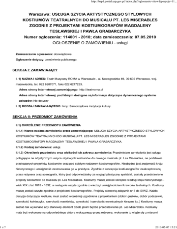 1z7 http://bzp1.portal.uzp.gov.pl/index.php?ogloszenie=show&pozycja=11... Warszawa: USŁUGA SZYCIA ARTYSTYCZNEGO STYLOWYCH KOSTIUMÓW TEATRALNYCH DO MUSICALU PT. LES MISERABLES ZGODNIE Z PROJEKTAMI KOSTIUMOGRAFÓW MAGDALENY TESŁAWSKIEJ I PAWŁA GRABARCZYKA Numer ogłoszenia: 114001 - 2010; data zamieszczenia: 07.05.2010 OGŁOSZENIE O ZAMÓWIENIU - usługi Zamieszczanie ogłoszenia: obowiązkowe. Ogłoszenie dotyczy: zamówienia publicznego. SEKCJA I: ZAMAWIAJĄCY I. 1) NAZWA I ADRES: Teatr Muzyczny ROMA w Warszawie , ul. Nowogrodzka 49, 00-695 Warszawa, woj. mazowieckie, tel. 022 6287071, faks 022 6217233. Adres strony internetowej zamawiającego: http://teatrroma.pl Adres strony internetowej, pod którym dostępne są informacje dotyczące dynamicznego systemu zakupów: Nie dotyczy I. 2) RODZAJ ZAMAWIAJĄCEGO: Inny: Samorządowa instytucja kultury. SEKCJA II: PRZEDMIOT ZAMÓWIENIA II.1) OKREŚLENIE PRZEDMIOTU ZAMÓWIENIA II.1.1) Nazwa nadana zamówieniu przez zamawiającego: USŁUGA SZYCIA ARTYSTYCZNEGO STYLOWYCH KOSTIUMÓW TEATRALNYCH DO MUSICALU PT. LES MISERABLES ZGODNIE Z PROJEKTAMI KOSTIUMOGRAFÓW MAGDALENY TESŁAWSKIEJ I PAWŁA GRABARCZYKA. II.1.2) Rodzaj zamówienia: usługi. II.1.3) Określenie przedmiotu oraz wielkości lub zakresu zamówienia: Przedmiotem zamówienia jest usługa polegająca na artystycznym uszyciu stylowych kostiumów do nowego musicalu pt. Les Miserables, na podstawie przekazanych projektów kostiumów oraz pod ścisłym nadzorem kostiumografów. Niezbędna jest znajomość kroju historycznego i umiejętność zastosowania go w praktyce. Zgodnie z koncepcja kostiumografów zaakceptowaną przez reżysera oraz scenografa, który jest odpowiedzialny za wygląd plastyczny spektaklu zostały przedstawione projekty kostiumów do musicalu pt. Les Miserables. Kostiumy muszą zostać skrojone według kroju historycznego wiek XIX z lat 1815 - 1832, a następnie uszyte zgodnie z wiedzą i umiejętnościami krawców teatralnych. Kostiumy muszą zostać uszyte zgodnie z projektami kostiumografów. Projekty stanowią załącznik nr 8 do SIWZ. Każda decyzja dotycząca kostiumu musi zostać wcześniej uzgodniona z projektantem (dobór guzików, dobór podszewki, szerokość kołnierzyka, szerokość mankietów, wysokość i szerokość ewentualnych kieszeni itp.) Kostiumy muszą zostać tak wykonane aby stanowiły element dzieła jakim będzie przedstawienie pt. Les Miserables. Kostiumy maja być wykonane na odpowiedniego aktora wskazanego przez reżysera, wykonanie to wiąże się z miarami 2010-05-07 15:21 2z7 http://bzp1.portal.uzp.gov.pl/index.php?ogloszenie=show&pozycja=11... mającymi na celu odpowiednie dopasowanie kostiumów oraz ustalenia szczegółów z kostiumografami, dlatego każda miara aktorów musi się odbywać w obecności projektantów, co również wiąże się z poprawianiem jednego kostiumu kilka razy aż do uzyskania żądanego efektu wymaganego przez kostiumografów. Kostiumy będą uszyte z wcześniej preparowanych malarsko tkanin i dopiero potem dobrane do każdego aktora jak również do każdego projektu. Tkaniny które będą używane do uszycia kostiumów to głównie tkaniny lniane, wełniane, jedwabne oraz bawełniane. Przed przystąpieniem do realizacji usługi każdy kostium zostanie dokładnie omówiony z kostiumografami z dokładnym określeniem tkanin do danego projektu. Kostiumy zostaną uszyte z powierzonego materiału, który należy rozliczyć poprzez wypełnienie kart kalkulacyjnych. W scenach zespołowych kostiumy różnią się od siebie, kolorem tkaniny, fakturą na tkaninie, długością spodni, spódnic, wykończeniem elementu kostiumu. Dla każdego aktora biorącego udział w scenie zespołowej zostanie dokładnie określona dla niego forma kostiumu przez kostiumografa na podstawie podstawowego projektu. Zamawiający jest uprawniony do zamówienia mniejszej ilości usług niż wyszczególnione w opisie przedmiotu zamówienia, przy jednoczesnym zachowaniu cen jednostkowych z oferty Wykonawcy. Zamówienie składa się z dwóch Zadań (części). II.1.4) Czy przewiduje się udzielenie zamówień uzupełniających: tak. Określenie przedmiotu oraz wielkości lub zakresu zamówień uzupełniających Zamawiający przewiduje udzielanie zamówień uzupełniających w wysokości do 20% wartości zamówienia podstawowego. Zamówienie uzupełniające zostanie udzielone w przypadku zmiany w obsadzie dokonanej przez reżysera spektaklu lub spowodowanej czynnikami niemożliwymi do przewidzenia np. rezygnacją artysty. Podczas prób reżyserskich na scenie może się okazać iż w danej scenie np. Gospodarstwo jest zbyt mała ilość osób. Reżyser, w ramach swobody twórczej, może doangażować do konkretnej sceny kolejne osoby. Zwiększenie lub zmiana obsady może wiązać się z koniecznością doszycia nowych kompletów kostiumów II.1.5) Wspólny Słownik Zamówień (CPV): 92.31.20.00-1, 98.39.30.00-4. II.1.6) Czy dopuszcza się złożenie oferty częściowej: tak, liczba części: 2. II.1.7) Czy dopuszcza się złożenie oferty wariantowej: nie. II.2) CZAS TRWANIA ZAMÓWIENIA LUB TERMIN WYKONANIA: Zakończenie: 02.08.2010. SEKCJA III: INFORMACJE O CHARAKTERZE PRAWNYM, EKONOMICZNYM, FINANSOWYM I TECHNICZNYM III.1) WADIUM Informacja na temat wadium: Nie dotyczy III.2) ZALICZKI Czy przewiduje się udzielenie zaliczek na poczet wykonania zamówienia: nie III.3) WARUNKI UDZIAŁU W POSTĘPOWANIU ORAZ OPIS SPOSOBU DOKONYWANIA OCENY SPEŁNIANIA TYCH WARUNKÓW III.3.2) Wiedza i doświadczenie Opis sposobu dokonywania oceny spełniania tego warunku 2010-05-07 15:21 3z7 http://bzp1.portal.uzp.gov.pl/index.php?ogloszenie=show&pozycja=11... 1. O udzielenie zamówienia mogą ubiegać się Wykonawcy, którzy spełniają warunki, dotyczące: a) posiadania uprawnień do wykonywania określonej działalności lub czynności, jeżeli przepisy prawa nakładają obowiązek ich posiadania; b) posiadania wiedzy i doświadczenia; c) dysponowania odpowiedn