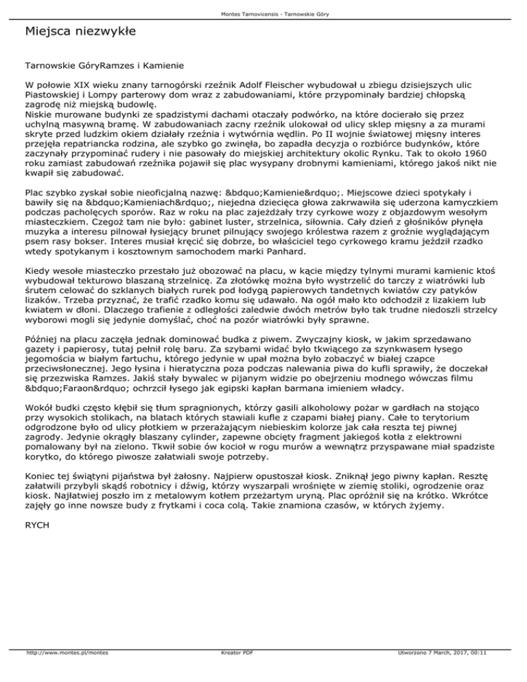 Montes Tarnovicensis - Tarnowskie Góry Miejsca niezwykłe Tarnowskie GóryRamzes i Kamienie W połowie XIX wieku znany tarnogórski rzeźnik Adolf Fleischer wybudował u zbiegu dzisiejszych ulic Piastowskiej i Lompy parterowy dom wraz z zabudowaniami, które przypominały bardziej chłopską zagrodę niż miejską budowlę. Niskie murowane budynki ze spadzistymi dachami otaczały podwórko, na które docierało się przez uchylną masywną bramę. W zabudowaniach zacny rzeźnik ulokował od ulicy sklep mięsny a za murami skryte przed ludzkim okiem działały rzeźnia i wytwórnia wędlin. Po II wojnie światowej mięsny interes przejęła repatriancka rodzina, ale szybko go zwinęła, bo zapadła decyzja o rozbiórce budynków, które zaczynały przypominać rudery i nie pasowały do miejskiej architektury okolic Rynku. Tak to około 1960 roku zamiast zabudowań rzeźnika pojawił się plac wysypany drobnymi kamieniami, którego jakoś nikt nie kwapił się zabudować. Plac szybko zyskał sobie nieoficjalną nazwę: „Kamienie”. Miejscowe dzieci spotykały i bawiły się na „Kamieniach”, niejedna dziecięca głowa zakrwawiła się uderzona kamyczkiem podczas pacholęcych sporów. Raz w roku na plac zajeżdżały trzy cyrkowe wozy z objazdowym wesołym miasteczkiem. Czegoż tam nie było: gabinet luster, strzelnica, siłownia. Cały dzień z głośników płynęła muzyka a interesu pilnował łysiejący brunet pilnujący swojego królestwa razem z groźnie wyglądającym psem rasy bokser. Interes musiał kręcić się dobrze, bo właściciel tego cyrkowego kramu jeździł rzadko wtedy spotykanym i kosztownym samochodem marki Panhard. Kiedy wesołe miasteczko przestało już obozować na placu, w kącie między tylnymi murami kamienic ktoś wybudował tekturowo blaszaną strzelnicę. Za złotówkę można było wystrzelić do tarczy z wiatrówki lub śrutem celować do szklanych białych rurek pod łodygą papierowych tandetnych kwiatów czy patyków lizaków. Trzeba przyznać, że trafić rzadko komu się udawało. Na ogół mało kto odchodził z lizakiem lub kwiatem w dłoni. Dlaczego trafienie z odległości zaledwie dwóch metrów było tak trudne niedoszli strzelcy wyborowi mogli się jedynie domyślać, choć na pozór wiatrówki były sprawne. Później na placu zaczęła jednak dominować budka z piwem. Zwyczajny kiosk, w jakim sprzedawano gazety i papierosy, tutaj pełnił rolę baru. Za szybami widać było tkwiącego za szynkwasem łysego jegomościa w białym fartuchu, którego jedynie w upał można było zobaczyć w białej czapce przeciwsłonecznej. Jego łysina i hieratyczna poza podczas nalewania piwa do kufli sprawiły, że doczekał się przezwiska Ramzes. Jakiś stały bywalec w pijanym widzie po obejrzeniu modnego wówczas filmu „Faraon” ochrzcił łysego jak egipski kapłan barmana imieniem władcy. Wokół budki często kłębił się tłum spragnionych, którzy gasili alkoholowy pożar w gardłach na stojąco przy wysokich stolikach, na blatach których stawiali kufle z czapami białej piany. Całe to terytorium odgrodzone było od ulicy płotkiem w przerażającym niebieskim kolorze jak cała reszta tej piwnej zagrody. Jedynie okrągły blaszany cylinder, zapewne obcięty fragment jakiegoś kotła z elektrowni pomalowany był na zielono. Tkwił sobie ów kocioł w rogu murów a wewnątrz przyspawane miał spadziste korytko, do którego piwosze załatwiali swoje potrzeby. Koniec tej świątyni pijaństwa był żałosny. Najpierw opustoszał kiosk. Zniknął jego piwny kapłan. Resztę załatwili przybyli skądś robotnicy i dźwig, którzy wyszarpali wrośnięte w ziemię stoliki, ogrodzenie oraz kiosk. Najłatwiej poszło im z metalowym kotłem przeżartym uryną. Plac opróżnił się na krótko. Wkrótce zajęły go inne nowsze budy z frytkami i coca colą. Takie znamiona czasów, w których żyjemy. RYCH http://www.montes.pl/montes Kreator PDF Utworzono 7 March, 2017, 00:11